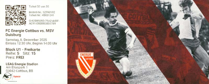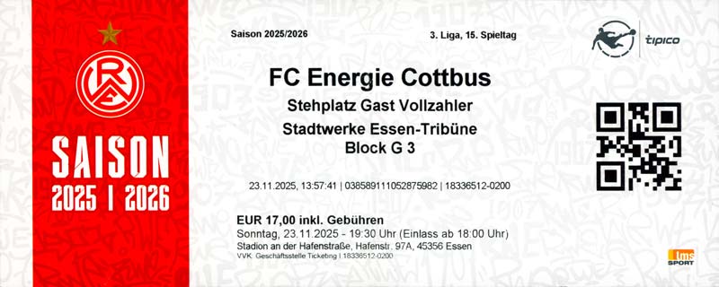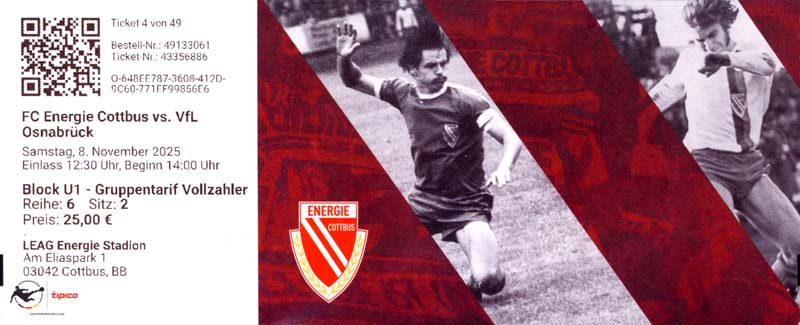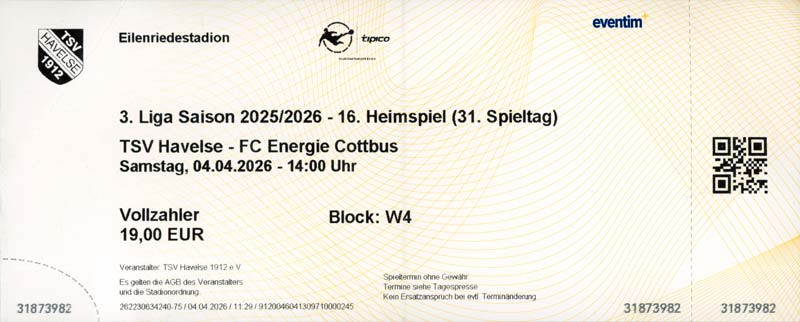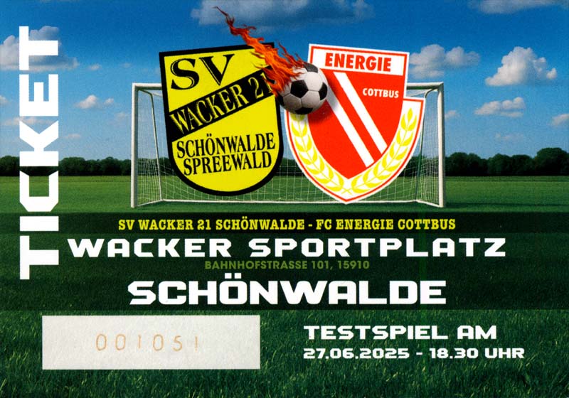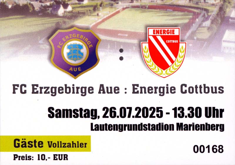 Eintrittskarten der 1. Mannschaft 27.06.2025, SV Wacker 21 Schönwalde (A)28.06.2025, SpVgg Finsterwalde (A)29.06.2025, DJK Blau-Weiß Wittichenau (A)04.07.2025, VSG Altglienicke (H)05.07.2025, TSG Neustrelitz (N)08.07.2025, BSV Eintracht Mahlsdorf (A)18.07.2025, SV Ried (A)19.07.2025, FC Hertha Wels (A)26.07.2025, FC Erzgebirge Aue (N)08.08.2025, 1. FC Schweinfurt 05 (A)16.08.2025, Hannover 96 (H)23.08.2025, TSG 1899 Hoffenheim II (A)03.09.2025, 1. FC Lokomotive Leipzig (A)05.09.2025, SV Germania 90 Schöneiche (H)14.09.2025, SV Waldhof Mannheim 07 (A)17.09.2025, FC Erzgebirge Aue (H)21.09.2025, SC Verl 1924 (A)26.09.2025, VfB Stuttgart 1893 II (H)30.09.2025, F.C. Hansa Rostock (A)04.10.2025, TSV Alemannia Aachen (H)11.10.2025, FC Strausberg (A)19.10.2025, SSV Ulm 1846 Fußball (A)25.10.2025, TSV Havelse 1912 (H)28.10.2025, RasenBallsport Leipzig (H)01.11.2025, TSV 1860 München (A)08.11.2025, VfL Osnabrück 1899 (H)23.11.2025, Rot-Weiss Essen (A)29.11.2025, FC Viktoria Köln 1904 (H)06.12.2025, MSV Duisburg (H)13.12.2025, SV Wehen Wiesbaden 1926 (A)20.12.2025, SSV Jahn Regensburg (H)17.01.2026, 1. FC Saarbrücken (A)24.01.2026, 1. FC Schweinfurt 05 (H)31.01.2026, TSG 1899 Hoffenheim II (H)07.02.2026, FC Ingolstadt 04 (A)15.02.2026, SV Waldhof Mannheim 07 (H)21.02.2026, FC Erzgebirge Aue (A)04.03.2026, VfB Stuttgart 1893 II (A)07.03.2026, F.C. Hansa Rostock (H)13.03.2026, TSV Alemannia Aachen (A)21.03.2026, SSV Ulm 1846 Fußball (H)28.03.2026, BSC Preußen 07 Blankenfelde-Mahlow (A)04.04.2026, TSV Havelse 1912 (A)