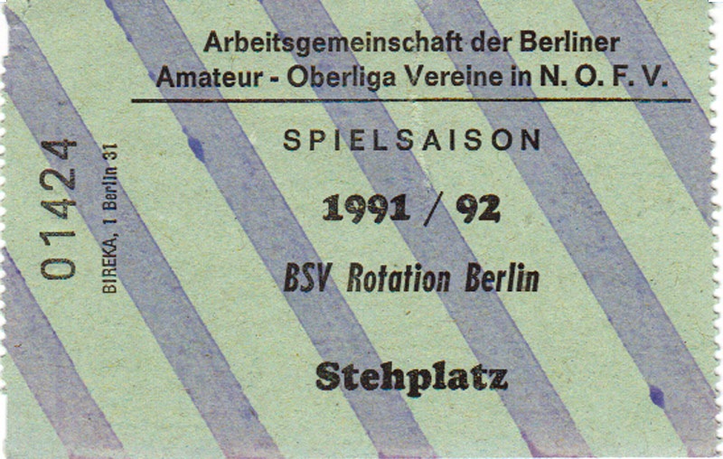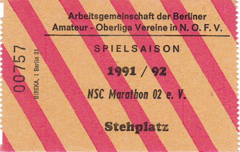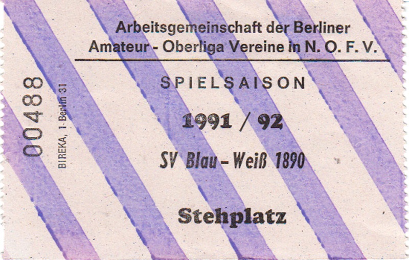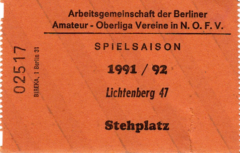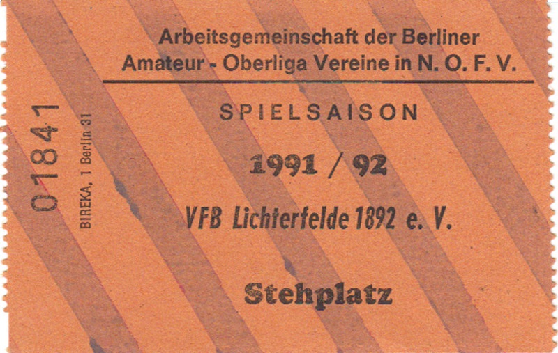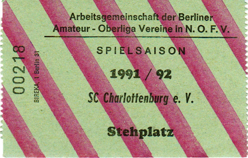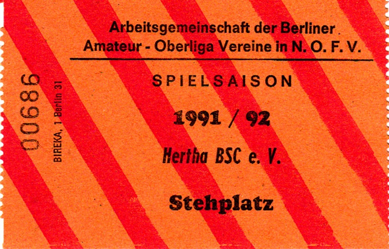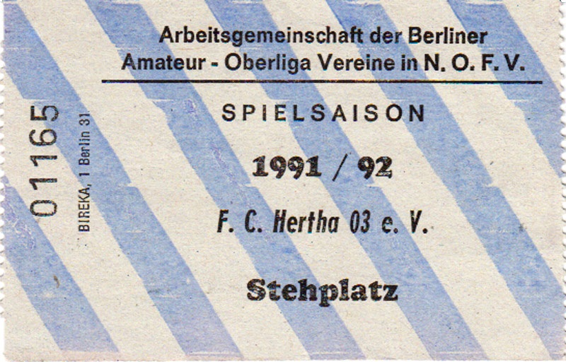 Eintrittskarten der 1. Mannschaft 03.07.1991, Silkeborg IF 1917 (H)06.07.1991, Hammarby IF (H)20.07.1991, ASVŠ Dukla Banská Bystrica (H)30.07.1991, Frankfurter FC Viktoria 91 (H)04.08.1991, SV Lichtenberg 47 (A)10.08.1991, FSV Lok Altmark Stendal (H)17.08.1991, Türkspor Berlin 1965 (A)25.08.1991, Hertha BSC (A.) (H)28.08.1991, FC Anhalt Dessau (A)01.09.1991, BFC Türkiyemspor 1978 (A)08.09.1991, SC Charlottenburg (H)15.09.1991, 1. FC Union Berlin (A)22.09.1991, SV Stahl Thale (H)28.09.1991, 1. FC Magdeburg (A)06.10.1991, SpVgg Blau-Weiß 1890 Berlin (A.) (H)13.10.1991, FSV Glückauf Brieske-Senftenberg (A)27.10.1991, Neuköllner SC Marathon 02 (A)03.11.1991, FV Wannsee (H)10.11.1991, F.C. Hertha 03 Zehlendorf (A)16.11.1991, VfB Lichterfelde 1892 (H)20.11.1991, SC Gatow 1931 (H)24.11.1991, FSV Velten 90 (A)07.12.1991, SV Lichtenberg 47 (H)14.12.1991, FSV Lok Altmark Stendal (A)02.02.1992, BSV Spindlersfeld (H)16.02.1992, Türkspor Berlin 1965 (H)23.02.1992, Hertha BSC (A.) (A)01.03.1992, FC Anhalt Dessau (H)08.03.1992, BFC Türkiyemspor 1978 (H)21.03.1992, 1. FC Union Berlin (H)05.04.1992, 1. FC Magdeburg (H)08.04.1992, SpVgg Blau-Weiß 1890 Berlin (A.) (A)12.04.1992, FSV Glückauf Brieske-Senftenberg (H)17.04.1992, SC Gatow 1931 (A)20.04.1992, Neuköllner SC Marathon 02 (H)26.04.1992, FV Wannsee (A)29.04.1992, ESV Lokomotive Cottbus (A)01.05.1992, SC Charlottenburg (A)03.05.1992, VfB Lichterfelde 1892 (A)06.05.1992, F.C. Hertha 03 Zehlendorf (H)10.05.1992, FSV Velten 90 (H)13.05.1992, SV Thale 04 (A)17.05.1992, BSV Spindlersfeld (A)
