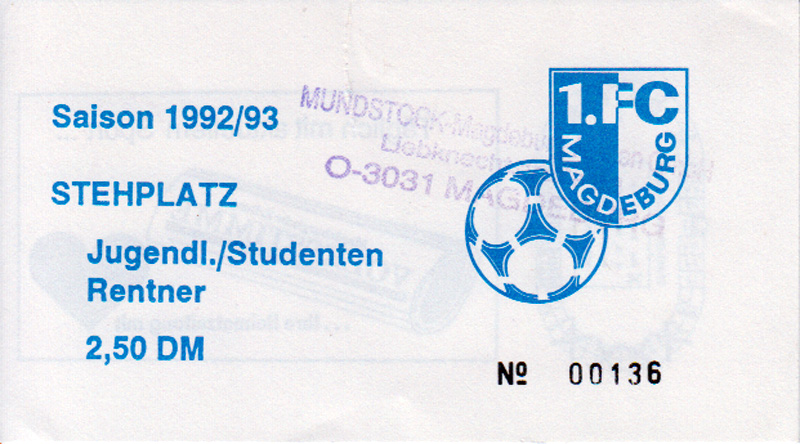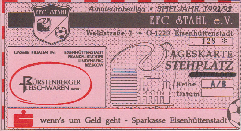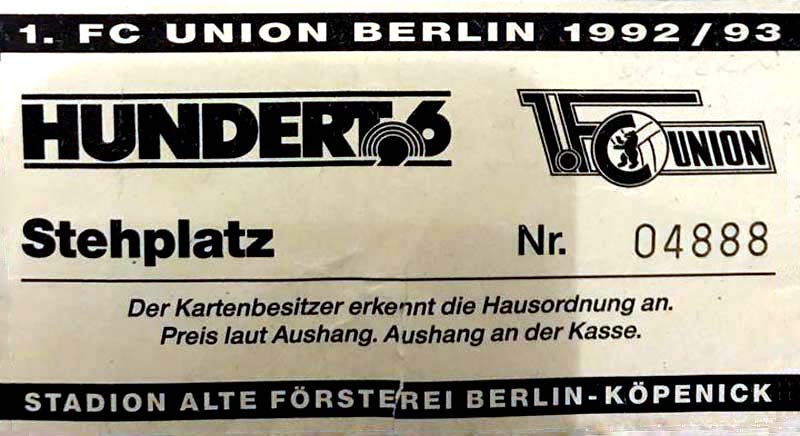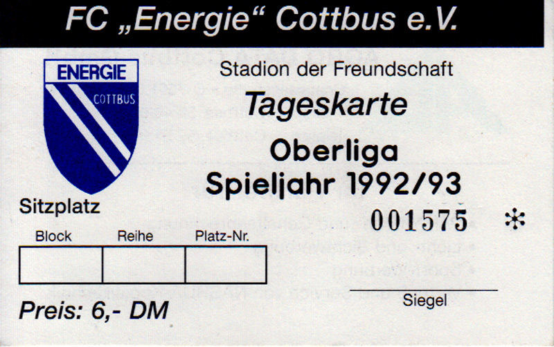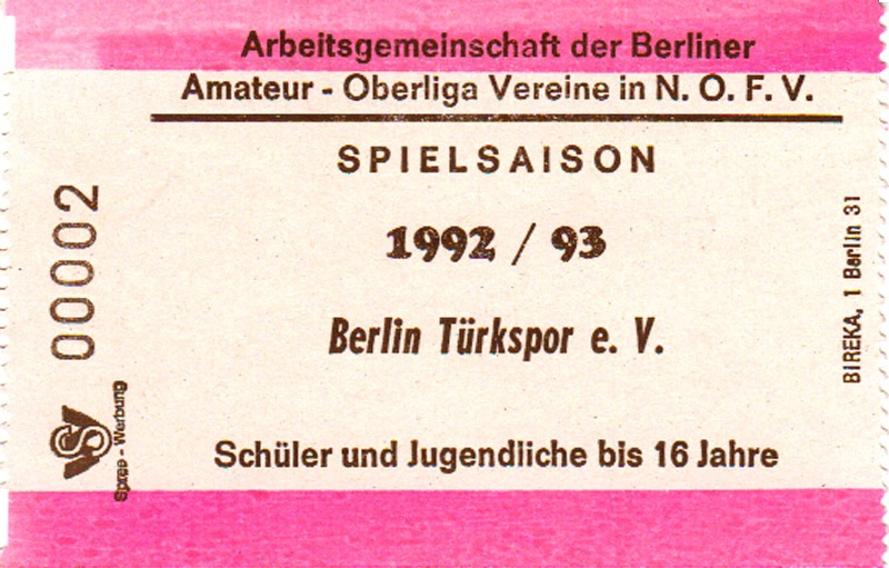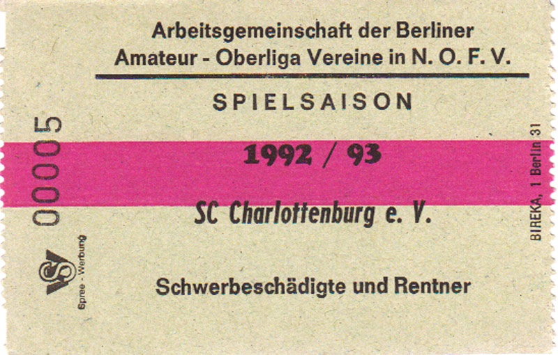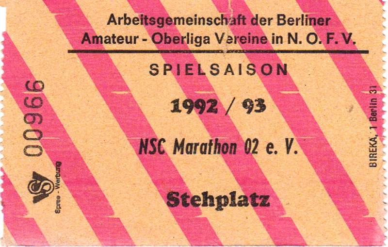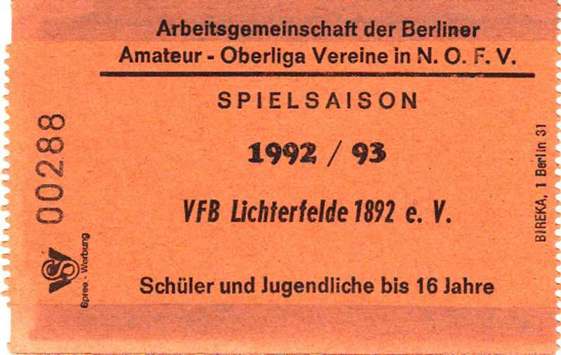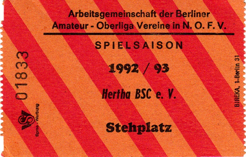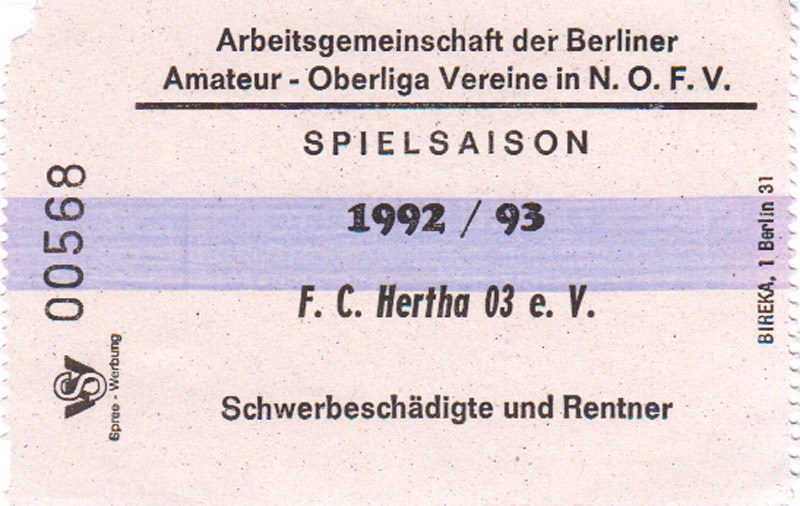 Eintrittskarten der 1. Mannschaft 22.07.1992, Greifswalder SC (A)25.07.1992, Tennis Borussia Berlin (H)02.08.1992, Hertha BSC (A.) (H)09.08.1992, SC Charlottenburg (A)16.08.1992, SV Thale 04 (H)19.08.1992, FSV Glückauf Brieske-Senftenberg (A)23.08.1992, Neuköllner SC Marathon 02 (H)06.09.1992, Türkspor Berlin 1965 (A)13.09.1992, 1. FC Magdeburg (H)20.09.1992, FC Anhalt Dessau (A)04.10.1992, 1. FC Lübars 1962 (A)11.10.1992, VfB Lichterfelde 1892 (H)18.10.1992, FC Einheit 1990 Wernigerode (H)01.11.1992, F.C. Hertha 03 Zehlendorf (A)08.11.1992, BFC Türkiyemspor 1978 (H)14.11.1992, FSV Lok Altmark Stendal (A)21.11.1992, 1. FC Union Berlin (H)29.11.1992, Hallescher FC (A)06.12.1992, Hertha BSC (A.) (A)31.01.1993, SC Charlottenburg (H)14.02.1993, FSV Glückauf Brieske-Senftenberg (H)21.02.1993, Neuköllner SC Marathon 02 (A)07.03.1993, 1. FC Magdeburg (A)14.03.1993, FC Anhalt Dessau (H)28.03.1993, 1. FC Lübars 1962 (H)04.04.1993, VfB Lichterfelde 1892 (A)12.04.1993, FC Einheit 1990 Wernigerode (A)18.04.1993, F.C. Hertha 03 Zehlendorf (H)21.04.1993, Türkspor Berlin 1965 (H)25.04.1993, BFC Türkiyemspor 1978 (A)02.05.1993, FSV Lok Altmark Stendal (H)05.05.1993, FSV Rot-Weiß Prenzlau (A)09.05.1993, 1. FC Union Berlin (A)12.05.1993, Eisenhüttenstädter FC Stahl (A)16.05.1993, Hallescher FC (H)