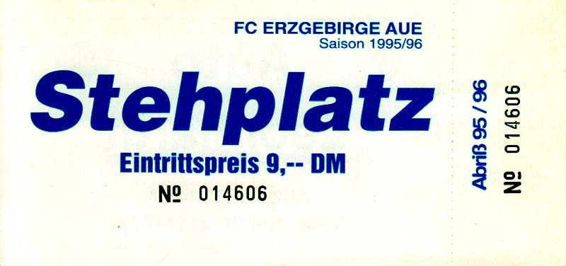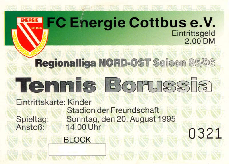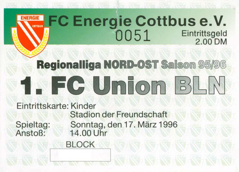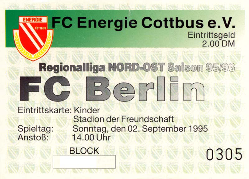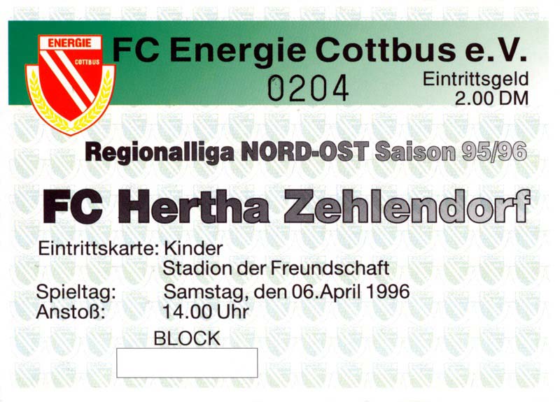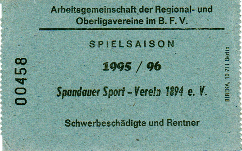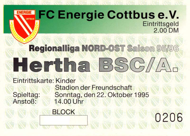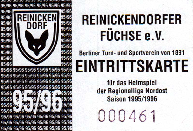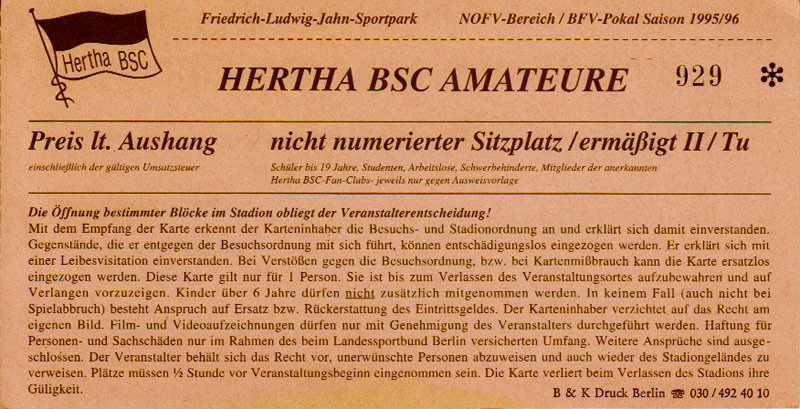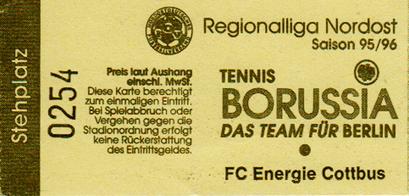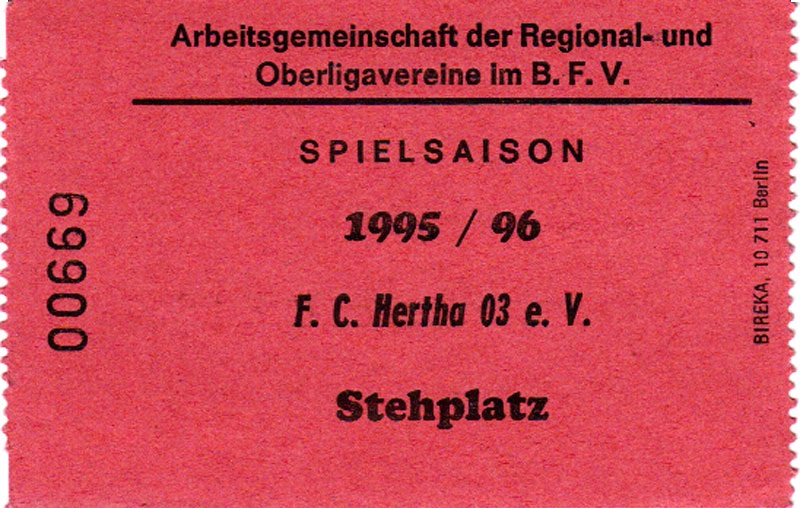 Eintrittskarten der 1. Mannschaft 30.07.1995, FC Erzgebirge Aue (A)06.08.1995, FC Rot-Weiß Erfurt (H)13.08.1995, 1. FC Dynamo Dresden (H)20.08.1995, Tennis Borussia Berlin (H)26.08.1995, SV Meppen 1912 (H)02.09.1995, FC Berlin (H)10.09.1995, 1. FC Union Berlin (A)13.09.1995, FC Sachsen Leipzig (A)17.09.1995, Bischofswerdaer FV 08 (H)23.09.1995, F.C. Hertha 03 Zehlendorf (A)08.10.1995, FSV Wacker 90 Nordhausen (H)14.10.1995, BTSV Reinickendorfer Füchse (A)22.10.1995, Hertha BSC (A.) (H)12.11.1995, FSV Lok Altmark Stendal (H)19.11.1995, Spandauer SV 1894 (A)25.11.1995, FSV Velten 90 (A)03.12.1995, Eisenhüttenstädter FC Stahl (H)10.12.1995, FC Erzgebirge Aue (H)16.12.1995, SV Rot-Weiß 90 Forst (A)03.02.1996, FC Rot-Weiß Erfurt (A)10.02.1996, 1. FC Dynamo Dresden (A)17.03.1996, 1. FC Union Berlin (H)20.03.1996, FC Berlin (A)24.03.1996, Bischofswerdaer FV 08 (A)30.03.1996, Tennis Borussia Berlin (A)04.04.1996, F.C. Hertha 03 Zehlendorf (H)08.04.1996, FSV Optik Rathenow (H)14.04.1996, FSV Wacker 90 Nordhausen (A)17.04.1996, FC Sachsen Leipzig (H)21.04.1996, BTSV Reinickendorfer Füchse (H)27.04.1996, Hertha BSC (A.) (A)04.05.1996, FSV Velten 90 (H)08.05.1996, Eisenhüttenstädter FC Stahl (A)12.05.1996, FSV Lok Altmark Stendal (A)19.05.1996, Spandauer SV 1894 (H)23.05.1996, Eisenhüttenstädter FC Stahl (A)29.05.1996, Frankfurter FC Viktoria 91 (N)