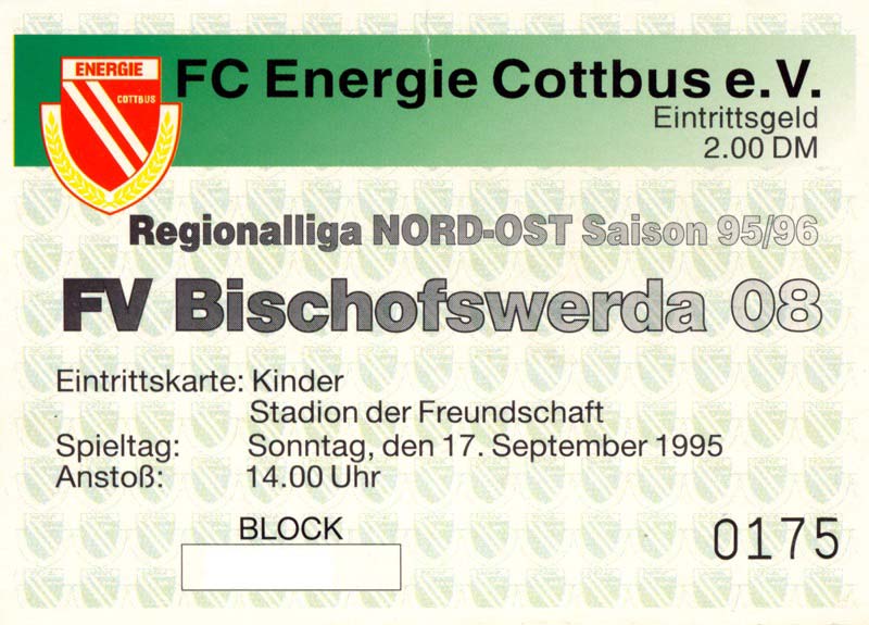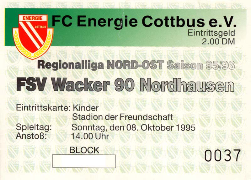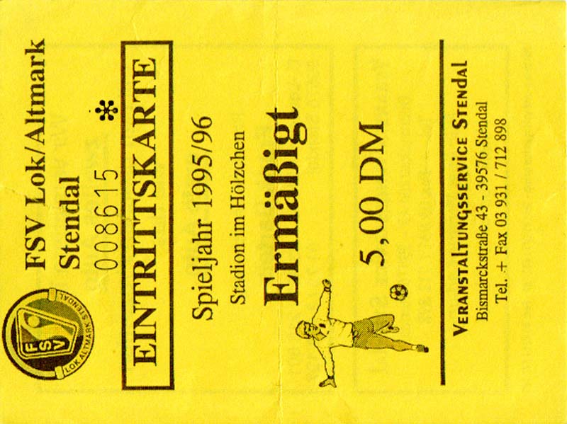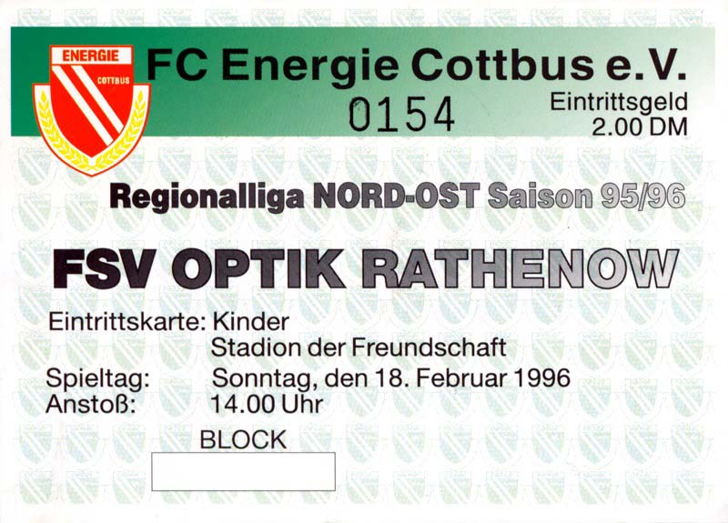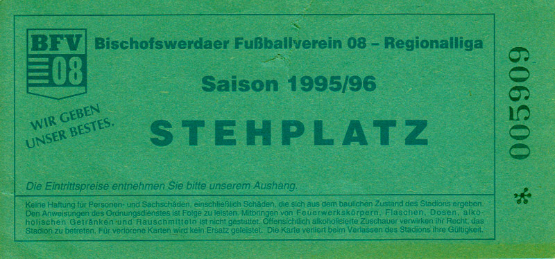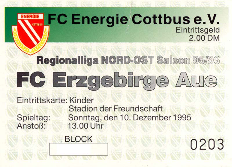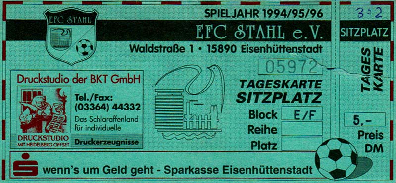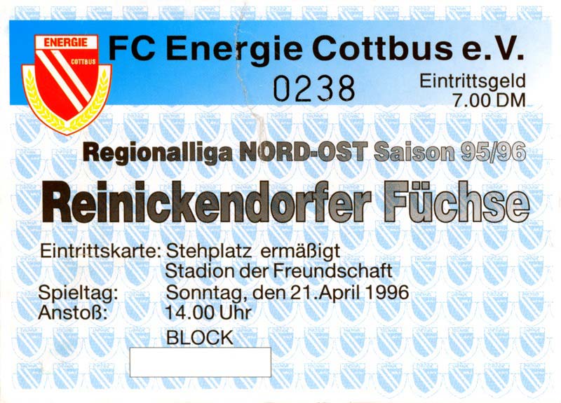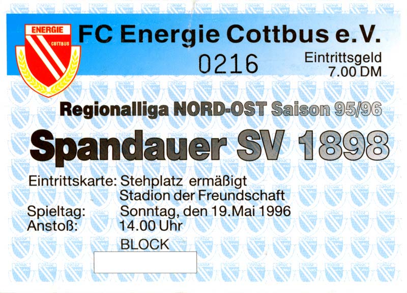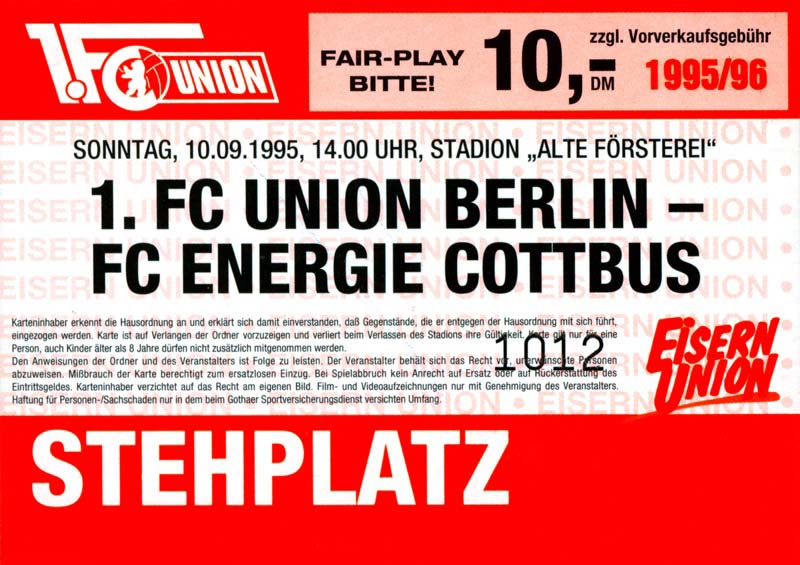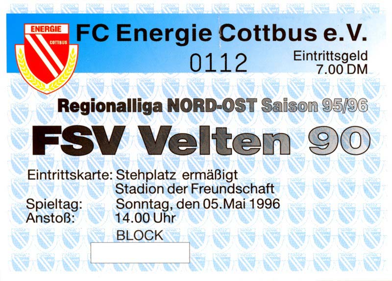 Eintrittskarten der 1. Mannschaft 30.07.1995, FC Erzgebirge Aue (A)06.08.1995, FC Rot-Weiß Erfurt (H)13.08.1995, 1. FC Dynamo Dresden (H)20.08.1995, Tennis Borussia Berlin (H)26.08.1995, SV Meppen 1912 (H)02.09.1995, FC Berlin (H)10.09.1995, 1. FC Union Berlin (A)13.09.1995, FC Sachsen Leipzig (A)17.09.1995, Bischofswerdaer FV 08 (H)23.09.1995, F.C. Hertha 03 Zehlendorf (A)08.10.1995, FSV Wacker 90 Nordhausen (H)14.10.1995, BTSV Reinickendorfer Füchse (A)22.10.1995, Hertha BSC (A.) (H)12.11.1995, FSV Lok Altmark Stendal (H)19.11.1995, Spandauer SV 1894 (A)25.11.1995, FSV Velten 90 (A)03.12.1995, Eisenhüttenstädter FC Stahl (H)10.12.1995, FC Erzgebirge Aue (H)16.12.1995, SV Rot-Weiß 90 Forst (A)03.02.1996, FC Rot-Weiß Erfurt (A)10.02.1996, 1. FC Dynamo Dresden (A)17.03.1996, 1. FC Union Berlin (H)20.03.1996, FC Berlin (A)24.03.1996, Bischofswerdaer FV 08 (A)30.03.1996, Tennis Borussia Berlin (A)04.04.1996, F.C. Hertha 03 Zehlendorf (H)08.04.1996, FSV Optik Rathenow (H)14.04.1996, FSV Wacker 90 Nordhausen (A)17.04.1996, FC Sachsen Leipzig (H)21.04.1996, BTSV Reinickendorfer Füchse (H)27.04.1996, Hertha BSC (A.) (A)04.05.1996, FSV Velten 90 (H)08.05.1996, Eisenhüttenstädter FC Stahl (A)12.05.1996, FSV Lok Altmark Stendal (A)19.05.1996, Spandauer SV 1894 (H)23.05.1996, Eisenhüttenstädter FC Stahl (A)29.05.1996, Frankfurter FC Viktoria 91 (N)