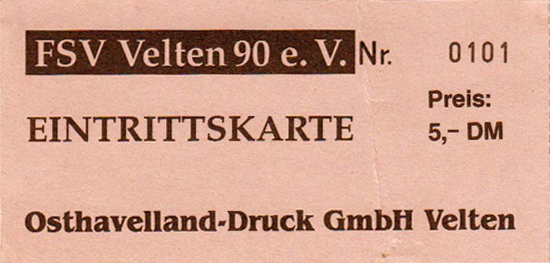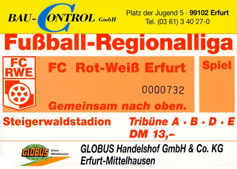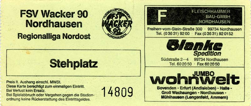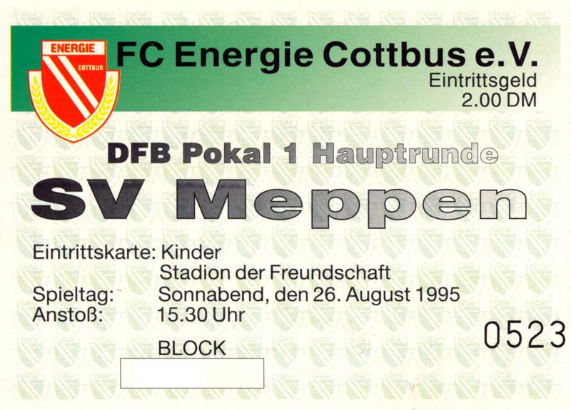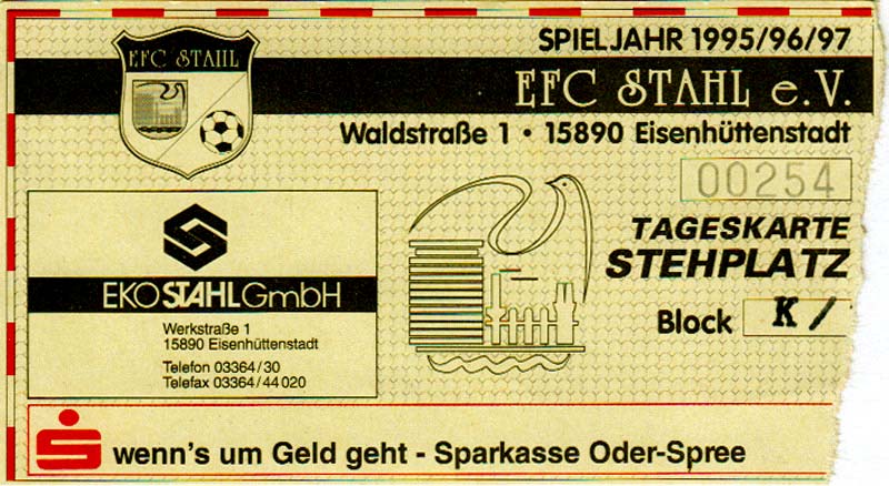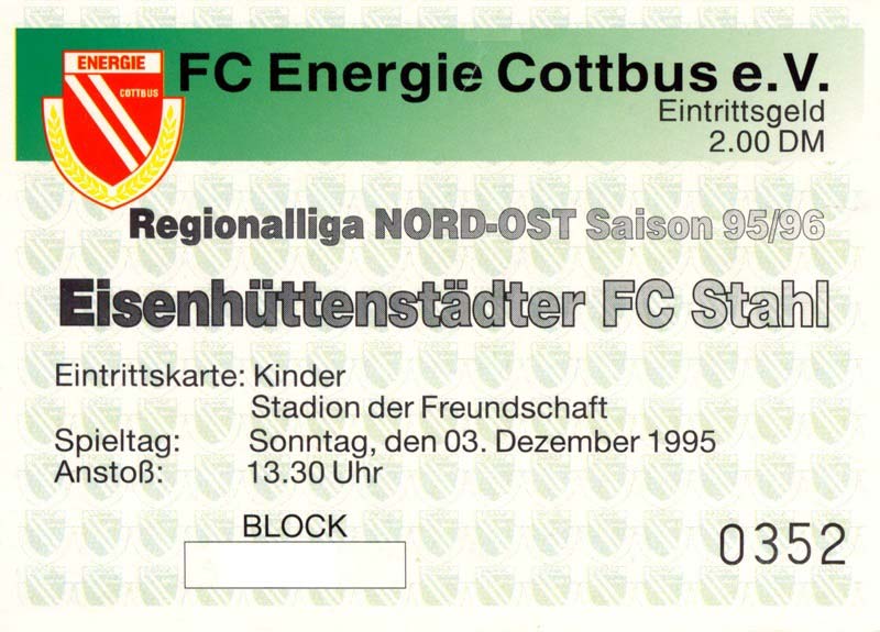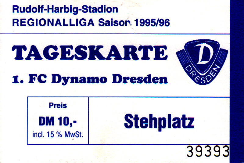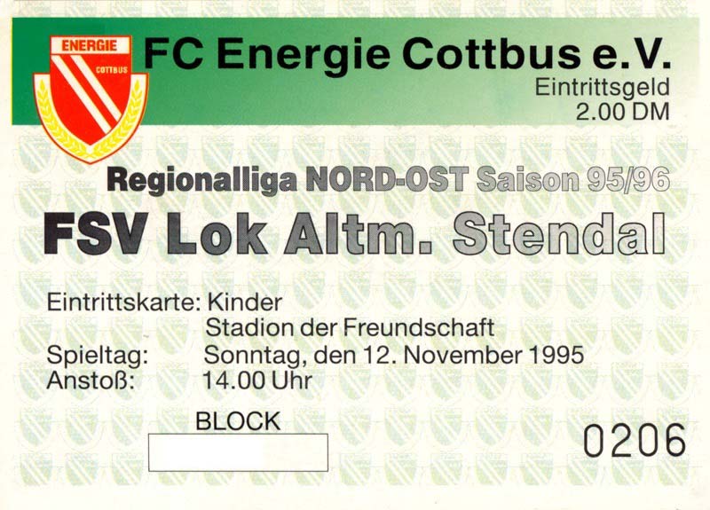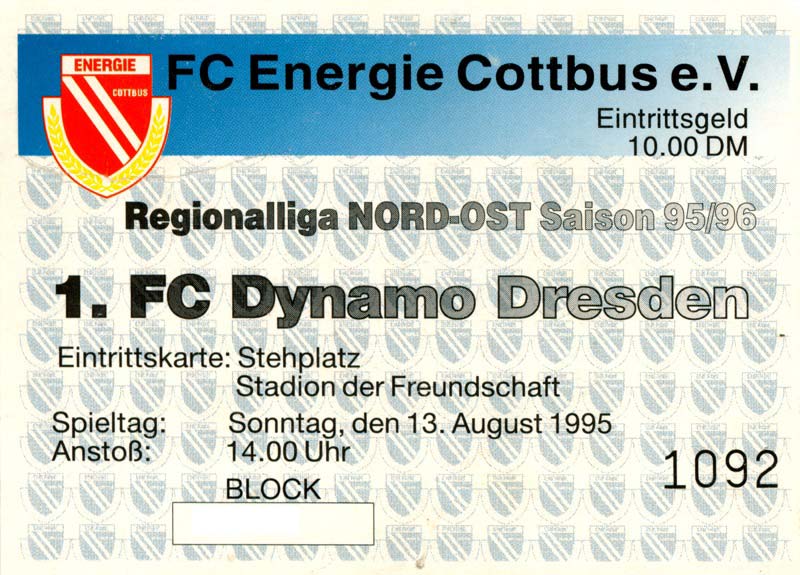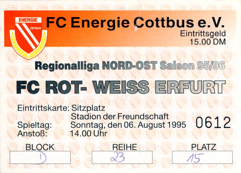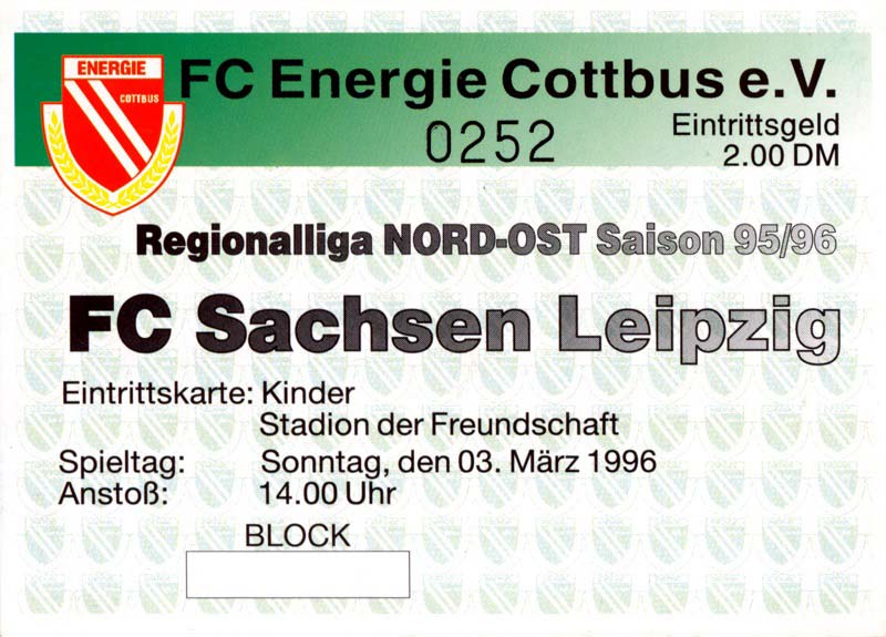 Eintrittskarten der 1. Mannschaft 30.07.1995, FC Erzgebirge Aue (A)06.08.1995, FC Rot-Weiß Erfurt (H)13.08.1995, 1. FC Dynamo Dresden (H)20.08.1995, Tennis Borussia Berlin (H)26.08.1995, SV Meppen 1912 (H)02.09.1995, FC Berlin (H)10.09.1995, 1. FC Union Berlin (A)13.09.1995, FC Sachsen Leipzig (A)17.09.1995, Bischofswerdaer FV 08 (H)23.09.1995, F.C. Hertha 03 Zehlendorf (A)08.10.1995, FSV Wacker 90 Nordhausen (H)14.10.1995, BTSV Reinickendorfer Füchse (A)22.10.1995, Hertha BSC (A.) (H)12.11.1995, FSV Lok Altmark Stendal (H)19.11.1995, Spandauer SV 1894 (A)25.11.1995, FSV Velten 90 (A)03.12.1995, Eisenhüttenstädter FC Stahl (H)10.12.1995, FC Erzgebirge Aue (H)16.12.1995, SV Rot-Weiß 90 Forst (A)03.02.1996, FC Rot-Weiß Erfurt (A)10.02.1996, 1. FC Dynamo Dresden (A)17.03.1996, 1. FC Union Berlin (H)20.03.1996, FC Berlin (A)24.03.1996, Bischofswerdaer FV 08 (A)30.03.1996, Tennis Borussia Berlin (A)04.04.1996, F.C. Hertha 03 Zehlendorf (H)08.04.1996, FSV Optik Rathenow (H)14.04.1996, FSV Wacker 90 Nordhausen (A)17.04.1996, FC Sachsen Leipzig (H)21.04.1996, BTSV Reinickendorfer Füchse (H)27.04.1996, Hertha BSC (A.) (A)04.05.1996, FSV Velten 90 (H)08.05.1996, Eisenhüttenstädter FC Stahl (A)12.05.1996, FSV Lok Altmark Stendal (A)19.05.1996, Spandauer SV 1894 (H)23.05.1996, Eisenhüttenstädter FC Stahl (A)29.05.1996, Frankfurter FC Viktoria 91 (N)
