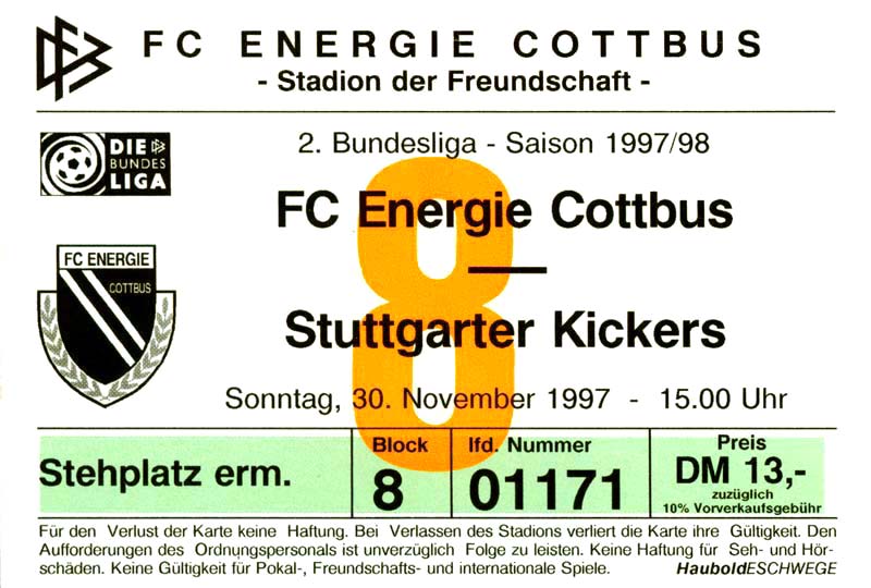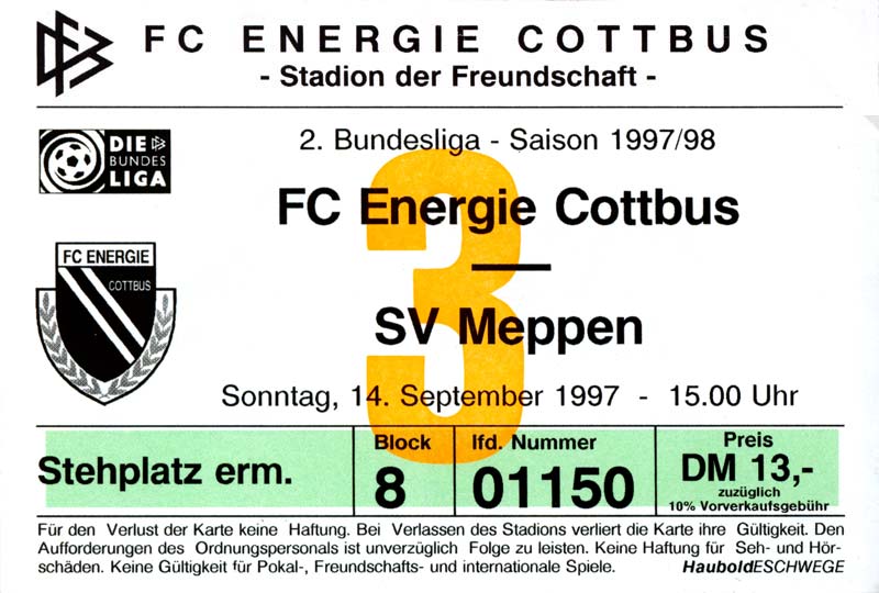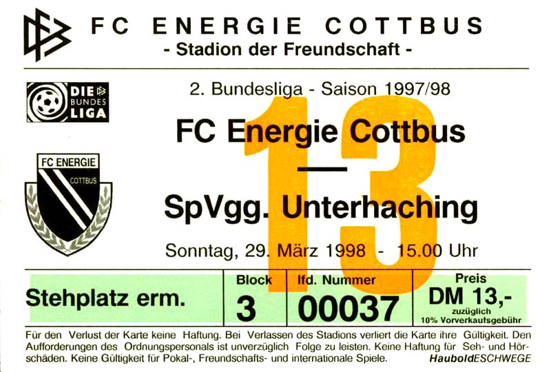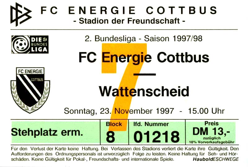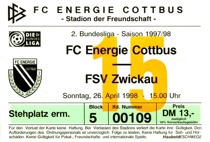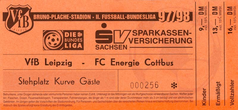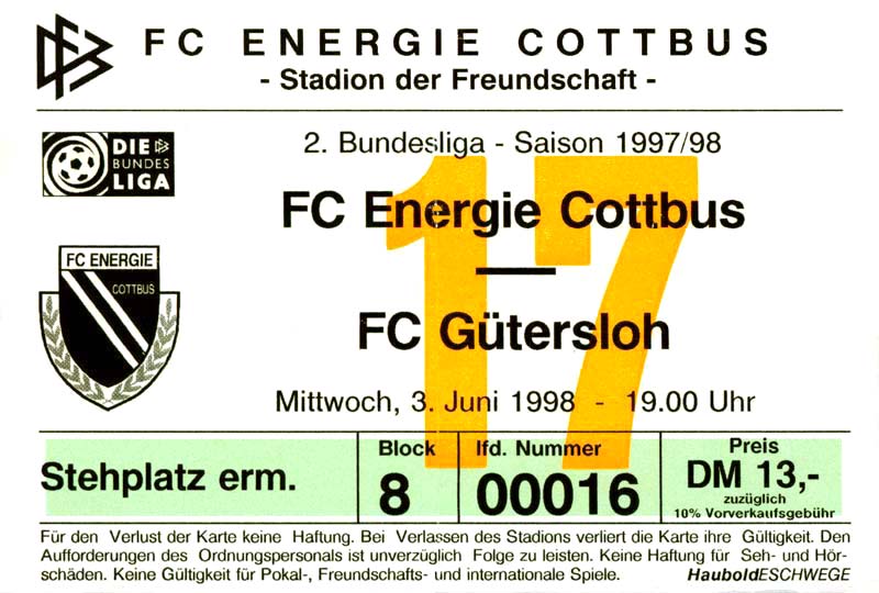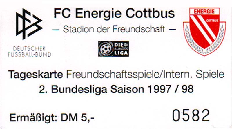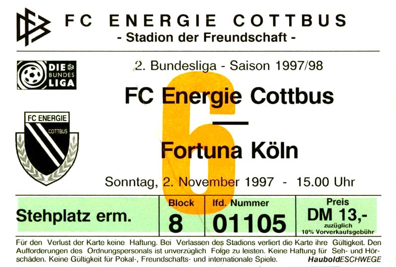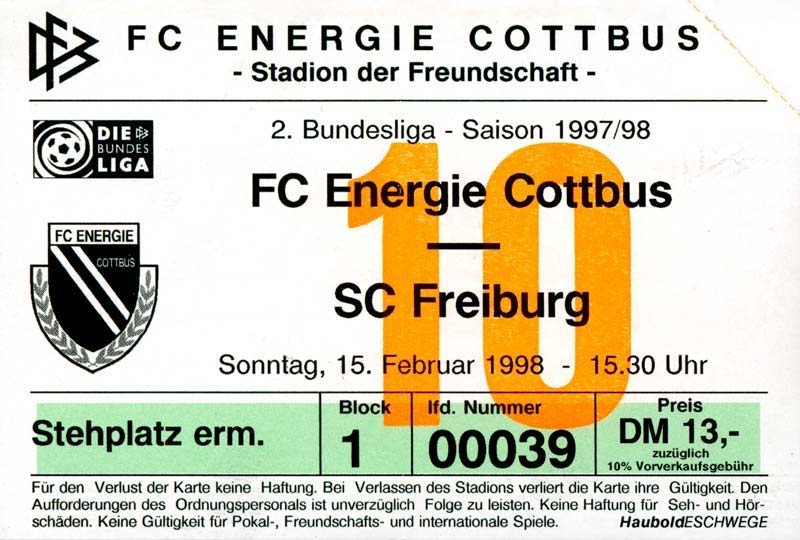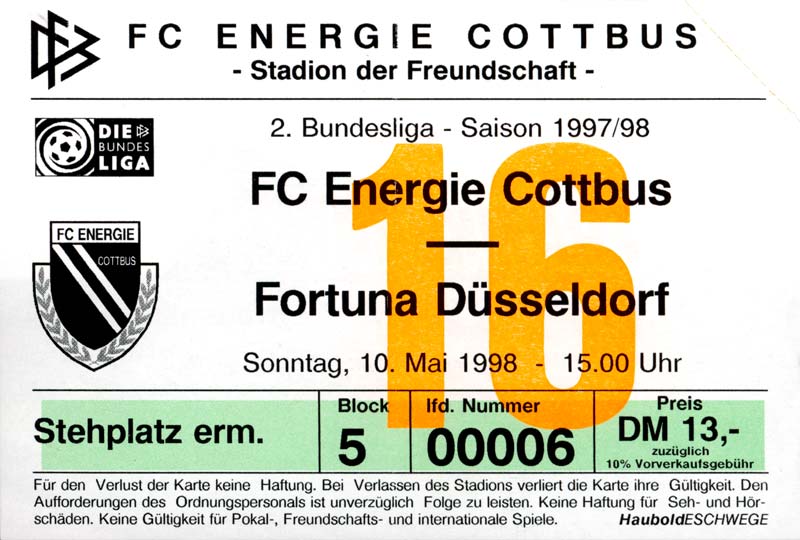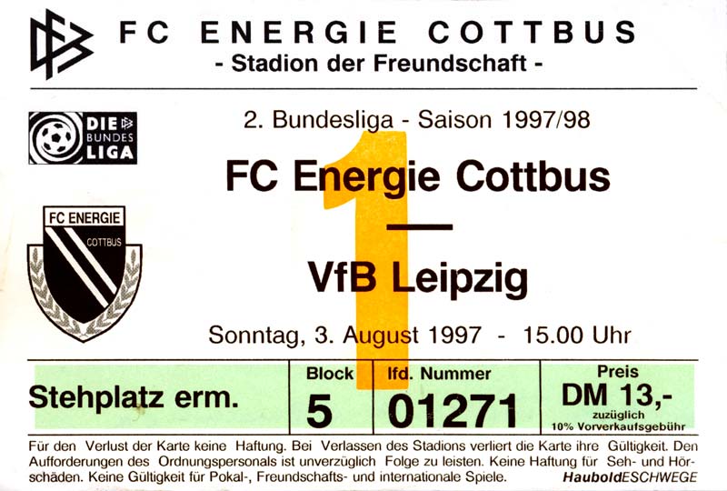 Eintrittskarten der 1. Mannschaft 15.07.1997, FV Dresden-Nord (H)16.07.1997, Tennis Borussia Berlin (H)27.07.1997, SC Freiburg (A)03.08.1997, VfB Leipzig (H)10.08.1997, FC Carl Zeiss Jena (A)15.08.1997, TSV Pansdorf 1920 (A)22.08.1997, Eintracht Frankfurt (H)29.08.1997, KFC Uerdingen 05 (A)05.09.1997, RTS Widzew Łódź (H)14.09.1997, SV Meppen 1912 (H)20.09.1997, SpVgg Unterhaching (A)23.09.1997, SV Waldhof Mannheim 07 (A)28.09.1997, SpVgg Greuther Fürth (H)05.10.1997, FC St. Pauli 1910 (A)17.10.1997, 1. FSV Mainz 05 (H)26.10.1997, FSV Zwickau (A)02.11.1997, S.C. Fortuna Köln (H)09.11.1997, TSV Fortuna Düsseldorf (A)23.11.1997, SG Wattenscheid 09 (H)30.11.1997, SV Stuttgarter Kickers (H)07.12.1997, FC Gütersloh (A)14.12.1997, 1. FC Nürnberg (H)18.01.1998, FSV Hoyerswerda (A)20.01.1998, 1. FC Union Berlin (H)08.02.1998, Górnik Zabrze (H)15.02.1998, SC Freiburg (H)20.02.1998, VfB Leipzig (A)01.03.1998, FC Carl Zeiss Jena (H)08.03.1998, Eintracht Frankfurt (A)15.03.1998, KFC Uerdingen 05 (H)22.03.1998, SV Meppen 1912 (A)29.03.1998, SpVgg Unterhaching (H)05.04.1998, SpVgg Greuther Fürth (A)13.04.1998, FC St. Pauli 1910 (H)17.04.1998, 1. FSV Mainz 05 (A)26.04.1998, FSV Zwickau (H)03.05.1998, S.C. Fortuna Köln (A)10.05.1998, TSV Fortuna Düsseldorf (H)17.05.1998, SG Wattenscheid 09 (A)24.05.1998, SV Stuttgarter Kickers (A)28.05.1998, TSV Flöha 1848 (A)03.06.1998, FC Gütersloh (H)07.06.1998, 1. FC Nürnberg (A)