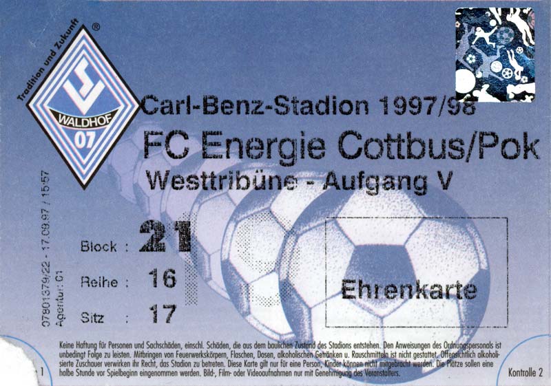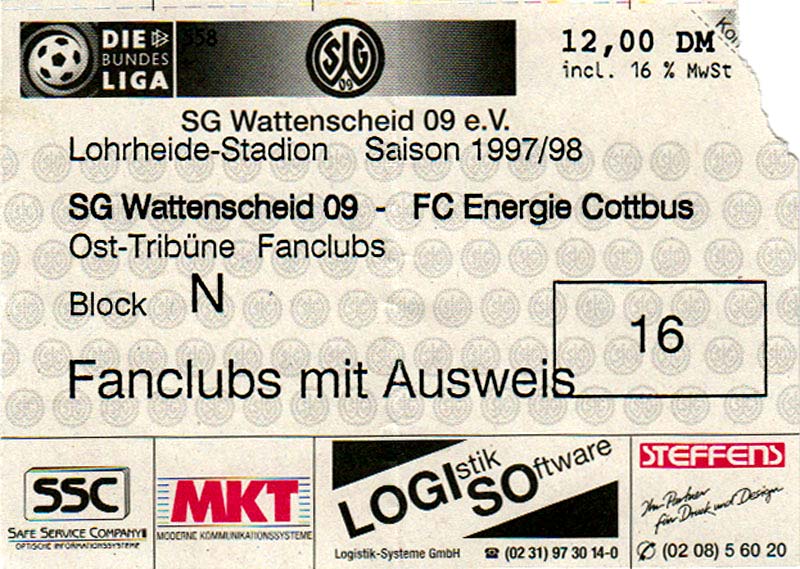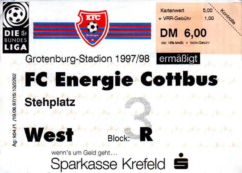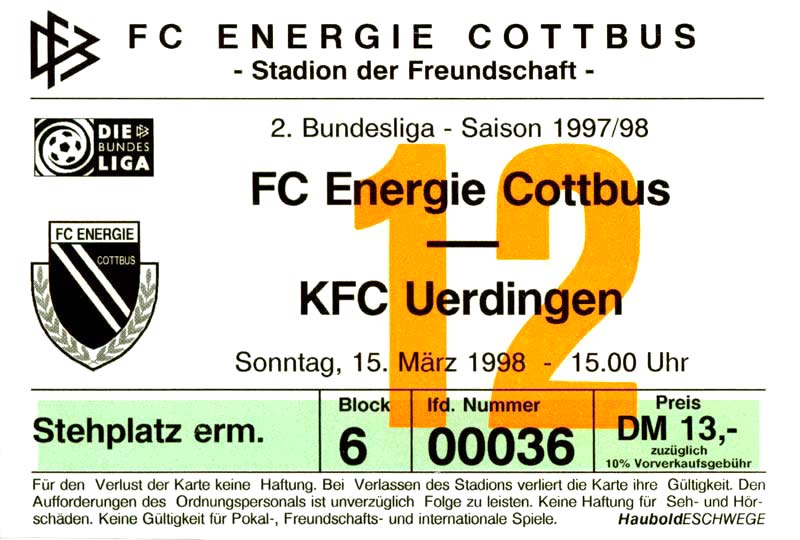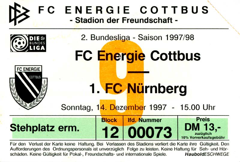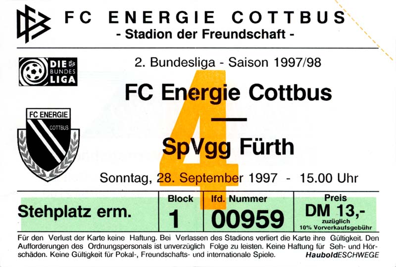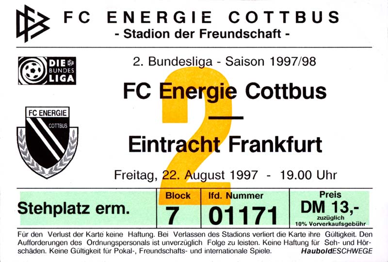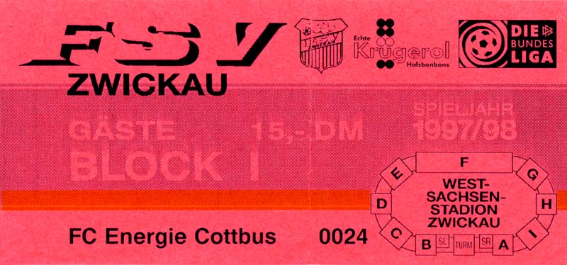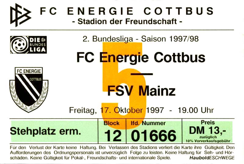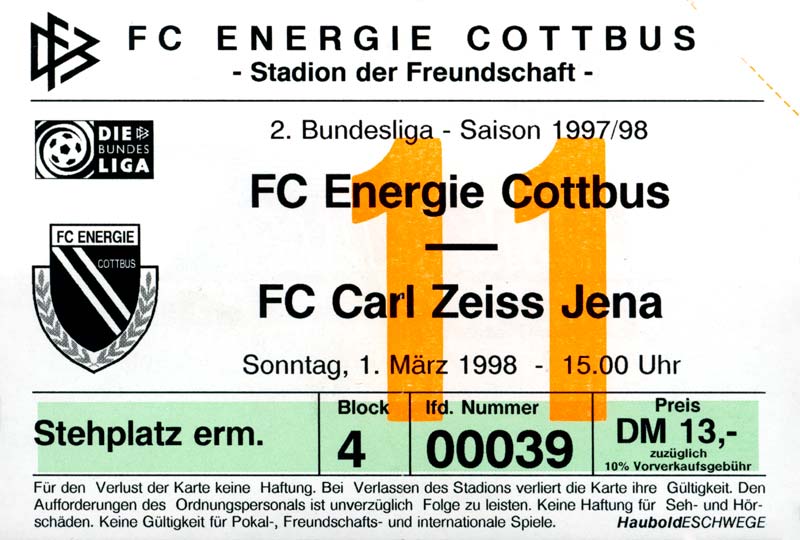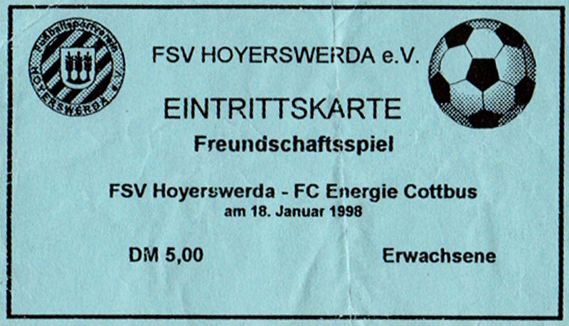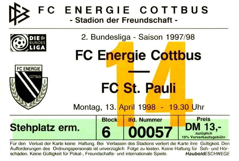 Eintrittskarten der 1. Mannschaft 15.07.1997, FV Dresden-Nord (H)16.07.1997, Tennis Borussia Berlin (H)27.07.1997, SC Freiburg (A)03.08.1997, VfB Leipzig (H)10.08.1997, FC Carl Zeiss Jena (A)15.08.1997, TSV Pansdorf 1920 (A)22.08.1997, Eintracht Frankfurt (H)29.08.1997, KFC Uerdingen 05 (A)05.09.1997, RTS Widzew Łódź (H)14.09.1997, SV Meppen 1912 (H)20.09.1997, SpVgg Unterhaching (A)23.09.1997, SV Waldhof Mannheim 07 (A)28.09.1997, SpVgg Greuther Fürth (H)05.10.1997, FC St. Pauli 1910 (A)17.10.1997, 1. FSV Mainz 05 (H)26.10.1997, FSV Zwickau (A)02.11.1997, S.C. Fortuna Köln (H)09.11.1997, TSV Fortuna Düsseldorf (A)23.11.1997, SG Wattenscheid 09 (H)30.11.1997, SV Stuttgarter Kickers (H)07.12.1997, FC Gütersloh (A)14.12.1997, 1. FC Nürnberg (H)18.01.1998, FSV Hoyerswerda (A)20.01.1998, 1. FC Union Berlin (H)08.02.1998, Górnik Zabrze (H)15.02.1998, SC Freiburg (H)20.02.1998, VfB Leipzig (A)01.03.1998, FC Carl Zeiss Jena (H)08.03.1998, Eintracht Frankfurt (A)15.03.1998, KFC Uerdingen 05 (H)22.03.1998, SV Meppen 1912 (A)29.03.1998, SpVgg Unterhaching (H)05.04.1998, SpVgg Greuther Fürth (A)13.04.1998, FC St. Pauli 1910 (H)17.04.1998, 1. FSV Mainz 05 (A)26.04.1998, FSV Zwickau (H)03.05.1998, S.C. Fortuna Köln (A)10.05.1998, TSV Fortuna Düsseldorf (H)17.05.1998, SG Wattenscheid 09 (A)24.05.1998, SV Stuttgarter Kickers (A)28.05.1998, TSV Flöha 1848 (A)03.06.1998, FC Gütersloh (H)07.06.1998, 1. FC Nürnberg (A)