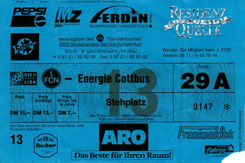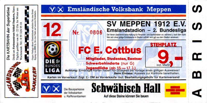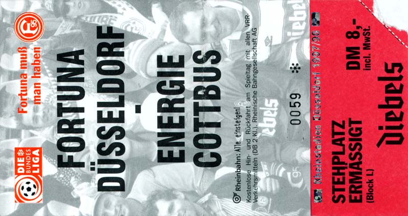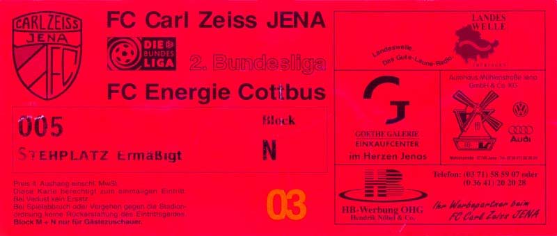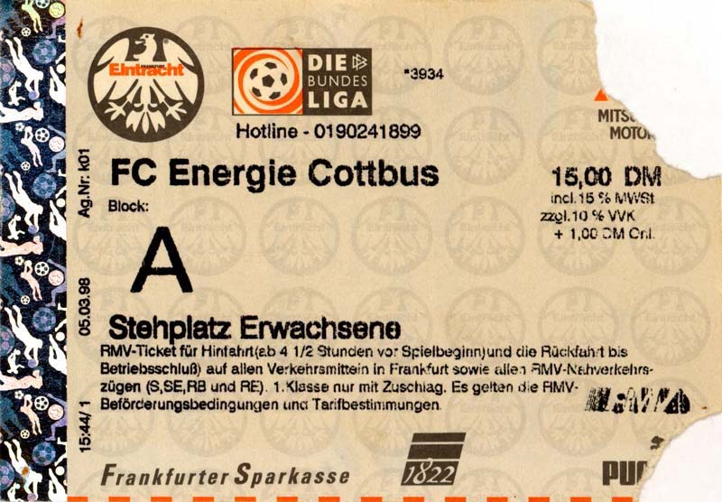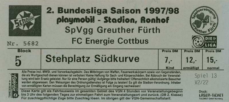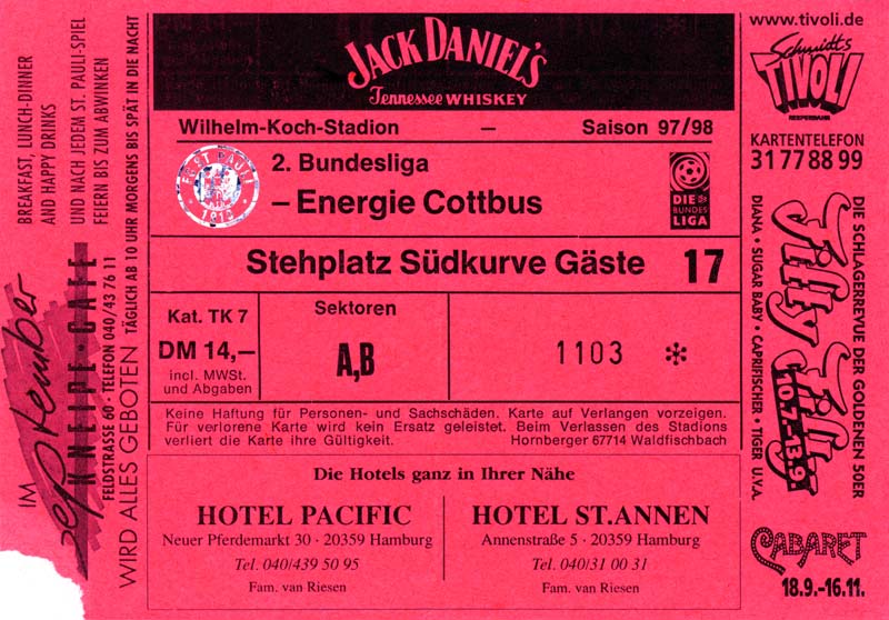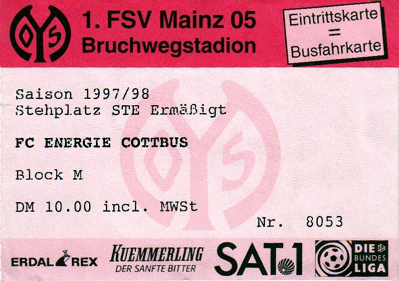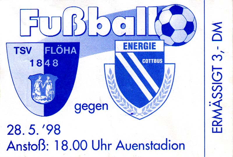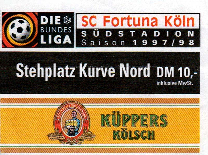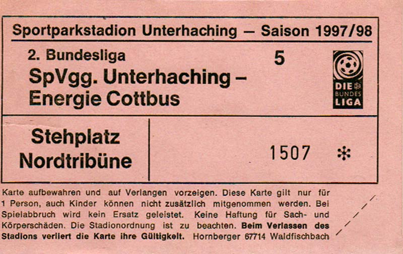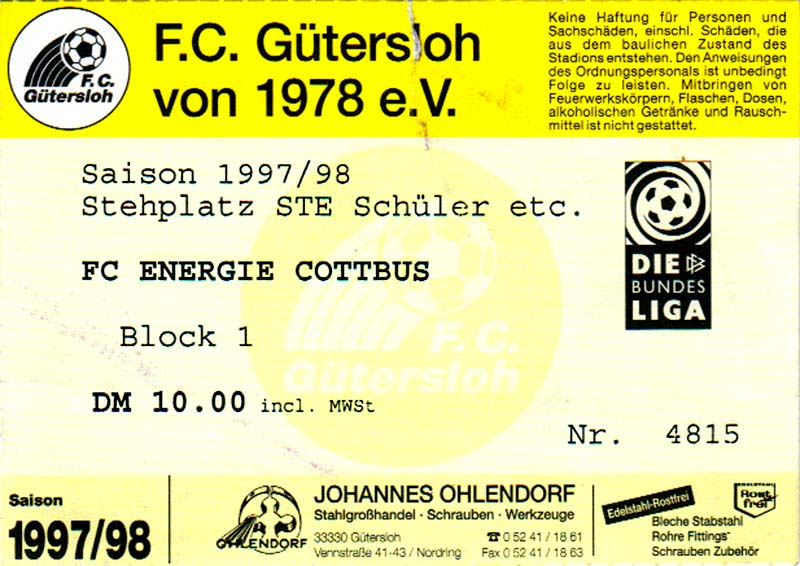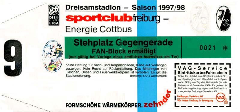 Eintrittskarten der 1. Mannschaft 15.07.1997, FV Dresden-Nord (H)16.07.1997, Tennis Borussia Berlin (H)27.07.1997, SC Freiburg (A)03.08.1997, VfB Leipzig (H)10.08.1997, FC Carl Zeiss Jena (A)15.08.1997, TSV Pansdorf 1920 (A)22.08.1997, Eintracht Frankfurt (H)29.08.1997, KFC Uerdingen 05 (A)05.09.1997, RTS Widzew Łódź (H)14.09.1997, SV Meppen 1912 (H)20.09.1997, SpVgg Unterhaching (A)23.09.1997, SV Waldhof Mannheim 07 (A)28.09.1997, SpVgg Greuther Fürth (H)05.10.1997, FC St. Pauli 1910 (A)17.10.1997, 1. FSV Mainz 05 (H)26.10.1997, FSV Zwickau (A)02.11.1997, S.C. Fortuna Köln (H)09.11.1997, TSV Fortuna Düsseldorf (A)23.11.1997, SG Wattenscheid 09 (H)30.11.1997, SV Stuttgarter Kickers (H)07.12.1997, FC Gütersloh (A)14.12.1997, 1. FC Nürnberg (H)18.01.1998, FSV Hoyerswerda (A)20.01.1998, 1. FC Union Berlin (H)08.02.1998, Górnik Zabrze (H)15.02.1998, SC Freiburg (H)20.02.1998, VfB Leipzig (A)01.03.1998, FC Carl Zeiss Jena (H)08.03.1998, Eintracht Frankfurt (A)15.03.1998, KFC Uerdingen 05 (H)22.03.1998, SV Meppen 1912 (A)29.03.1998, SpVgg Unterhaching (H)05.04.1998, SpVgg Greuther Fürth (A)13.04.1998, FC St. Pauli 1910 (H)17.04.1998, 1. FSV Mainz 05 (A)26.04.1998, FSV Zwickau (H)03.05.1998, S.C. Fortuna Köln (A)10.05.1998, TSV Fortuna Düsseldorf (H)17.05.1998, SG Wattenscheid 09 (A)24.05.1998, SV Stuttgarter Kickers (A)28.05.1998, TSV Flöha 1848 (A)03.06.1998, FC Gütersloh (H)07.06.1998, 1. FC Nürnberg (A)