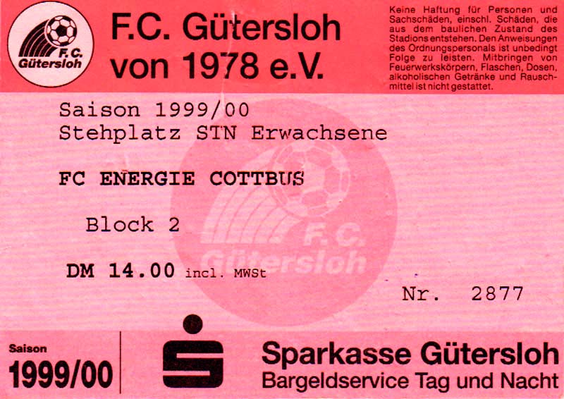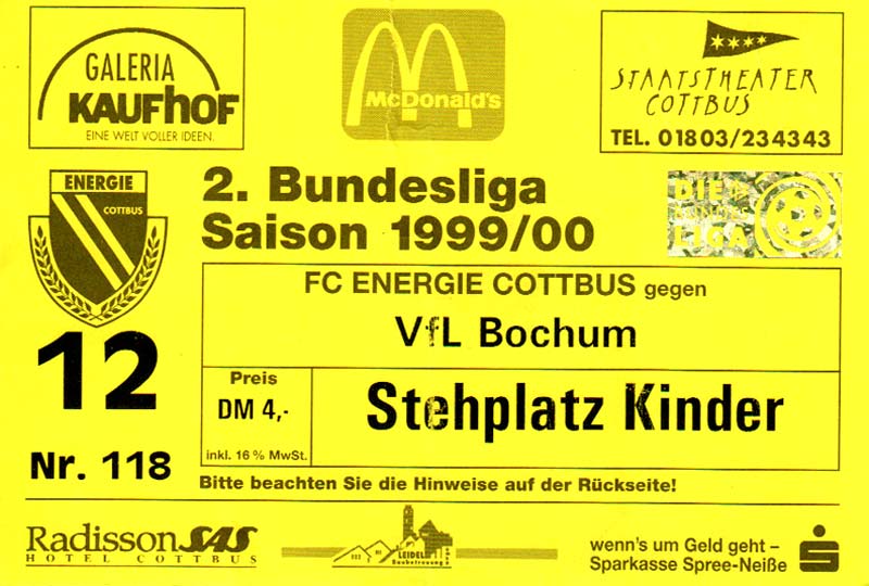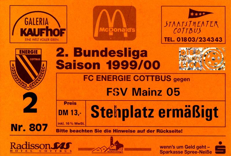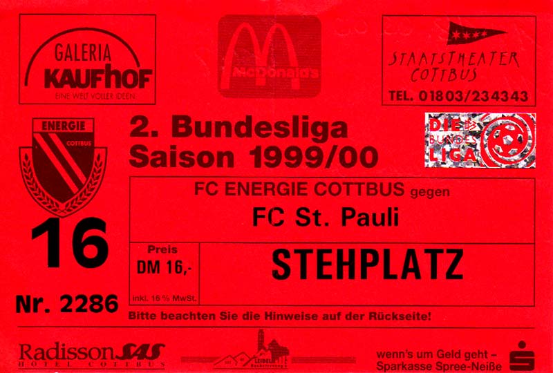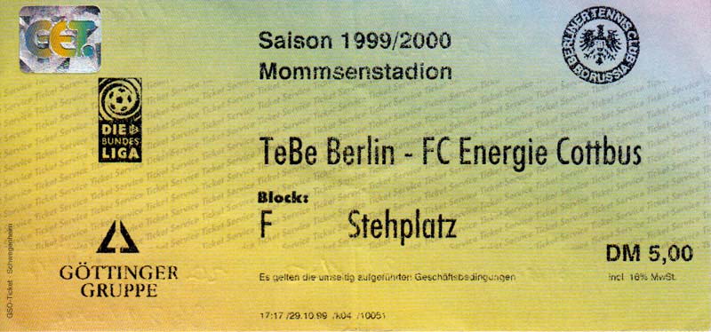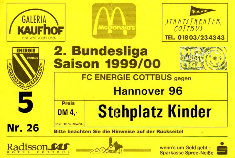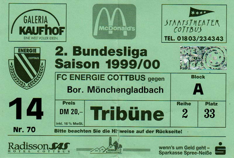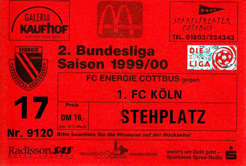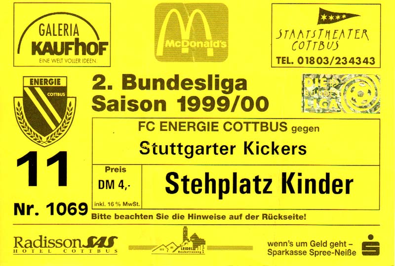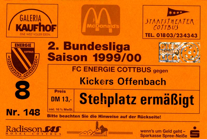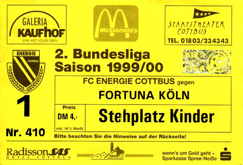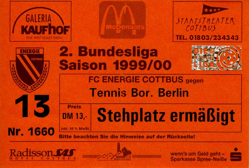 Eintrittskarten der 1. Mannschaft 24.07.1999, VfB Leipzig (H)27.07.1999, BSV Cottbus-Ost (A)28.07.1999, Dresdner SC 1898 (N)31.07.1999, VfL Osnabrück 1899 (A)06.08.1999, FC Gütersloh (A)13.08.1999, S.C. Fortuna Köln (H)22.08.1999, SC Rot-Weiß Oberhausen 1904 (A)29.08.1999, 1. FSV Mainz 05 (H)12.09.1999, SpVgg Greuther Fürth (A)19.09.1999, 1. FC Nürnberg (H)26.09.1999, SV Stuttgarter Kickers (A)03.10.1999, Chemnitzer FC (H)07.10.1999, Bischofswerdaer FV 08 (A)13.10.1999, FC Schalke 04 (H)16.10.1999, VfL Bochum 1848 (A)22.10.1999, Hannover 96 (H)30.10.1999, Tennis Borussia Berlin (A)06.11.1999, Karlsruher SC (H)12.11.1999, WKP Lech Poznań (H)20.11.1999, Borussia VfL 1900 Mönchengladbach (A)26.11.1999, TSV Alemannia Aachen (H)04.12.1999, SV Waldhof Mannheim 07 (A)12.12.1999, FC St. Pauli 1910 (A)15.12.1999, Offenbacher FC Kickers 1901 (H)18.12.1999, 1. FC Köln (A)14.01.2000, FC Sachsen Leipzig (H)30.01.2000, FC Carl Zeiss Jena (H)06.02.2000, KP Legia Warszawa (H)13.02.2000, S.C. Fortuna Köln (A)21.02.2000, SC Rot-Weiß Oberhausen 1904 (H)26.02.2000, 1. FSV Mainz 05 (A)03.03.2000, SpVgg Greuther Fürth (H)10.03.2000, 1. FC Nürnberg (A)19.03.2000, SV Stuttgarter Kickers (H)27.03.2000, Chemnitzer FC (A)03.04.2000, VfL Bochum 1848 (H)07.04.2000, Hannover 96 (A)15.04.2000, Tennis Borussia Berlin (H)23.04.2000, Karlsruher SC (A)01.05.2000, Borussia VfL 1900 Mönchengladbach (H)05.05.2000, TSV Alemannia Aachen (A)14.05.2000, SV Waldhof Mannheim 07 (H)18.05.2000, FC St. Pauli 1910 (H)21.05.2000, Offenbacher FC Kickers 1901 (A)26.05.2000, 1. FC Köln (H)