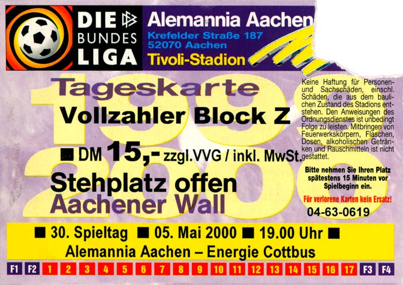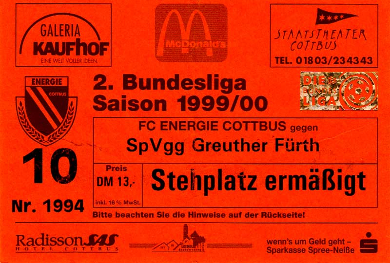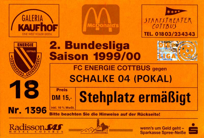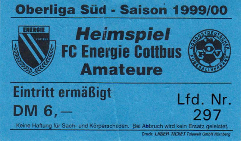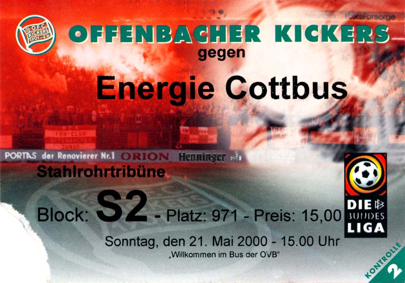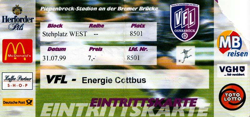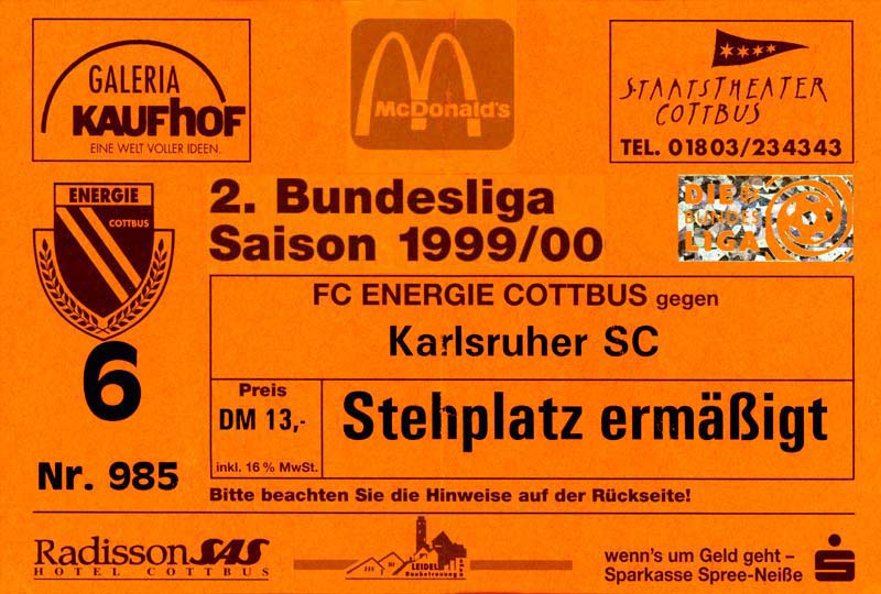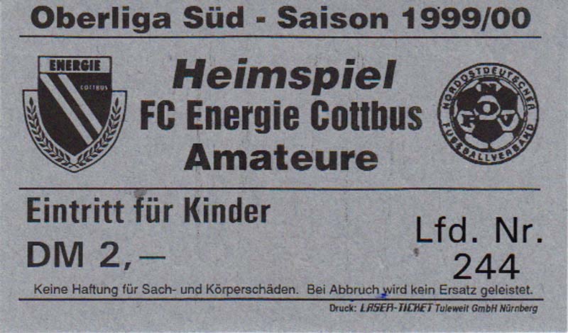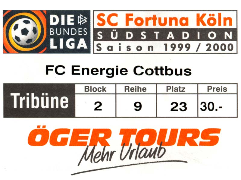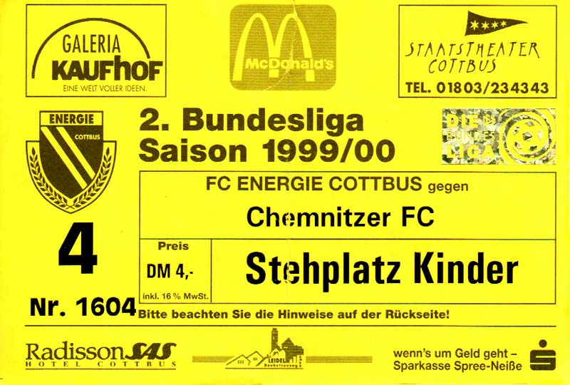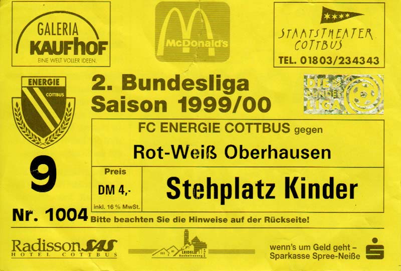 Eintrittskarten der 1. Mannschaft 24.07.1999, VfB Leipzig (H)27.07.1999, BSV Cottbus-Ost (A)28.07.1999, Dresdner SC 1898 (N)31.07.1999, VfL Osnabrück 1899 (A)06.08.1999, FC Gütersloh (A)13.08.1999, S.C. Fortuna Köln (H)22.08.1999, SC Rot-Weiß Oberhausen 1904 (A)29.08.1999, 1. FSV Mainz 05 (H)12.09.1999, SpVgg Greuther Fürth (A)19.09.1999, 1. FC Nürnberg (H)26.09.1999, SV Stuttgarter Kickers (A)03.10.1999, Chemnitzer FC (H)07.10.1999, Bischofswerdaer FV 08 (A)13.10.1999, FC Schalke 04 (H)16.10.1999, VfL Bochum 1848 (A)22.10.1999, Hannover 96 (H)30.10.1999, Tennis Borussia Berlin (A)06.11.1999, Karlsruher SC (H)12.11.1999, WKP Lech Poznań (H)20.11.1999, Borussia VfL 1900 Mönchengladbach (A)26.11.1999, TSV Alemannia Aachen (H)04.12.1999, SV Waldhof Mannheim 07 (A)12.12.1999, FC St. Pauli 1910 (A)15.12.1999, Offenbacher FC Kickers 1901 (H)18.12.1999, 1. FC Köln (A)14.01.2000, FC Sachsen Leipzig (H)30.01.2000, FC Carl Zeiss Jena (H)06.02.2000, KP Legia Warszawa (H)13.02.2000, S.C. Fortuna Köln (A)21.02.2000, SC Rot-Weiß Oberhausen 1904 (H)26.02.2000, 1. FSV Mainz 05 (A)03.03.2000, SpVgg Greuther Fürth (H)10.03.2000, 1. FC Nürnberg (A)19.03.2000, SV Stuttgarter Kickers (H)27.03.2000, Chemnitzer FC (A)03.04.2000, VfL Bochum 1848 (H)07.04.2000, Hannover 96 (A)15.04.2000, Tennis Borussia Berlin (H)23.04.2000, Karlsruher SC (A)01.05.2000, Borussia VfL 1900 Mönchengladbach (H)05.05.2000, TSV Alemannia Aachen (A)14.05.2000, SV Waldhof Mannheim 07 (H)18.05.2000, FC St. Pauli 1910 (H)21.05.2000, Offenbacher FC Kickers 1901 (A)26.05.2000, 1. FC Köln (H)
