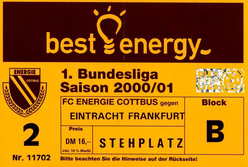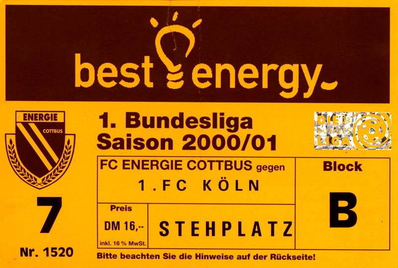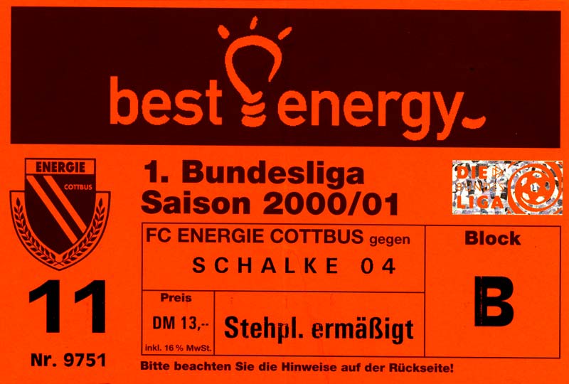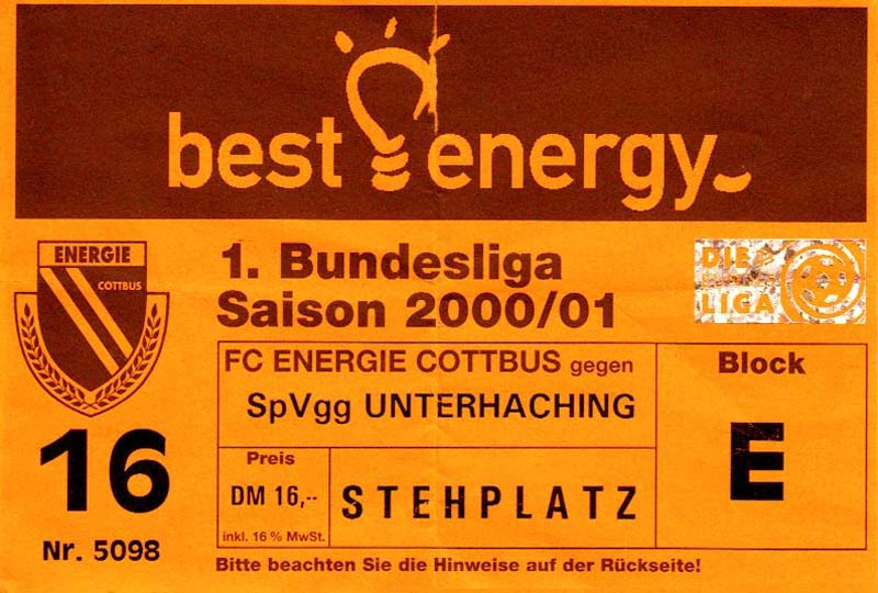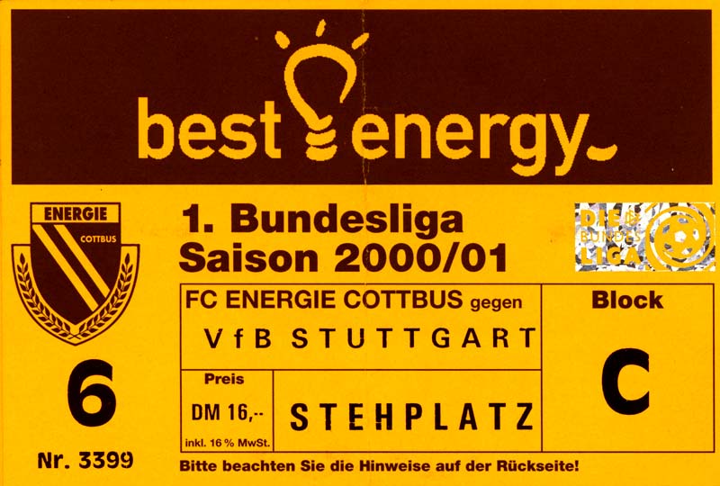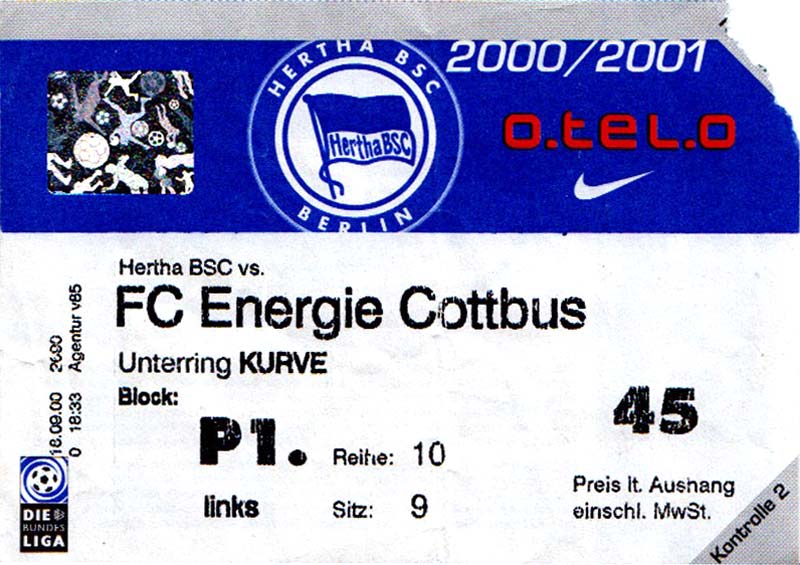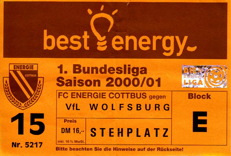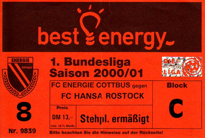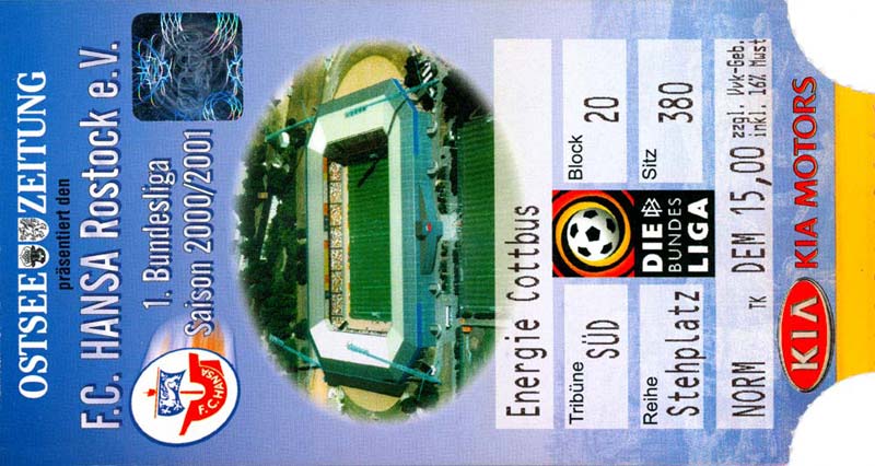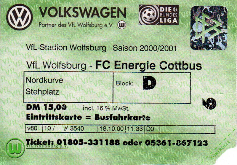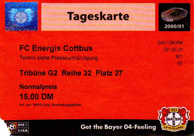 Eintrittskarten der 1. Mannschaft 02.07.2000, Eisenhüttenstädter FC Stahl (N)12.07.2000, SV Babelsberg 03 (N)14.07.2000, Chemnitzer FC (H)16.07.2000, FK Teplice (N)19.07.2000, FC Georgia Tbilisi (H)28.07.2000, FC Schaffhausen (N)05.08.2000, AC Fiorentina (N)12.08.2000, SV Werder Bremen (A)18.08.2000, BV Borussia 09 Dortmund (H)27.08.2000, VfL Hamm/Sieg 1883 (A)05.09.2000, FC Schalke 04 (A)10.09.2000, Eintracht Frankfurt (H)16.09.2000, SC Freiburg (A)23.09.2000, Bayer 04 Leverkusen (H)30.09.2000, 1. FC Kaiserslautern (A)14.10.2000, FC Bayern München (H)21.10.2000, Hertha BSC (A)27.10.2000, VfL Bochum 1848 (H)01.11.2000, SSV Ulm 1846 (A)05.11.2000, VfL Wolfsburg (A)12.11.2000, VfB Stuttgart 1893 (H)19.11.2000, SpVgg Unterhaching (A)25.11.2000, 1. FC Köln (H)03.12.2000, F.C. Hansa Rostock (H)10.12.2000, Hamburger SV (A)13.12.2000, TSV 1860 München (H)17.12.2000, SV Werder Bremen (H)27.01.2001, BV Borussia 09 Dortmund (A)03.02.2001, FC Schalke 04 (H)09.02.2001, Eintracht Frankfurt (A)17.02.2001, SC Freiburg (H)23.02.2001, Bayer 04 Leverkusen (A)03.03.2001, 1. FC Kaiserslautern (H)10.03.2001, FC Bayern München (A)17.03.2001, Hertha BSC (H)01.04.2001, VfL Bochum 1848 (A)06.04.2001, VfL Wolfsburg (H)12.04.2001, VfB Stuttgart 1893 (A)21.04.2001, SpVgg Unterhaching (H)28.04.2001, 1. FC Köln (A)05.05.2001, F.C. Hansa Rostock (A)12.05.2001, Hamburger SV (H)19.05.2001, TSV 1860 München (A)