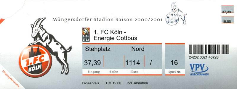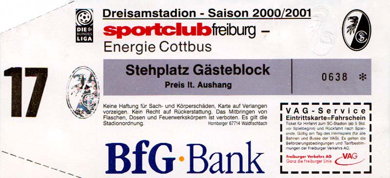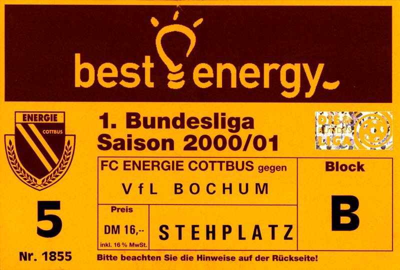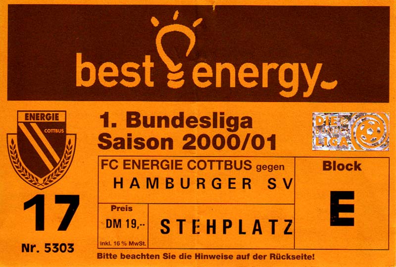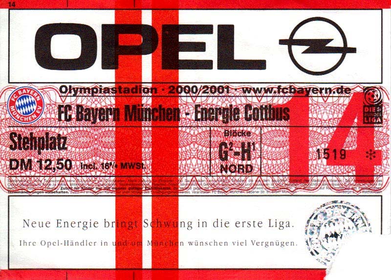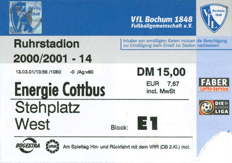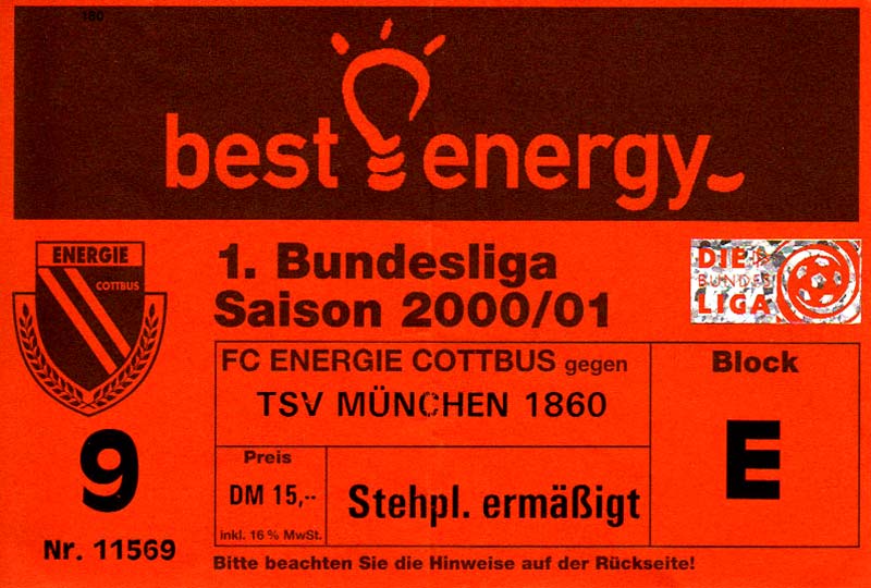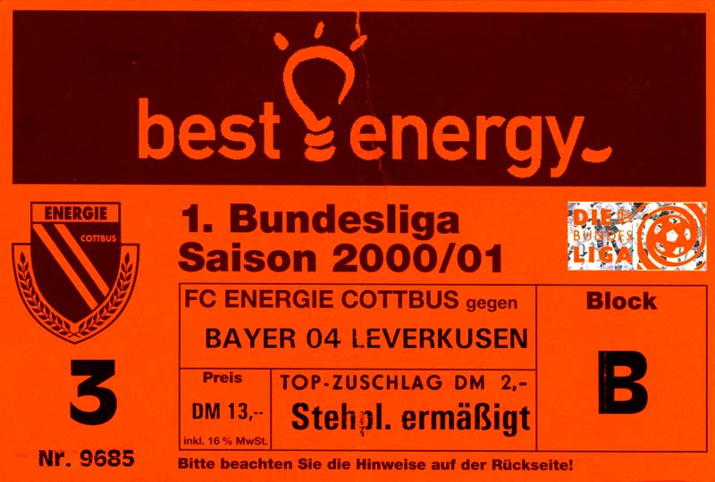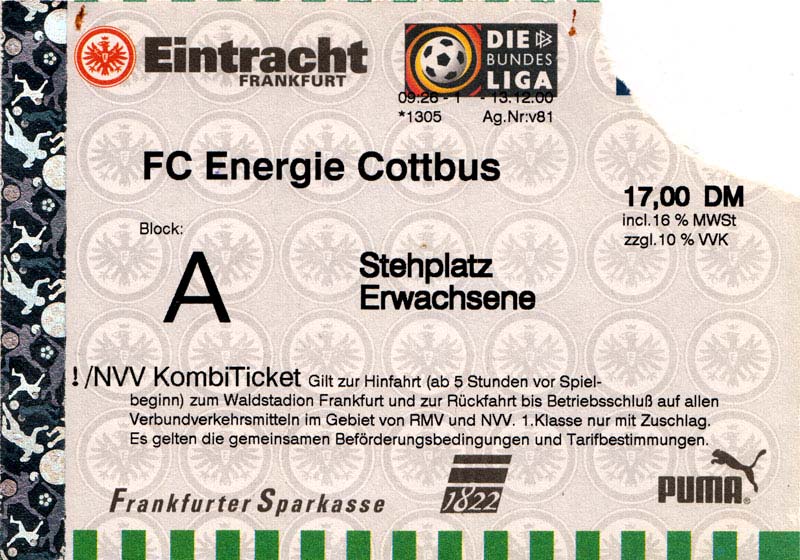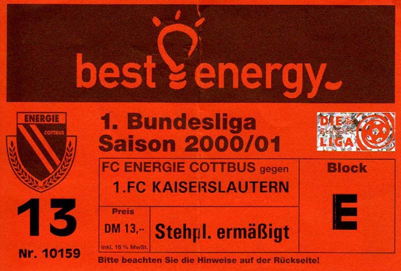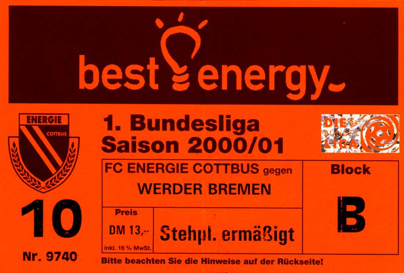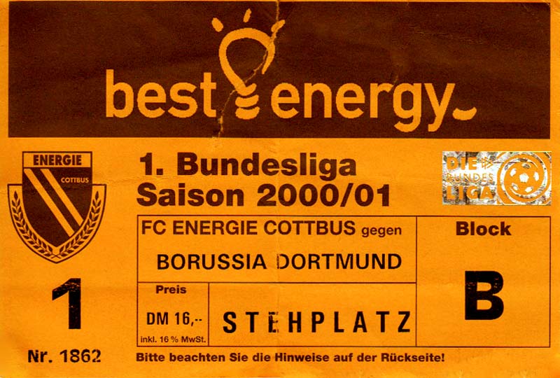 Eintrittskarten der 1. Mannschaft 02.07.2000, Eisenhüttenstädter FC Stahl (N)12.07.2000, SV Babelsberg 03 (N)14.07.2000, Chemnitzer FC (H)16.07.2000, FK Teplice (N)19.07.2000, FC Georgia Tbilisi (H)28.07.2000, FC Schaffhausen (N)05.08.2000, AC Fiorentina (N)12.08.2000, SV Werder Bremen (A)18.08.2000, BV Borussia 09 Dortmund (H)27.08.2000, VfL Hamm/Sieg 1883 (A)05.09.2000, FC Schalke 04 (A)10.09.2000, Eintracht Frankfurt (H)16.09.2000, SC Freiburg (A)23.09.2000, Bayer 04 Leverkusen (H)30.09.2000, 1. FC Kaiserslautern (A)14.10.2000, FC Bayern München (H)21.10.2000, Hertha BSC (A)27.10.2000, VfL Bochum 1848 (H)01.11.2000, SSV Ulm 1846 (A)05.11.2000, VfL Wolfsburg (A)12.11.2000, VfB Stuttgart 1893 (H)19.11.2000, SpVgg Unterhaching (A)25.11.2000, 1. FC Köln (H)03.12.2000, F.C. Hansa Rostock (H)10.12.2000, Hamburger SV (A)13.12.2000, TSV 1860 München (H)17.12.2000, SV Werder Bremen (H)27.01.2001, BV Borussia 09 Dortmund (A)03.02.2001, FC Schalke 04 (H)09.02.2001, Eintracht Frankfurt (A)17.02.2001, SC Freiburg (H)23.02.2001, Bayer 04 Leverkusen (A)03.03.2001, 1. FC Kaiserslautern (H)10.03.2001, FC Bayern München (A)17.03.2001, Hertha BSC (H)01.04.2001, VfL Bochum 1848 (A)06.04.2001, VfL Wolfsburg (H)12.04.2001, VfB Stuttgart 1893 (A)21.04.2001, SpVgg Unterhaching (H)28.04.2001, 1. FC Köln (A)05.05.2001, F.C. Hansa Rostock (A)12.05.2001, Hamburger SV (H)19.05.2001, TSV 1860 München (A)
