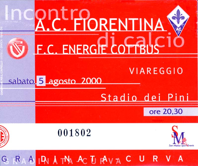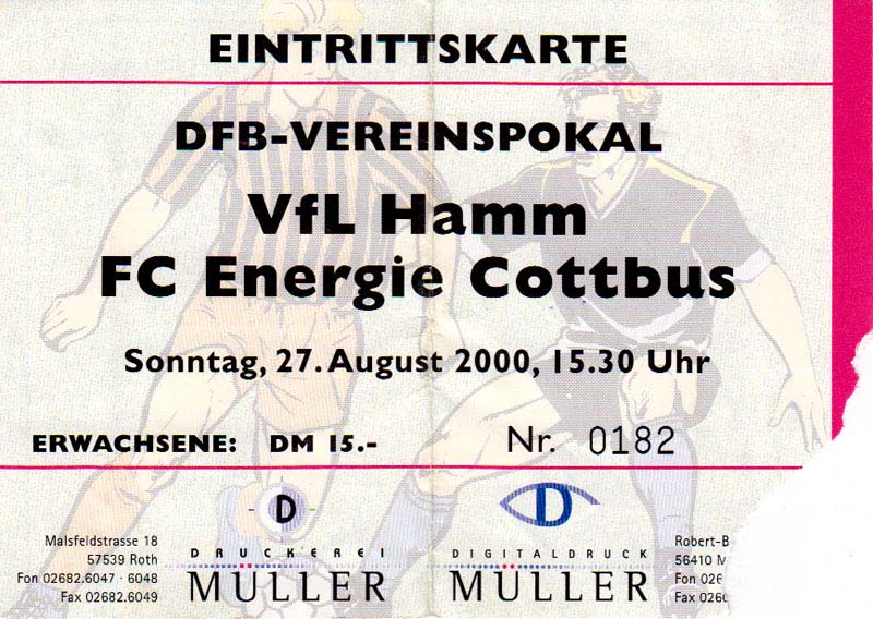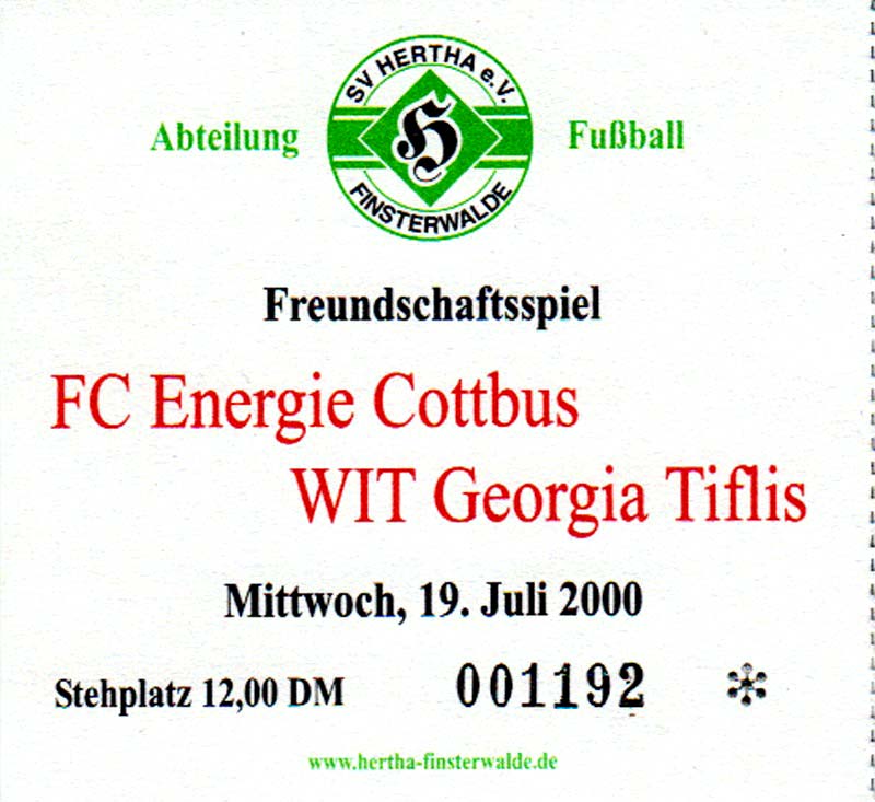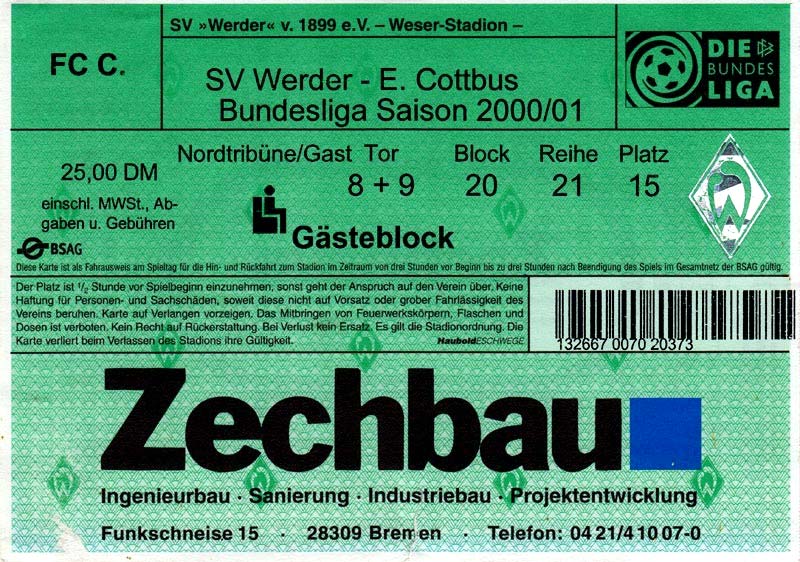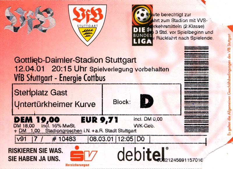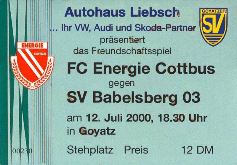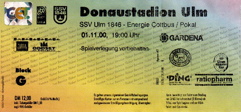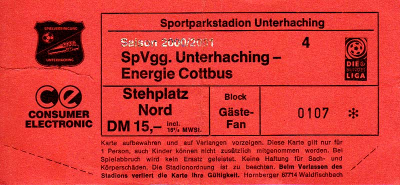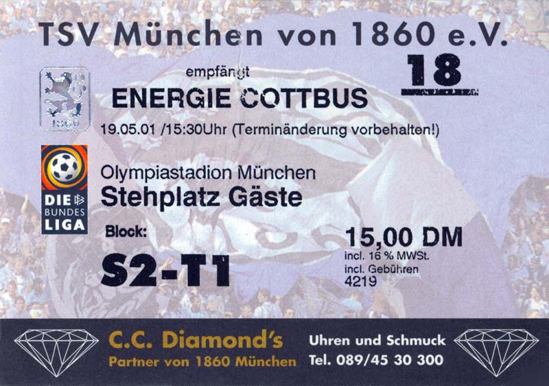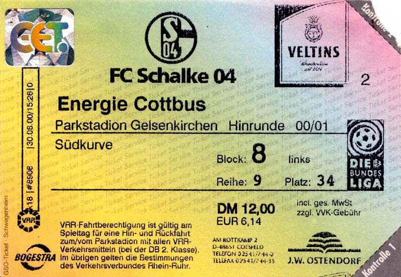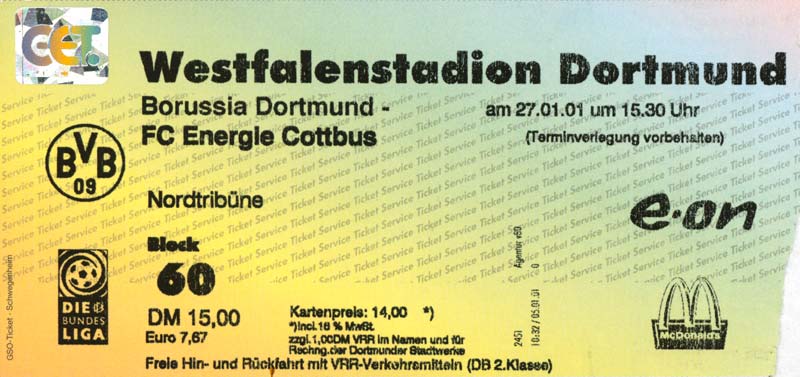 Eintrittskarten der 1. Mannschaft 02.07.2000, Eisenhüttenstädter FC Stahl (N)12.07.2000, SV Babelsberg 03 (N)14.07.2000, Chemnitzer FC (H)16.07.2000, FK Teplice (N)19.07.2000, FC Georgia Tbilisi (H)28.07.2000, FC Schaffhausen (N)05.08.2000, AC Fiorentina (N)12.08.2000, SV Werder Bremen (A)18.08.2000, BV Borussia 09 Dortmund (H)27.08.2000, VfL Hamm/Sieg 1883 (A)05.09.2000, FC Schalke 04 (A)10.09.2000, Eintracht Frankfurt (H)16.09.2000, SC Freiburg (A)23.09.2000, Bayer 04 Leverkusen (H)30.09.2000, 1. FC Kaiserslautern (A)14.10.2000, FC Bayern München (H)21.10.2000, Hertha BSC (A)27.10.2000, VfL Bochum 1848 (H)01.11.2000, SSV Ulm 1846 (A)05.11.2000, VfL Wolfsburg (A)12.11.2000, VfB Stuttgart 1893 (H)19.11.2000, SpVgg Unterhaching (A)25.11.2000, 1. FC Köln (H)03.12.2000, F.C. Hansa Rostock (H)10.12.2000, Hamburger SV (A)13.12.2000, TSV 1860 München (H)17.12.2000, SV Werder Bremen (H)27.01.2001, BV Borussia 09 Dortmund (A)03.02.2001, FC Schalke 04 (H)09.02.2001, Eintracht Frankfurt (A)17.02.2001, SC Freiburg (H)23.02.2001, Bayer 04 Leverkusen (A)03.03.2001, 1. FC Kaiserslautern (H)10.03.2001, FC Bayern München (A)17.03.2001, Hertha BSC (H)01.04.2001, VfL Bochum 1848 (A)06.04.2001, VfL Wolfsburg (H)12.04.2001, VfB Stuttgart 1893 (A)21.04.2001, SpVgg Unterhaching (H)28.04.2001, 1. FC Köln (A)05.05.2001, F.C. Hansa Rostock (A)12.05.2001, Hamburger SV (H)19.05.2001, TSV 1860 München (A)