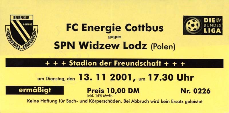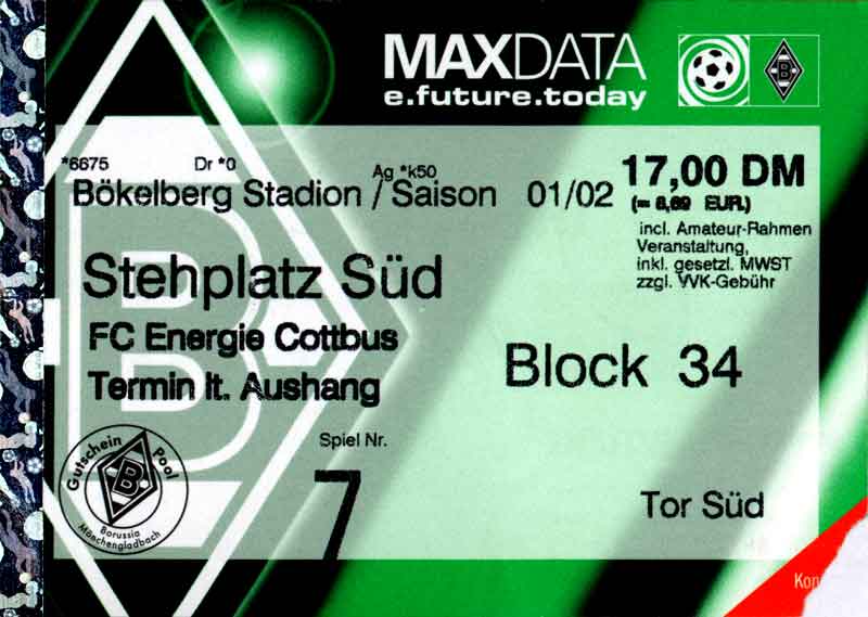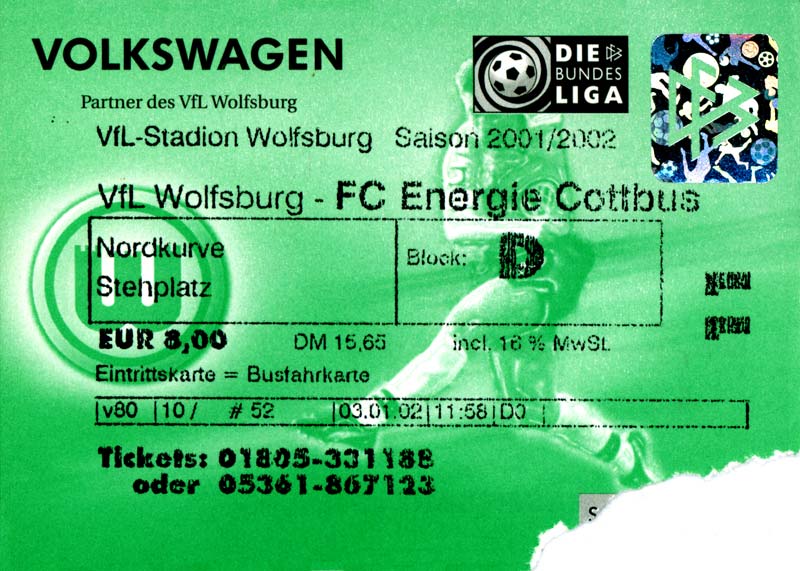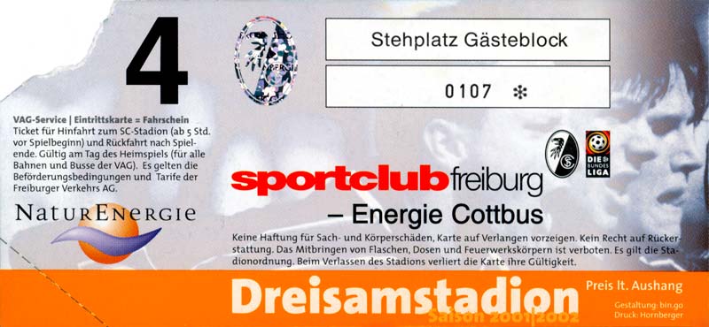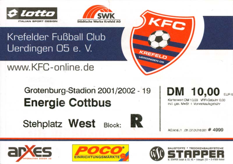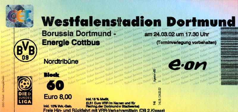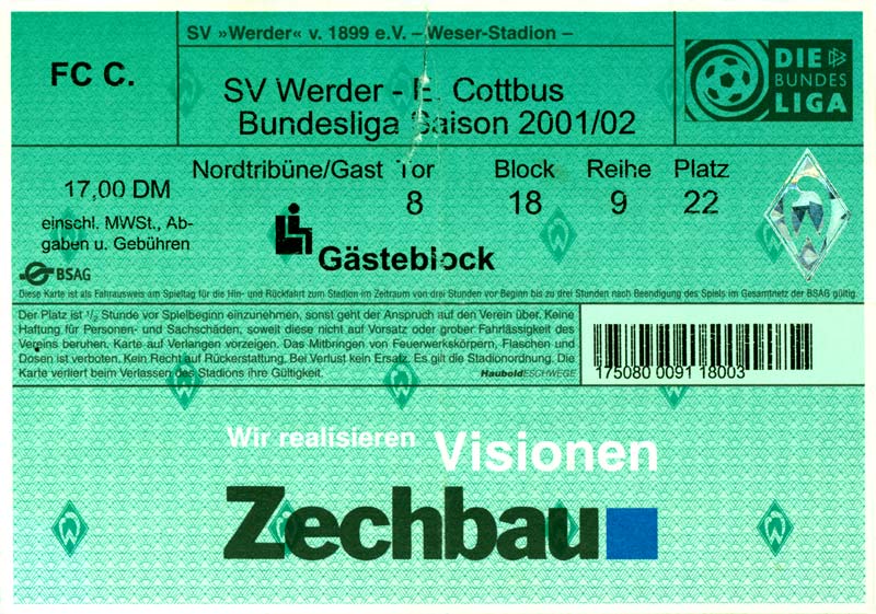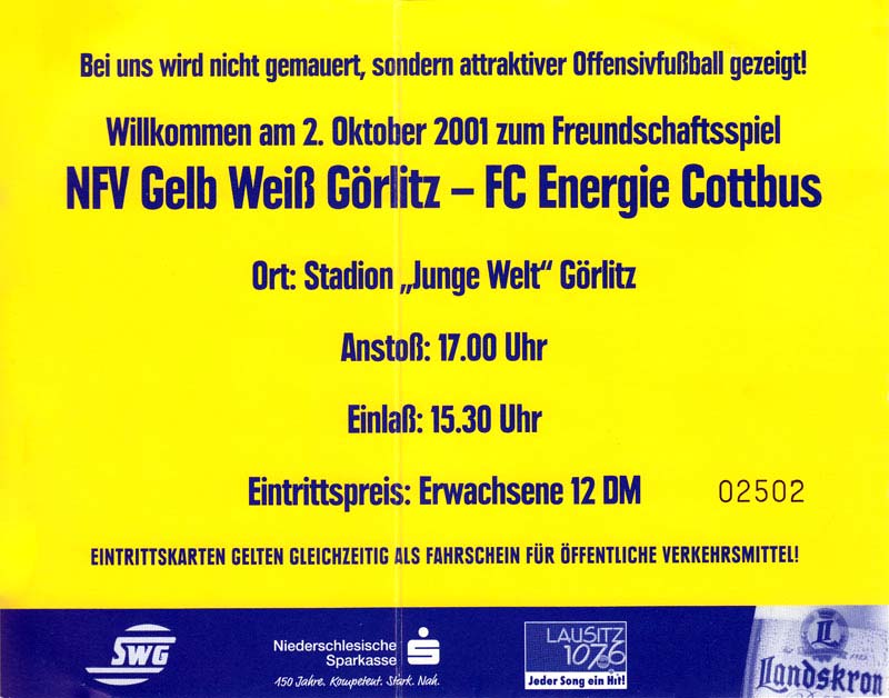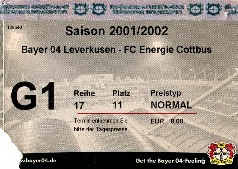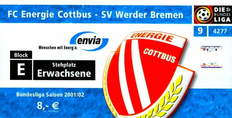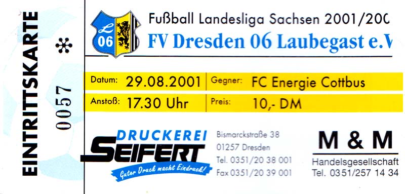 Eintrittskarten der 1. Mannschaft 26.06.2001, VfL Pirna-Copitz 07 (A)11.07.2001, MOKS Stomil Olstyn (N)14.07.2001, SV Babelsberg 03 (N)15.07.2001, 1. FC Magdeburg (H)17.07.2001, Rosenborg BK 1917 (H)21.07.2001, FC Erzgebirge Aue (H)22.07.2001, Dresdner SC 1898 (H)28.07.2001, Hamburger SV (H)04.08.2001, SV Werder Bremen (A)11.08.2001, 1. FC Nürnberg (H)15.08.2001, SC 1911 Großröhrsdorf (A)19.08.2001, Hertha BSC (A)25.08.2001, KFC Uerdingen 05 (A)29.08.2001, FV Dresden 06 Laubegast (A)08.09.2001, VfL Wolfsburg (H)16.09.2001, F.C. Hansa Rostock (A)22.09.2001, FC Bayern München (H)29.09.2001, FC Schalke 04 (A)02.10.2001, NFV Gelb-Weiß Görlitz 09 (A)13.10.2001, Bayer 04 Leverkusen (H)20.10.2001, FC St. Pauli 1910 (A)27.10.2001, BV Borussia 09 Dortmund (H)04.11.2001, SC Freiburg (A)13.11.2001, RTS Widzew Łódź (H)18.11.2001, Borussia VfL 1900 Mönchengladbach (A)24.11.2001, VfB Stuttgart 1893 (H)01.12.2001, TSV 1860 München (A)08.12.2001, 1. FC Kaiserslautern (H)15.12.2001, 1. FC Köln (A)18.12.2001, Hamburger SV (A)09.01.2002, FSV Glückauf Brieske-Senftenberg (H)22.01.2002, VfB Lichterfelde 1892 (H)27.01.2002, SV Werder Bremen (H)02.02.2002, 1. FC Nürnberg (A)05.02.2002, Hertha BSC (H)09.02.2002, VfL Wolfsburg (A)17.02.2002, F.C. Hansa Rostock (H)23.02.2002, FC Bayern München (A)02.03.2002, FC Schalke 04 (H)09.03.2002, Bayer 04 Leverkusen (A)16.03.2002, FC St. Pauli 1910 (H)24.03.2002, BV Borussia 09 Dortmund (A)30.03.2002, SC Freiburg (H)06.04.2002, Borussia VfL 1900 Mönchengladbach (H)14.04.2002, VfB Stuttgart 1893 (A)20.04.2002, TSV 1860 München (H)27.04.2002, 1. FC Kaiserslautern (A)04.05.2002, 1. FC Köln (H)10.05.2002, Greifswalder SC (A)22.05.2002, Eisenhüttenstädter FC Stahl (A)24.05.2002, Dresdner SC 1898 (N)