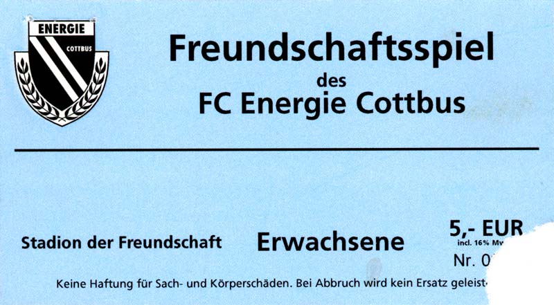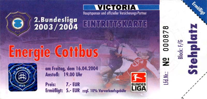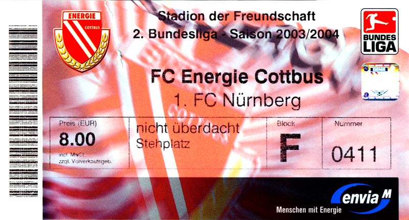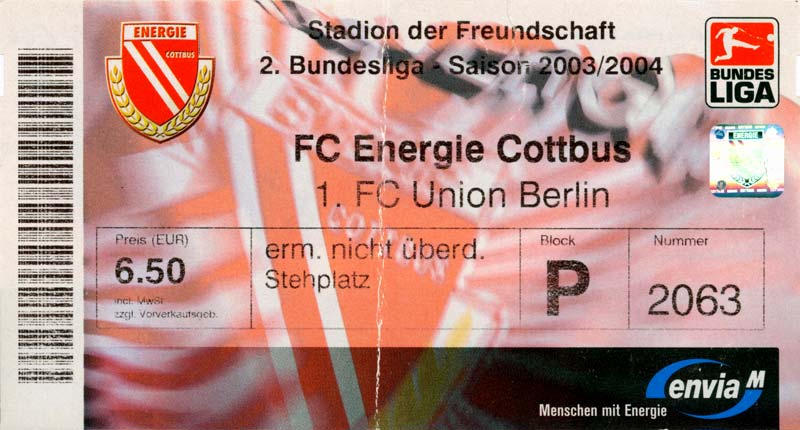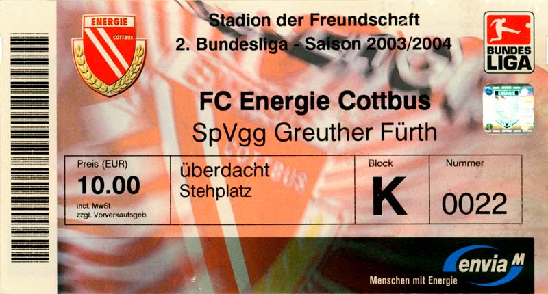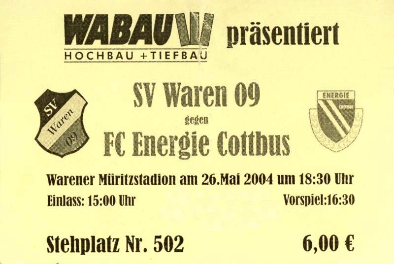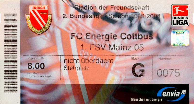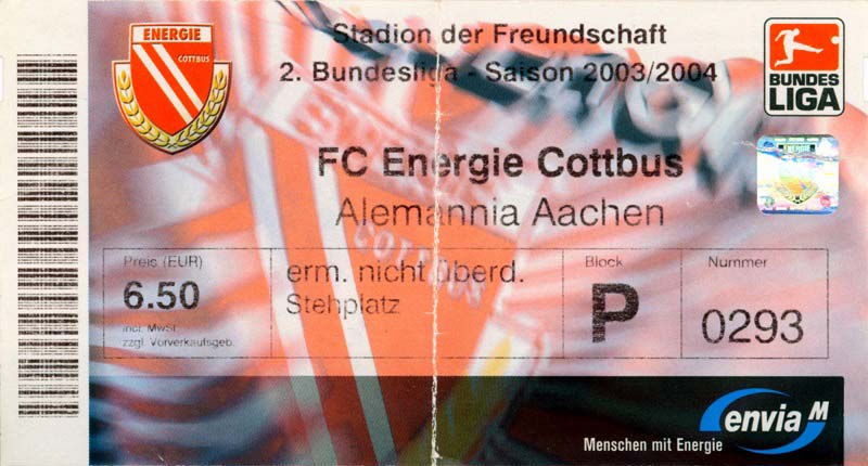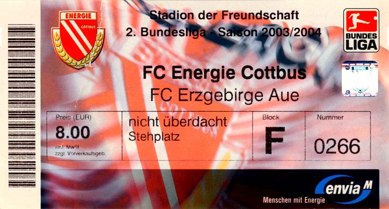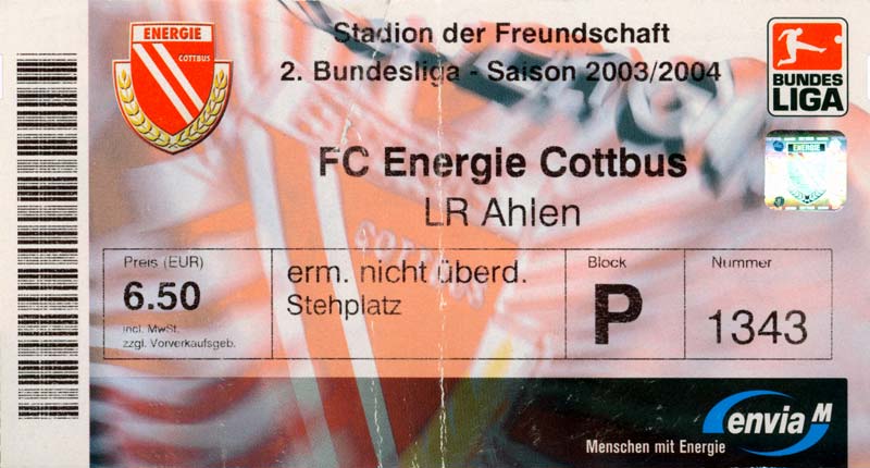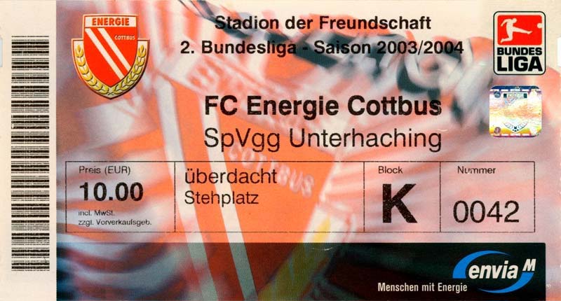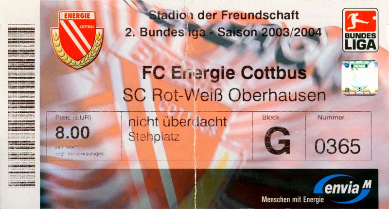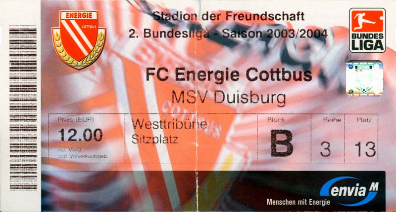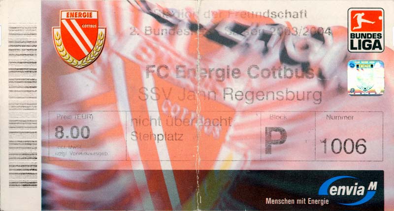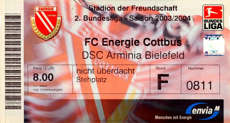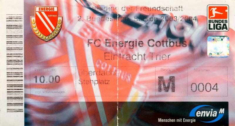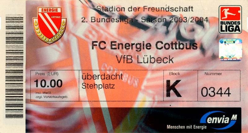 Eintrittskarten der 1. Mannschaft 05.07.2003, SG Sielow (A)06.07.2003, BSV Guben-Nord (A)09.07.2003, Eisenhüttenstädter FC Stahl (H)12.07.2003, ZSKA Sofia (H)26.07.2003, Chemnitzer FC (H)03.08.2003, SV Eintracht Trier 05 (H)10.08.2003, 1. FC Union Berlin (A)13.08.2003, FC Oberlausitz Neugersdorf (H)17.08.2003, TSV Alemannia Aachen (H)25.08.2003, 1. FC Nürnberg (A)29.08.2003, VfL Wolfsburg (A.) (A)07.09.2003, A-Nationalmannschaft Irak (H)14.09.2003, VfL Osnabrück 1899 (H)26.09.2003, LR Ahlen (H)03.10.2003, Karlsruher SC (A)19.10.2003, SV Wacker Burghausen (H)27.10.2003, 1. FSV Mainz 05 (A)31.10.2003, DSC Arminia Bielefeld (A)10.11.2003, FC Erzgebirge Aue (H)23.11.2003, SpVgg Greuther Fürth 1903 (A)28.11.2003, MSV Duisburg (H)07.12.2003, VfB Lübeck 1919 (A)14.12.2003, SpVgg Unterhaching (H)18.12.2003, SSV Jahn Regensburg (A)01.02.2004, SV Eintracht Trier 05 (A)09.02.2004, 1. FC Union Berlin (H)15.02.2004, TSV Alemannia Aachen (A)20.02.2004, 1. FC Nürnberg (H)29.02.2004, VfL Osnabrück 1899 (A)07.03.2004, SC Rot-Weiß Oberhausen 1904 (H)12.03.2004, LR Ahlen (A)19.03.2004, Karlsruher SC (H)26.03.2004, SV Wacker Burghausen (A)05.04.2004, 1. FSV Mainz 05 (H)08.04.2004, DSC Arminia Bielefeld (H)16.04.2004, FC Erzgebirge Aue (A)25.04.2004, SpVgg Greuther Fürth 1903 (H)02.05.2004, MSV Duisburg (A)09.05.2004, VfB Lübeck 1919 (H)16.05.2004, SpVgg Unterhaching (A)23.05.2004, SSV Jahn Regensburg (H)26.05.2004, SV Waren 09 (A)27.05.2004, FC Einheit Strasburg (A)