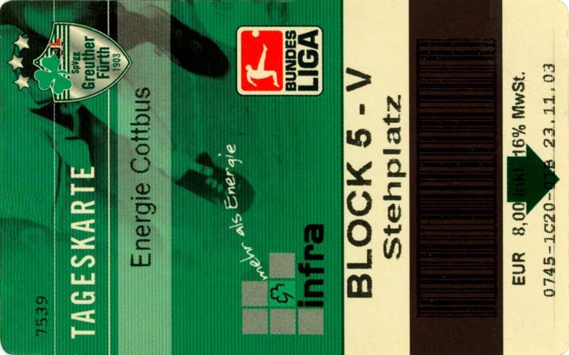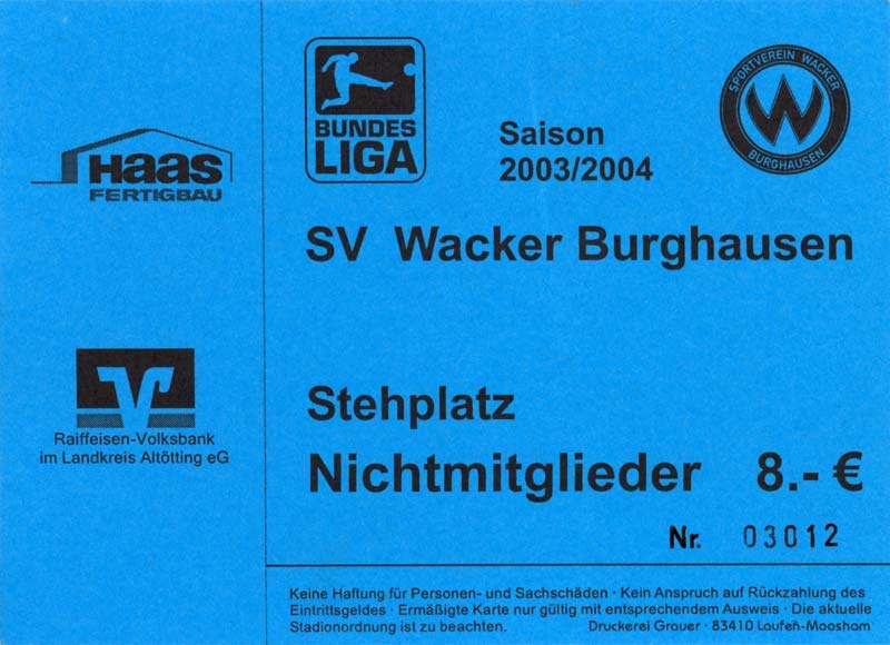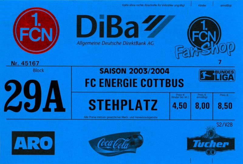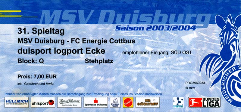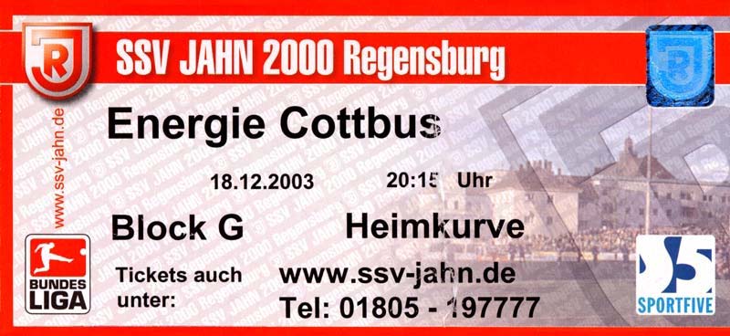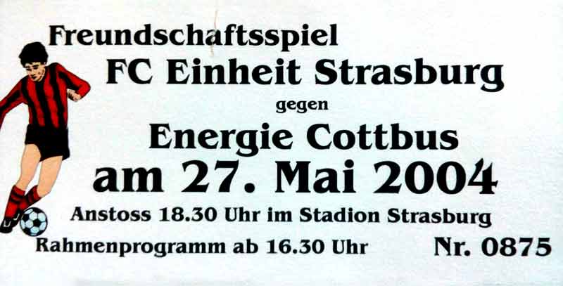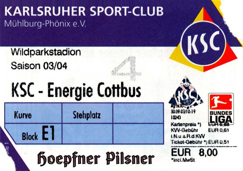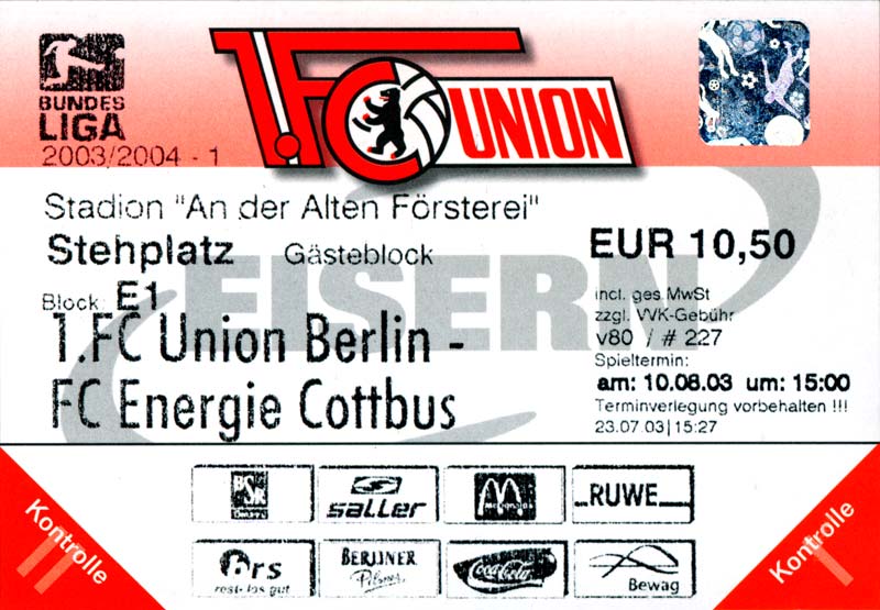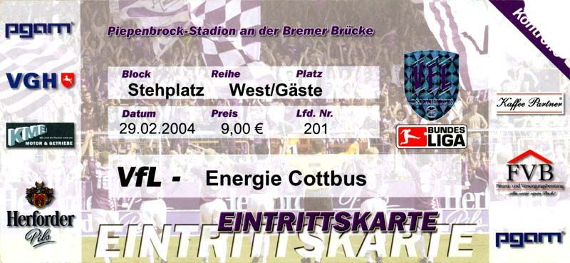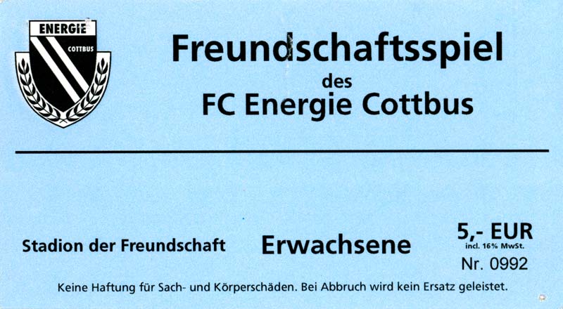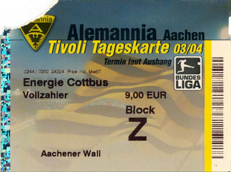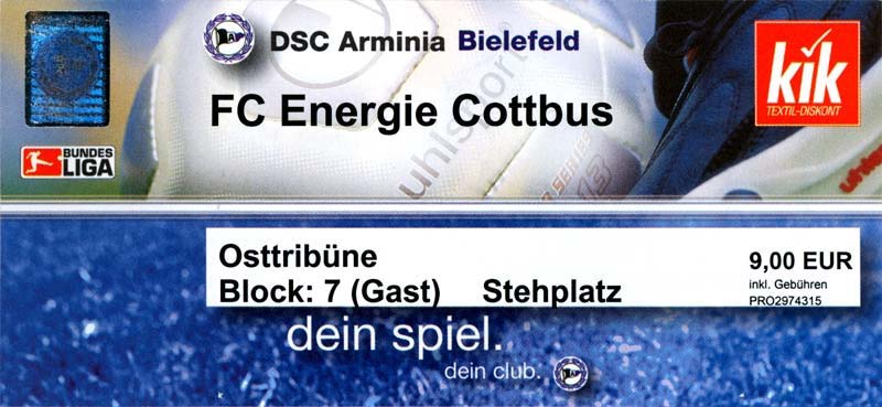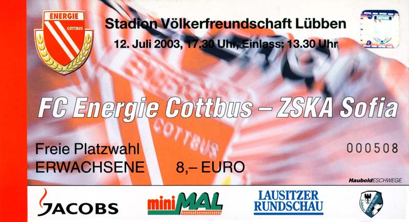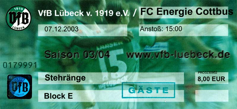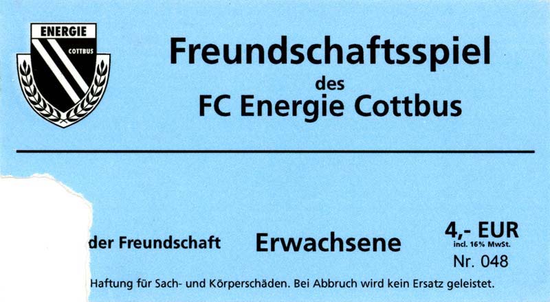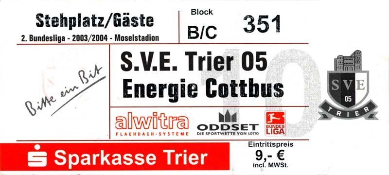 Eintrittskarten der 1. Mannschaft 05.07.2003, SG Sielow (A)06.07.2003, BSV Guben-Nord (A)09.07.2003, Eisenhüttenstädter FC Stahl (H)12.07.2003, ZSKA Sofia (H)26.07.2003, Chemnitzer FC (H)03.08.2003, SV Eintracht Trier 05 (H)10.08.2003, 1. FC Union Berlin (A)13.08.2003, FC Oberlausitz Neugersdorf (H)17.08.2003, TSV Alemannia Aachen (H)25.08.2003, 1. FC Nürnberg (A)29.08.2003, VfL Wolfsburg (A.) (A)07.09.2003, A-Nationalmannschaft Irak (H)14.09.2003, VfL Osnabrück 1899 (H)26.09.2003, LR Ahlen (H)03.10.2003, Karlsruher SC (A)19.10.2003, SV Wacker Burghausen (H)27.10.2003, 1. FSV Mainz 05 (A)31.10.2003, DSC Arminia Bielefeld (A)10.11.2003, FC Erzgebirge Aue (H)23.11.2003, SpVgg Greuther Fürth 1903 (A)28.11.2003, MSV Duisburg (H)07.12.2003, VfB Lübeck 1919 (A)14.12.2003, SpVgg Unterhaching (H)18.12.2003, SSV Jahn Regensburg (A)01.02.2004, SV Eintracht Trier 05 (A)09.02.2004, 1. FC Union Berlin (H)15.02.2004, TSV Alemannia Aachen (A)20.02.2004, 1. FC Nürnberg (H)29.02.2004, VfL Osnabrück 1899 (A)07.03.2004, SC Rot-Weiß Oberhausen 1904 (H)12.03.2004, LR Ahlen (A)19.03.2004, Karlsruher SC (H)26.03.2004, SV Wacker Burghausen (A)05.04.2004, 1. FSV Mainz 05 (H)08.04.2004, DSC Arminia Bielefeld (H)16.04.2004, FC Erzgebirge Aue (A)25.04.2004, SpVgg Greuther Fürth 1903 (H)02.05.2004, MSV Duisburg (A)09.05.2004, VfB Lübeck 1919 (H)16.05.2004, SpVgg Unterhaching (A)23.05.2004, SSV Jahn Regensburg (H)26.05.2004, SV Waren 09 (A)27.05.2004, FC Einheit Strasburg (A)