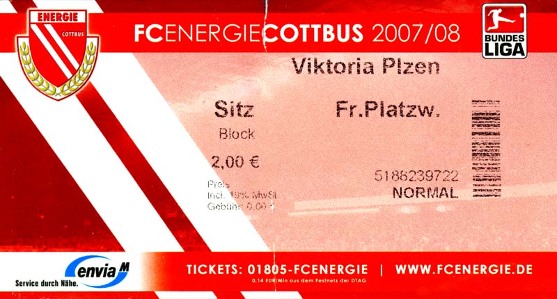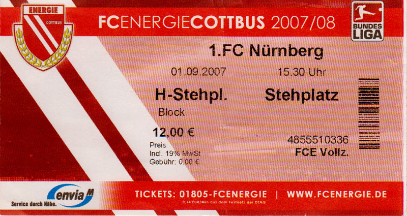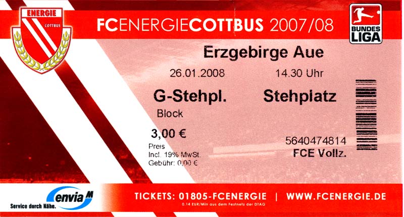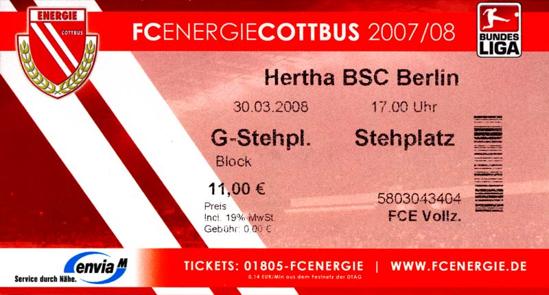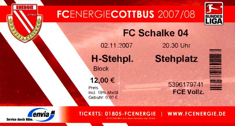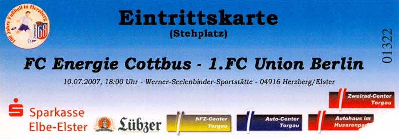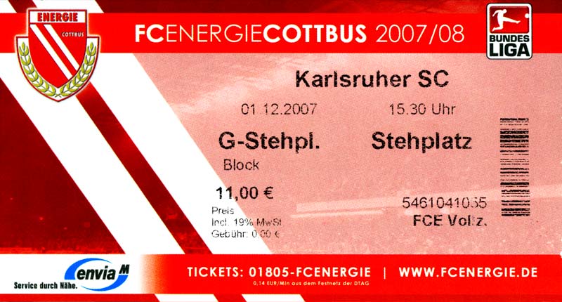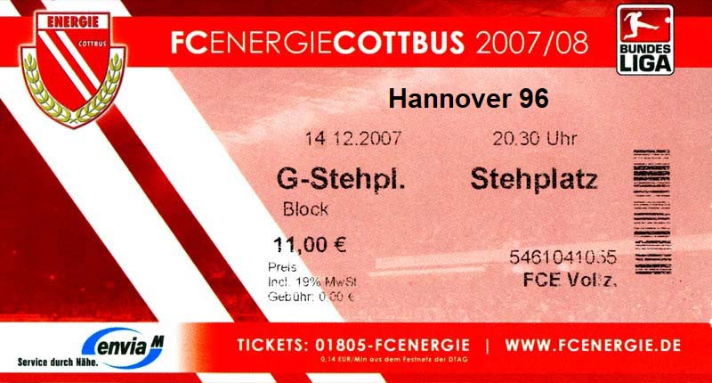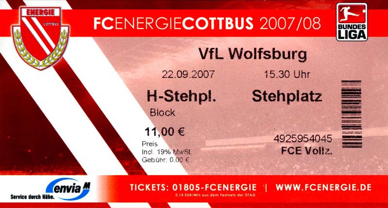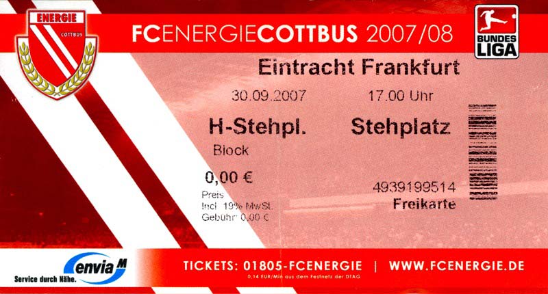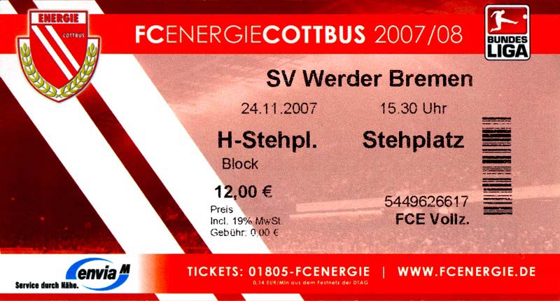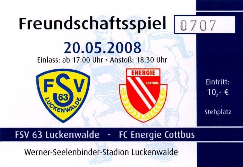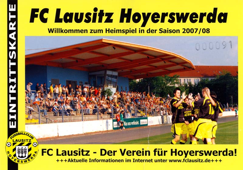 Eintrittskarten der 1. Mannschaft 07.07.2007, SV Empor Mühlberg (A)10.07.2007, 1. FC Union Berlin (N)12.07.2007, SG Frischauf Briesen 1912 (A)14.07.2007, FC Baník Ostrava (H)18.07.2007, SV Zehdenick 1920 (A)21.07.2007, Bohemians 1905 (N)23.07.2007, Leeds United AFC (N)28.07.2007, Chemnitzer FC (N)04.08.2007, Rot-Weiss Essen (A)11.08.2007, Bayer 04 Leverkusen (A)19.08.2007, VfL Bochum 1848 (H)25.08.2007, BV Borussia 09 Dortmund (A)01.09.2007, 1. FC Nürnberg (H)15.09.2007, VfB Stuttgart 1893 (A)22.09.2007, VfL Wolfsburg (H)26.09.2007, FC Bayern München (A)30.09.2007, Eintracht Frankfurt (H)02.10.2007, BSV Guben-Nord (A)06.10.2007, Hertha BSC (A)12.10.2007, FC Viktoria Plzeň (H)19.10.2007, MSV Duisburg (H)27.10.2007, DSC Arminia Bielefeld (A)02.11.2007, FC Schalke 04 (H)05.11.2007, MSV Hanse Frankfurt (Oder) (A)10.11.2007, F.C. Hansa Rostock (A)19.11.2007, SV Hertha Finsterwalde (A)24.11.2007, SV Werder Bremen (H)01.12.2007, Karlsruher SC (H)08.12.2007, Hamburger SV (A)14.12.2007, Hannover 96 (H)26.01.2008, FC Erzgebirge Aue (H)29.01.2008, SG Blau-Gelb Laubsdorf (A)02.02.2008, Bayer 04 Leverkusen (H)09.02.2008, VfL Bochum 1848 (A)16.02.2008, BV Borussia 09 Dortmund (H)24.02.2008, 1. FC Nürnberg (A)04.03.2008, SC Borea Dresden (N)08.03.2008, VfL Wolfsburg (A)11.03.2008, VfB Stuttgart 1893 (H)15.03.2008, FC Bayern München (H)20.03.2008, Eintracht Frankfurt (A)25.03.2008, Frankfurter FC Viktoria 91 (A)30.03.2008, Hertha BSC (H)04.04.2008, MSV Duisburg (A)12.04.2008, DSC Arminia Bielefeld (H)15.04.2008, FC Schalke 04 (A)18.04.2008, FC Lausitz Hoyerswerda (A)26.04.2008, F.C. Hansa Rostock (H)03.05.2008, SV Werder Bremen (A)06.05.2008, Karlsruher SC (A)10.05.2008, Hamburger SV (H)17.05.2008, Hannover 96 (A)20.05.2008, FSV 63 Luckenwalde (A)