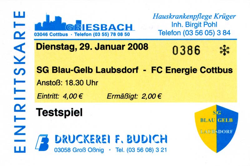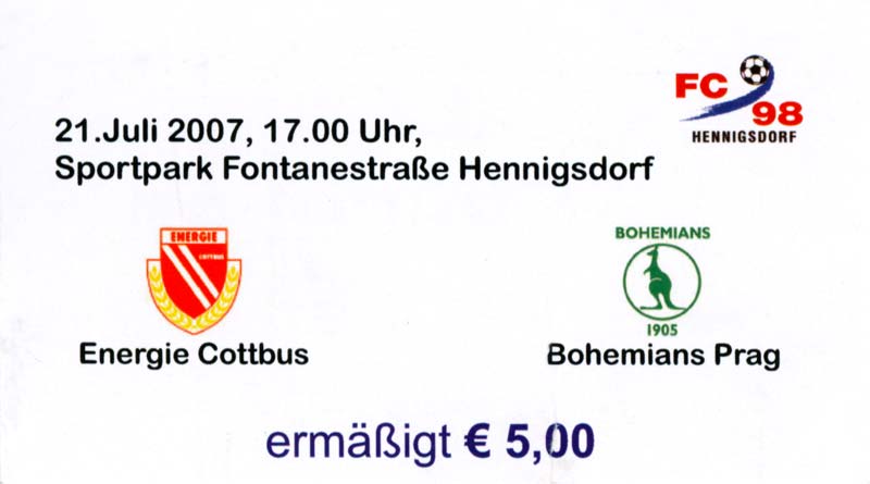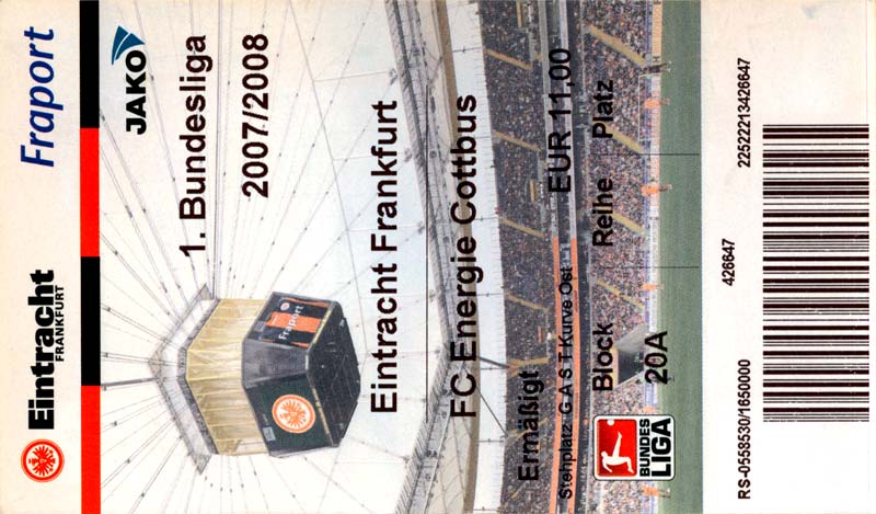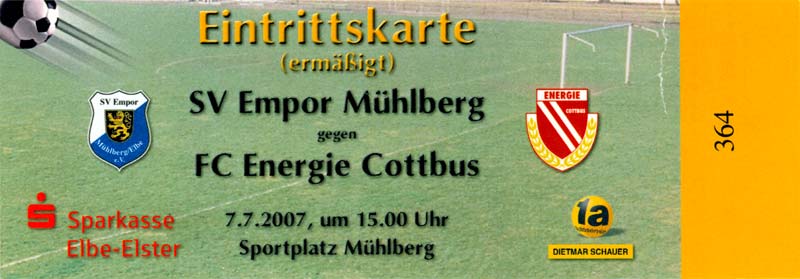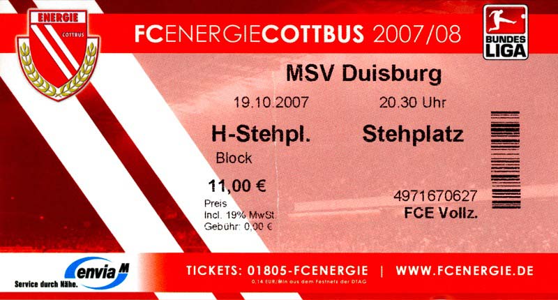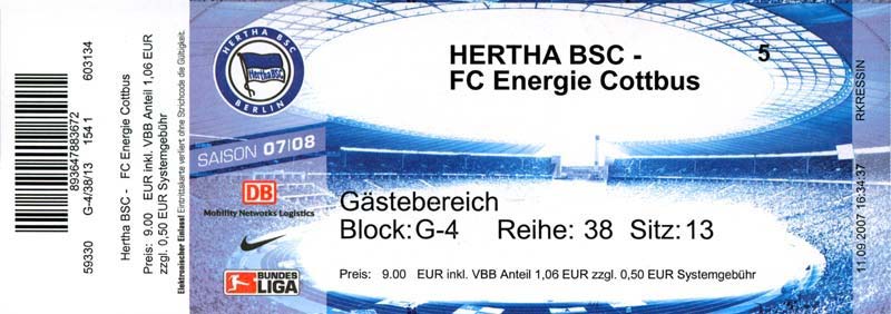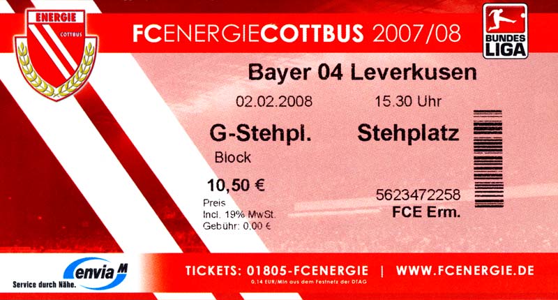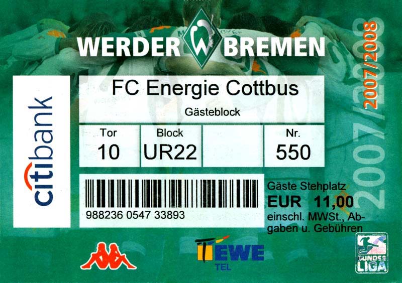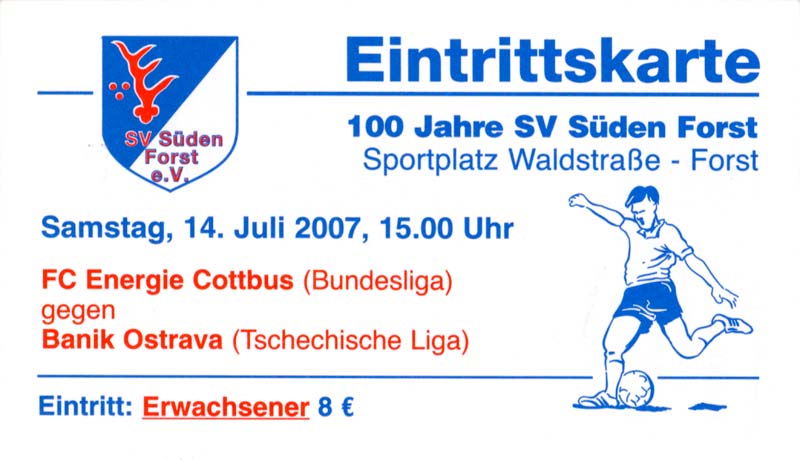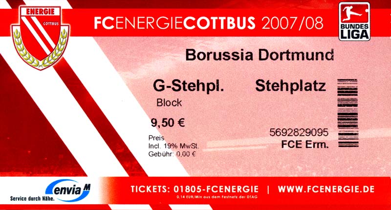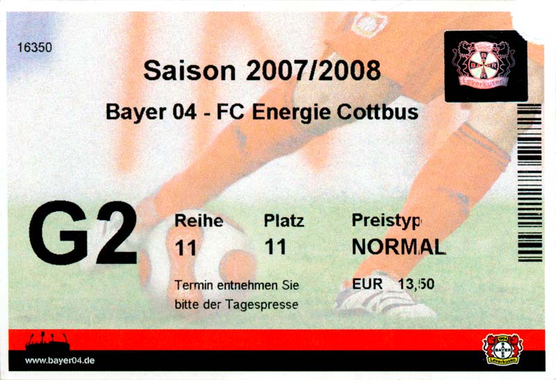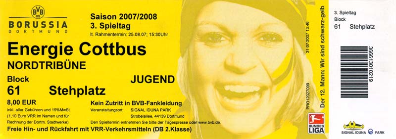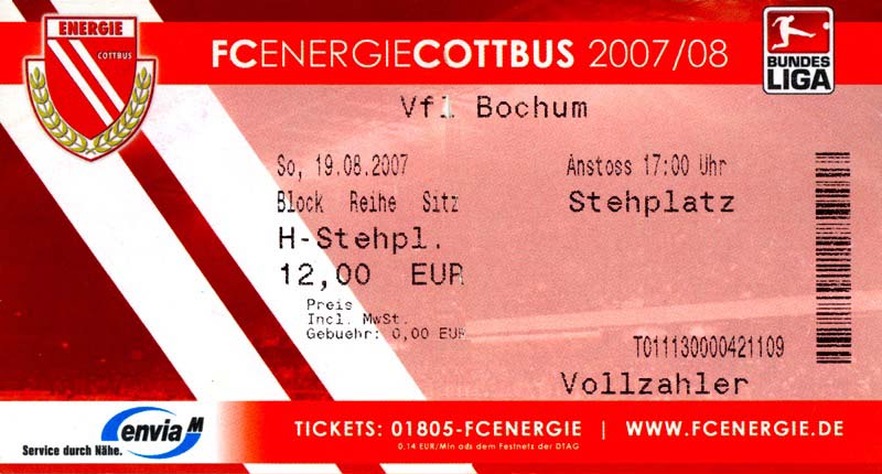 Eintrittskarten der 1. Mannschaft 07.07.2007, SV Empor Mühlberg (A)10.07.2007, 1. FC Union Berlin (N)12.07.2007, SG Frischauf Briesen 1912 (A)14.07.2007, FC Baník Ostrava (H)18.07.2007, SV Zehdenick 1920 (A)21.07.2007, Bohemians 1905 (N)23.07.2007, Leeds United AFC (N)28.07.2007, Chemnitzer FC (N)04.08.2007, Rot-Weiss Essen (A)11.08.2007, Bayer 04 Leverkusen (A)19.08.2007, VfL Bochum 1848 (H)25.08.2007, BV Borussia 09 Dortmund (A)01.09.2007, 1. FC Nürnberg (H)15.09.2007, VfB Stuttgart 1893 (A)22.09.2007, VfL Wolfsburg (H)26.09.2007, FC Bayern München (A)30.09.2007, Eintracht Frankfurt (H)02.10.2007, BSV Guben-Nord (A)06.10.2007, Hertha BSC (A)12.10.2007, FC Viktoria Plzeň (H)19.10.2007, MSV Duisburg (H)27.10.2007, DSC Arminia Bielefeld (A)02.11.2007, FC Schalke 04 (H)05.11.2007, MSV Hanse Frankfurt (Oder) (A)10.11.2007, F.C. Hansa Rostock (A)19.11.2007, SV Hertha Finsterwalde (A)24.11.2007, SV Werder Bremen (H)01.12.2007, Karlsruher SC (H)08.12.2007, Hamburger SV (A)14.12.2007, Hannover 96 (H)26.01.2008, FC Erzgebirge Aue (H)29.01.2008, SG Blau-Gelb Laubsdorf (A)02.02.2008, Bayer 04 Leverkusen (H)09.02.2008, VfL Bochum 1848 (A)16.02.2008, BV Borussia 09 Dortmund (H)24.02.2008, 1. FC Nürnberg (A)04.03.2008, SC Borea Dresden (N)08.03.2008, VfL Wolfsburg (A)11.03.2008, VfB Stuttgart 1893 (H)15.03.2008, FC Bayern München (H)20.03.2008, Eintracht Frankfurt (A)25.03.2008, Frankfurter FC Viktoria 91 (A)30.03.2008, Hertha BSC (H)04.04.2008, MSV Duisburg (A)12.04.2008, DSC Arminia Bielefeld (H)15.04.2008, FC Schalke 04 (A)18.04.2008, FC Lausitz Hoyerswerda (A)26.04.2008, F.C. Hansa Rostock (H)03.05.2008, SV Werder Bremen (A)06.05.2008, Karlsruher SC (A)10.05.2008, Hamburger SV (H)17.05.2008, Hannover 96 (A)20.05.2008, FSV 63 Luckenwalde (A)