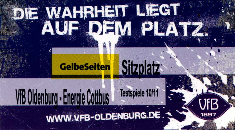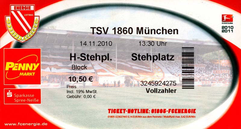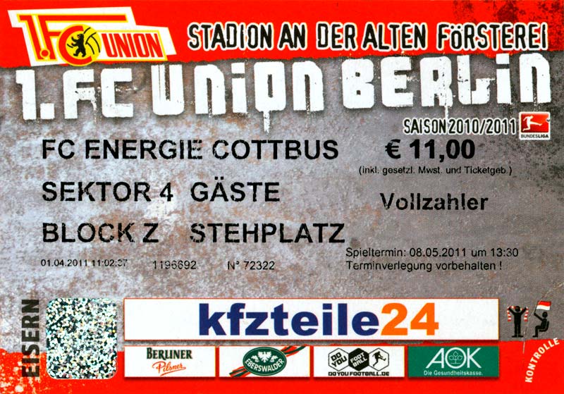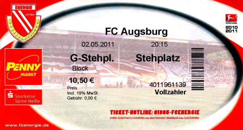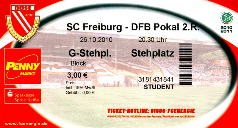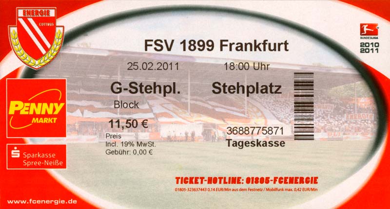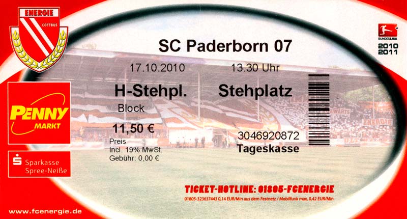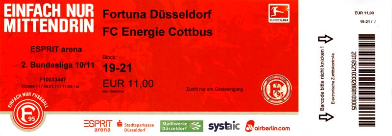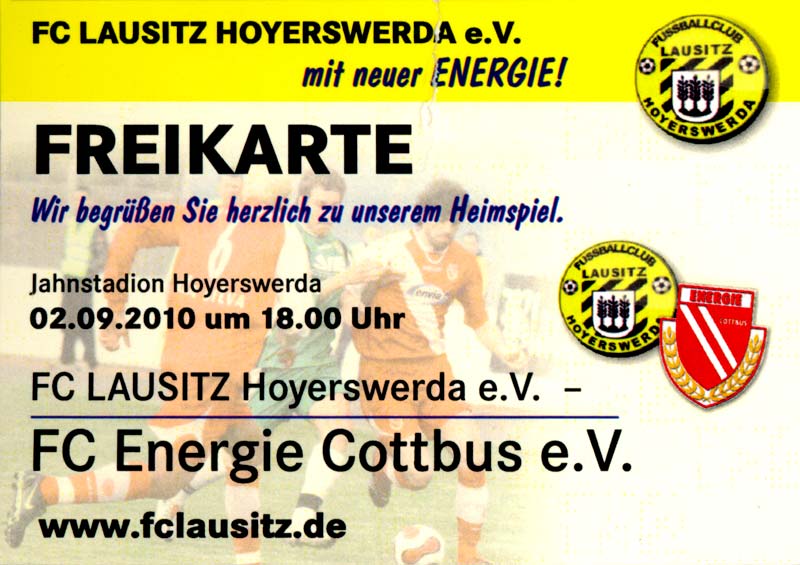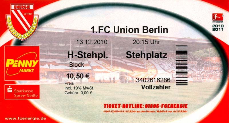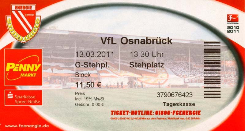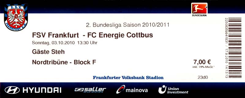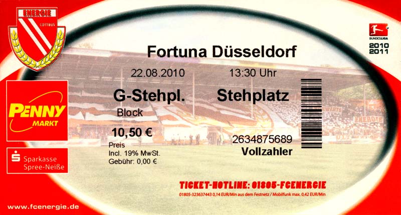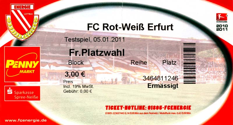 Eintrittskarten der 1. Mannschaft 04.07.2010, Kolkwitzer SV 1896 (A)13.07.2010, SV Wacker 09 Cottbus-Ströbitz (A)15.07.2010, FSV Glückauf Brieske-Senftenberg (A)17.07.2010, FC Carl Zeiss Jena (A)24.07.2010, SC Preußen 06 Münster (N)25.07.2010, VfB Oldenburg 1897 (A)03.08.2010, SG Blau-Gelb Laubsdorf (A)15.08.2010, TuS Heeslingen (A)22.08.2010, TSV Fortuna Düsseldorf (H)29.08.2010, DSC Arminia Bielefeld (A)02.09.2010, FC Lausitz Hoyerswerda (A)07.09.2010, FK Teplice (H)17.09.2010, TSV Alemannia Aachen (A)03.10.2010, FSV Frankfurt 1899 (A)17.10.2010, SC Paderborn 07 (H)22.10.2010, VfL Osnabrück 1899 (A)26.10.2010, SC Freiburg (H)31.10.2010, VfL Bochum 1848 (H)05.11.2010, FC Ingolstadt 04 (A)14.11.2010, TSV 1860 München (H)22.11.2010, MSV Duisburg (A)28.11.2010, FC Erzgebirge Aue (H)04.12.2010, FC Augsburg 1907 (A)13.12.2010, 1. FC Union Berlin (H)19.12.2010, SC Rot-Weiß Oberhausen 1904 (A)22.12.2010, VfL Wolfsburg (A)05.01.2011, FC Rot-Weiß Erfurt (H)08.01.2011, KS Polonia Bytom (H)15.01.2011, TSV Fortuna Düsseldorf (A)22.01.2011, DSC Arminia Bielefeld (H)26.01.2011, TSG 1899 Hoffenheim (H)30.01.2011, Karlsruher SC (A)04.02.2011, TSV Alemannia Aachen (H)12.02.2011, SpVgg Greuther Fürth 1903 (A)21.02.2011, Hertha BSC (A)25.02.2011, FSV Frankfurt 1899 (H)01.03.2011, MSV Duisburg (A)05.03.2011, SC Paderborn 07 (A)13.03.2011, VfL Osnabrück 1899 (H)21.03.2011, VfL Bochum 1848 (A)01.04.2011, FC Ingolstadt 04 (H)09.04.2011, TSV 1860 München (A)16.04.2011, MSV Duisburg (H)21.04.2011, FC Erzgebirge Aue (A)02.05.2011, FC Augsburg 1907 (H)08.05.2011, 1. FC Union Berlin (A)15.05.2011, SC Rot-Weiß Oberhausen 1904 (H)