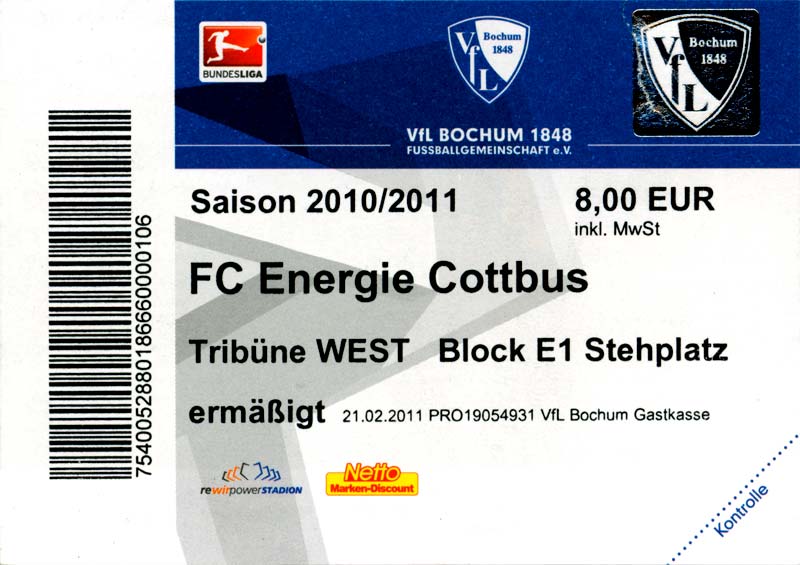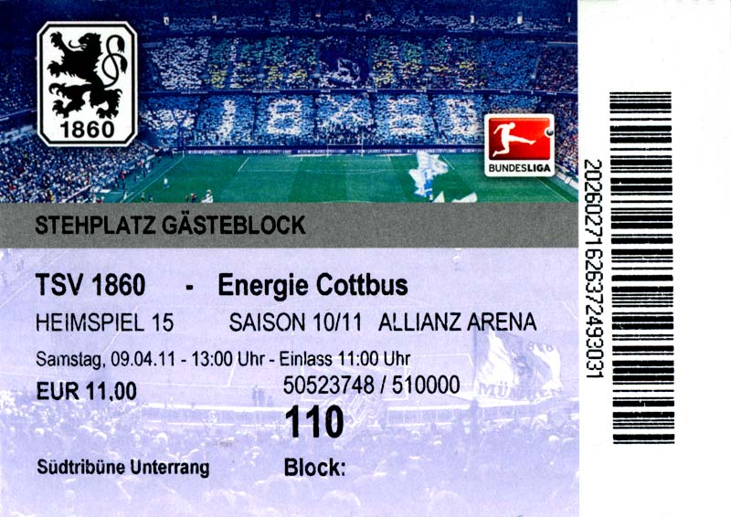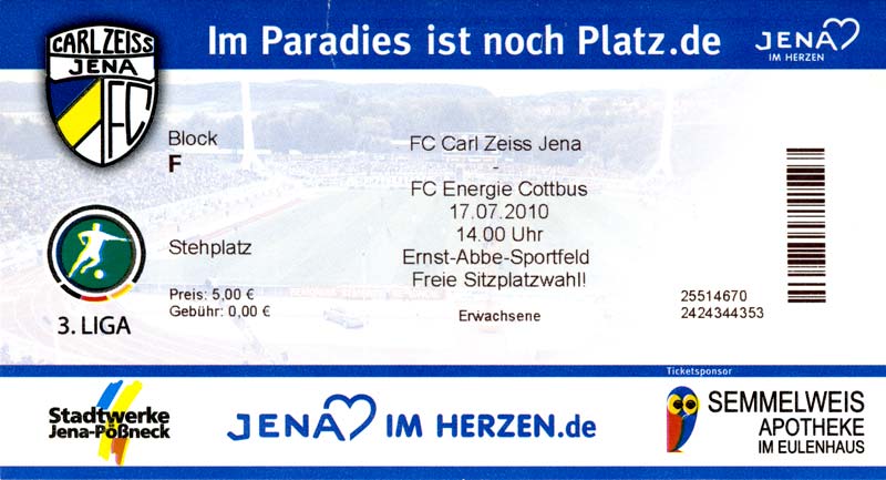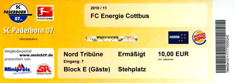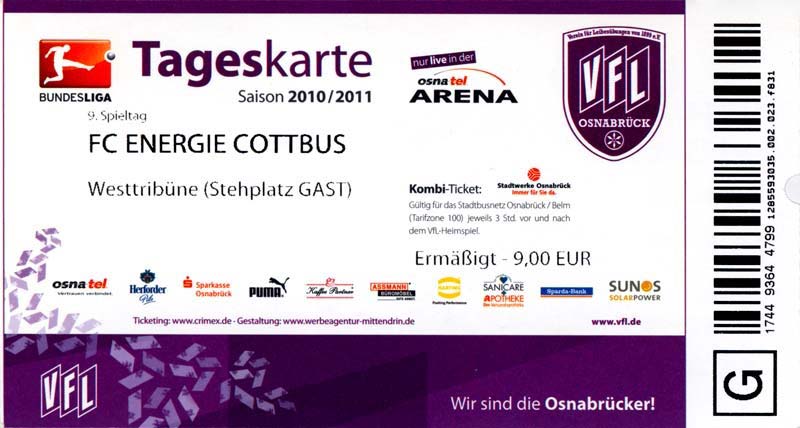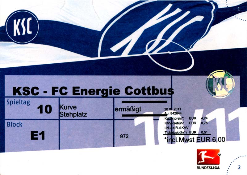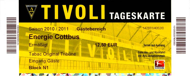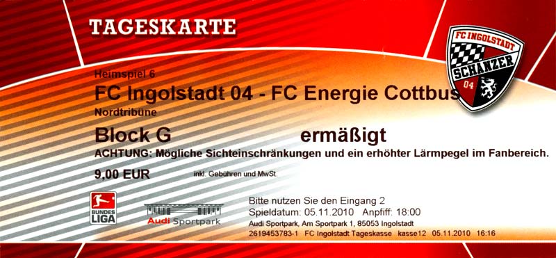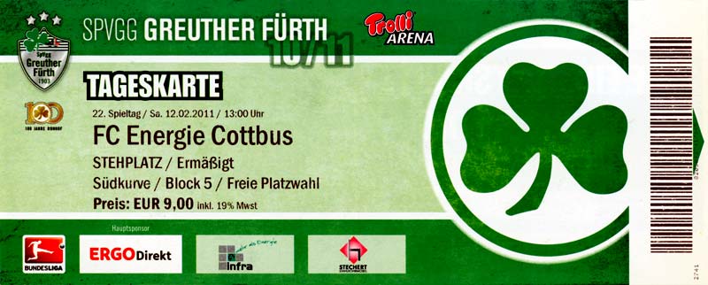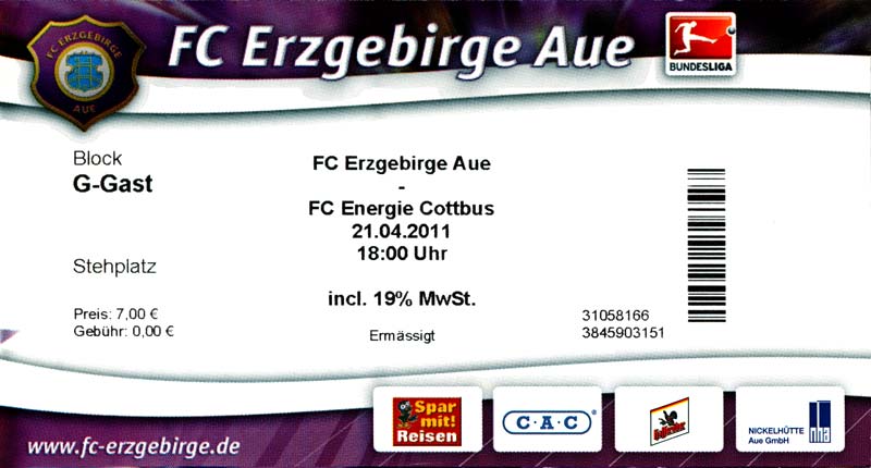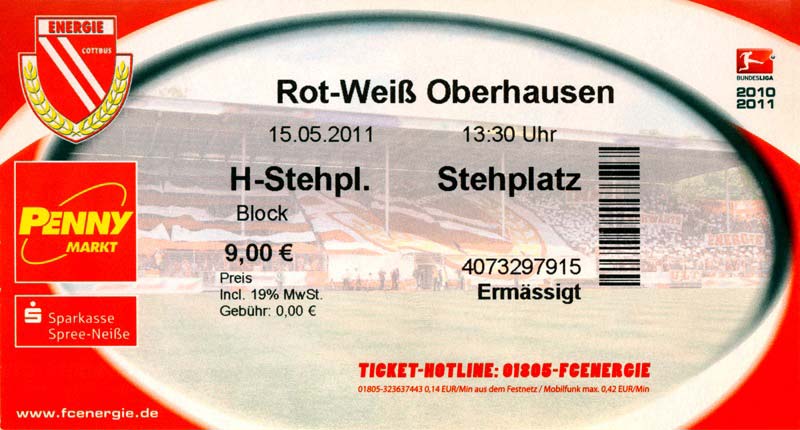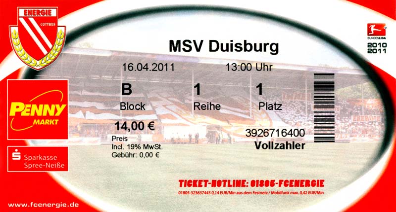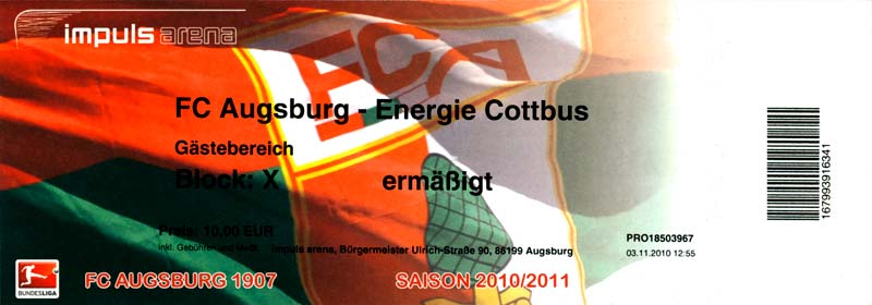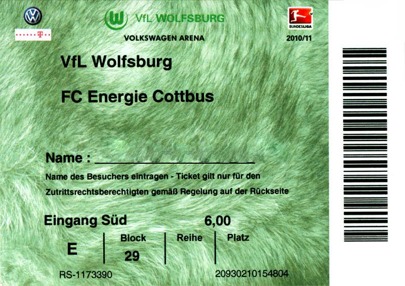 Eintrittskarten der 1. Mannschaft 04.07.2010, Kolkwitzer SV 1896 (A)13.07.2010, SV Wacker 09 Cottbus-Ströbitz (A)15.07.2010, FSV Glückauf Brieske-Senftenberg (A)17.07.2010, FC Carl Zeiss Jena (A)24.07.2010, SC Preußen 06 Münster (N)25.07.2010, VfB Oldenburg 1897 (A)03.08.2010, SG Blau-Gelb Laubsdorf (A)15.08.2010, TuS Heeslingen (A)22.08.2010, TSV Fortuna Düsseldorf (H)29.08.2010, DSC Arminia Bielefeld (A)02.09.2010, FC Lausitz Hoyerswerda (A)07.09.2010, FK Teplice (H)17.09.2010, TSV Alemannia Aachen (A)03.10.2010, FSV Frankfurt 1899 (A)17.10.2010, SC Paderborn 07 (H)22.10.2010, VfL Osnabrück 1899 (A)26.10.2010, SC Freiburg (H)31.10.2010, VfL Bochum 1848 (H)05.11.2010, FC Ingolstadt 04 (A)14.11.2010, TSV 1860 München (H)22.11.2010, MSV Duisburg (A)28.11.2010, FC Erzgebirge Aue (H)04.12.2010, FC Augsburg 1907 (A)13.12.2010, 1. FC Union Berlin (H)19.12.2010, SC Rot-Weiß Oberhausen 1904 (A)22.12.2010, VfL Wolfsburg (A)05.01.2011, FC Rot-Weiß Erfurt (H)08.01.2011, KS Polonia Bytom (H)15.01.2011, TSV Fortuna Düsseldorf (A)22.01.2011, DSC Arminia Bielefeld (H)26.01.2011, TSG 1899 Hoffenheim (H)30.01.2011, Karlsruher SC (A)04.02.2011, TSV Alemannia Aachen (H)12.02.2011, SpVgg Greuther Fürth 1903 (A)21.02.2011, Hertha BSC (A)25.02.2011, FSV Frankfurt 1899 (H)01.03.2011, MSV Duisburg (A)05.03.2011, SC Paderborn 07 (A)13.03.2011, VfL Osnabrück 1899 (H)21.03.2011, VfL Bochum 1848 (A)01.04.2011, FC Ingolstadt 04 (H)09.04.2011, TSV 1860 München (A)16.04.2011, MSV Duisburg (H)21.04.2011, FC Erzgebirge Aue (A)02.05.2011, FC Augsburg 1907 (H)08.05.2011, 1. FC Union Berlin (A)15.05.2011, SC Rot-Weiß Oberhausen 1904 (H)