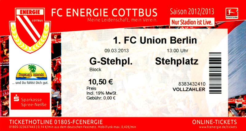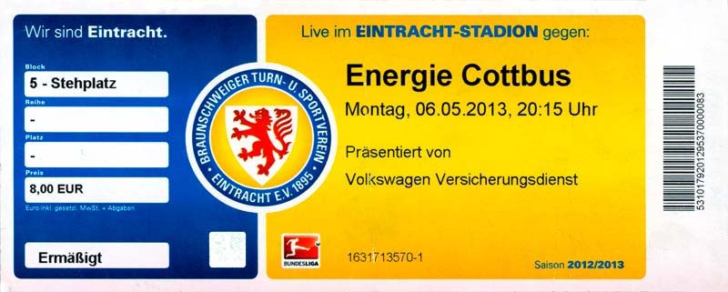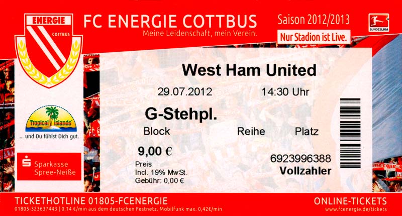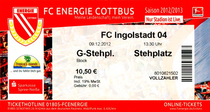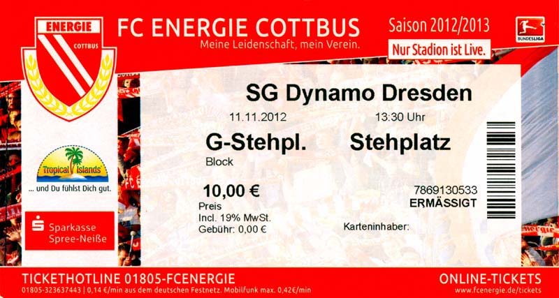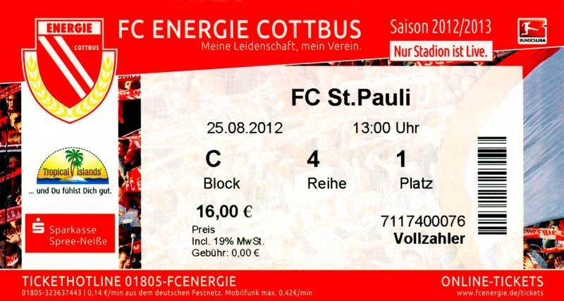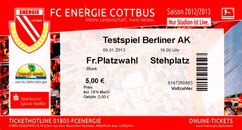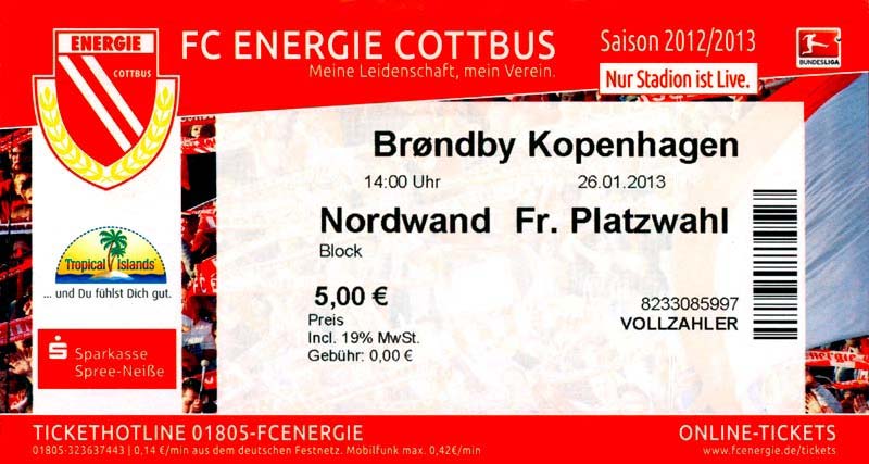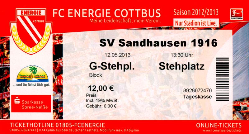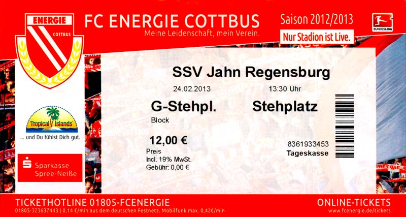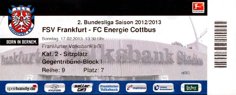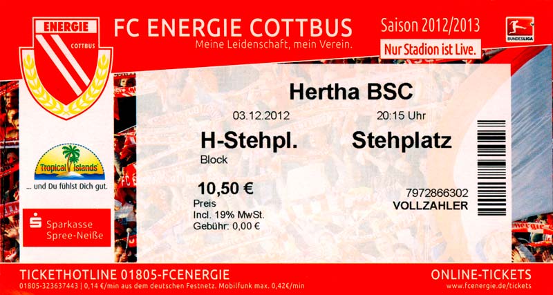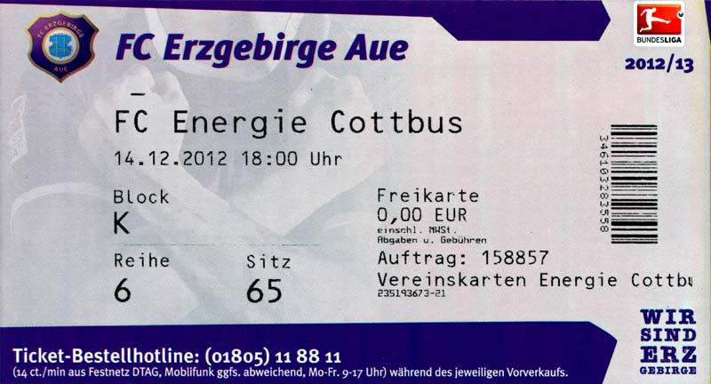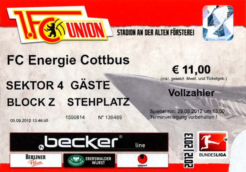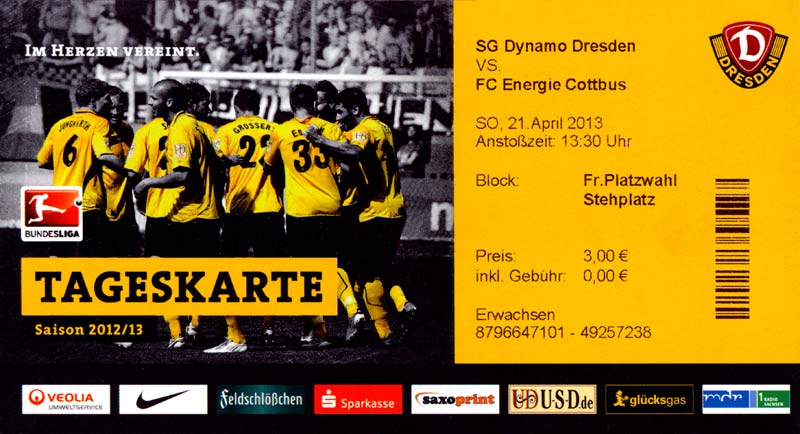 Eintrittskarten der 1. Mannschaft 04.07.2012, SG Burg/Spreewald (A)14.07.2012, VfB Weißwasser 1909 (A)20.07.2012, SV Werder Bremen (N)27.07.2012, SG Blau-Gelb Laubsdorf (H)29.07.2012, West Ham United F.C. (H)03.08.2012, FC Ingolstadt 04 (A)10.08.2012, FC Erzgebirge Aue (H)20.08.2012, SV Sandhausen 1916 (A)25.08.2012, FC St. Pauli 1910 (H)31.08.2012, 1. FC Köln (A)08.09.2012, Zagłębie Lubin (H)14.09.2012, FSV Frankfurt 1899 (H)22.09.2012, SSV Jahn Regensburg (A)25.09.2012, SC Paderborn 07 (H)29.09.2012, 1. FC Union Berlin (A)06.10.2012, MSV Duisburg (H)21.10.2012, VfR Aalen 1921 (A)26.10.2012, TSV 1860 München (H)04.11.2012, VfL Bochum 1848 (A)11.11.2012, SG Dynamo Dresden (H)16.11.2012, 1. FC Kaiserslautern (A)24.11.2012, TSV Eintracht Braunschweig (H)28.11.2012, SV Sandhausen 1916 (A)03.12.2012, Hertha BSC (H)09.12.2012, FC Ingolstadt 04 (H)14.12.2012, FC Erzgebirge Aue (A)09.01.2013, Berliner AK 07 (H)26.01.2013, Brøndby IF (H)03.02.2013, FC St. Pauli 1910 (A)09.02.2013, 1. FC Köln (H)17.02.2013, FSV Frankfurt 1899 (A)24.02.2013, SSV Jahn Regensburg (H)01.03.2013, SC Paderborn 07 (A)09.03.2013, 1. FC Union Berlin (H)15.03.2013, MSV Duisburg (A)28.03.2013, VfR Aalen 1921 (H)07.04.2013, TSV 1860 München (A)14.04.2013, VfL Bochum 1848 (H)21.04.2013, SG Dynamo Dresden (A)29.04.2013, 1. FC Kaiserslautern (H)06.05.2013, TSV Eintracht Braunschweig (A)12.05.2013, SV Sandhausen 1916 (H)19.05.2013, Hertha BSC (A)