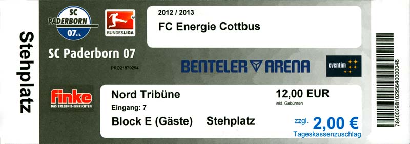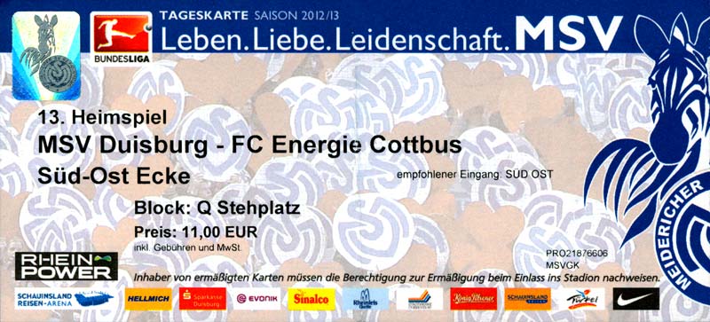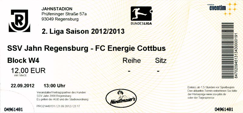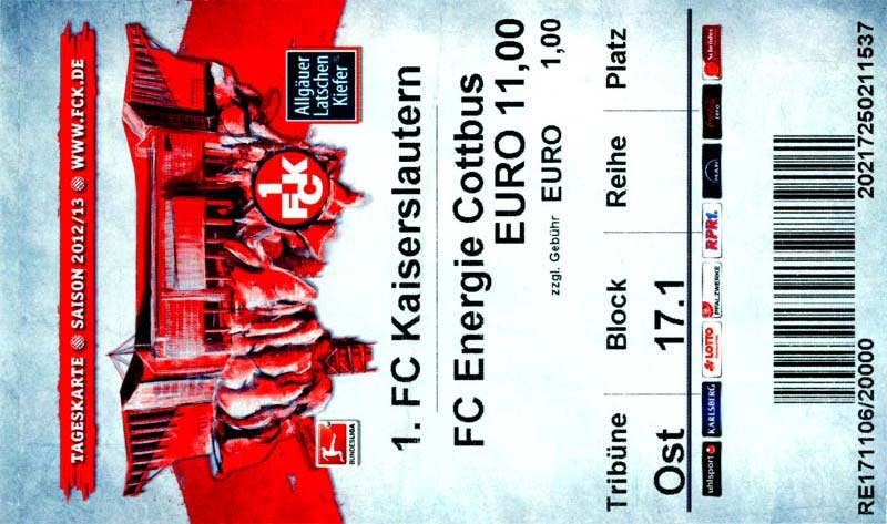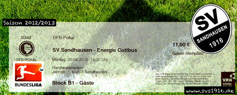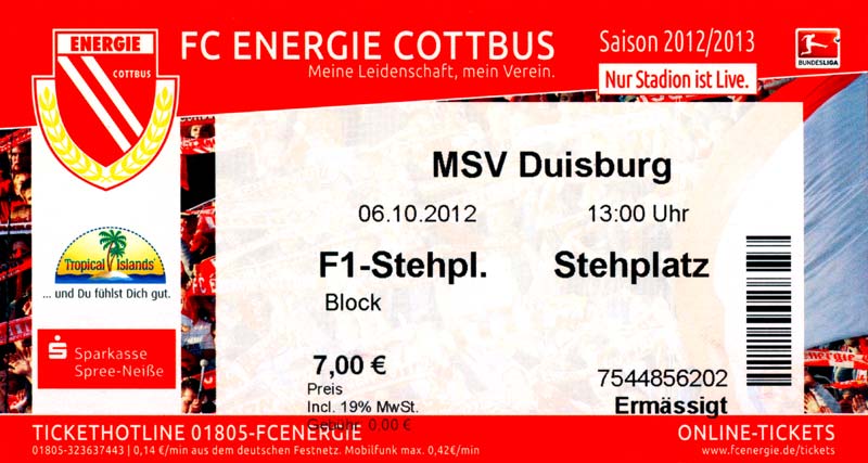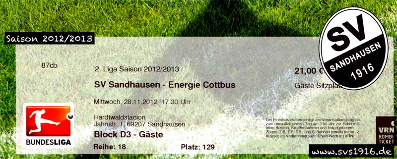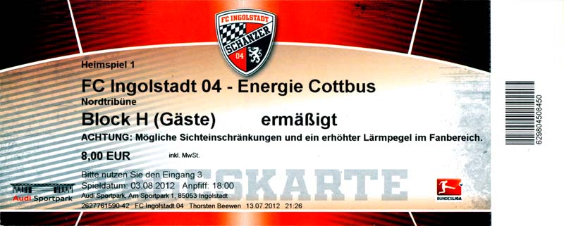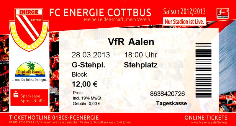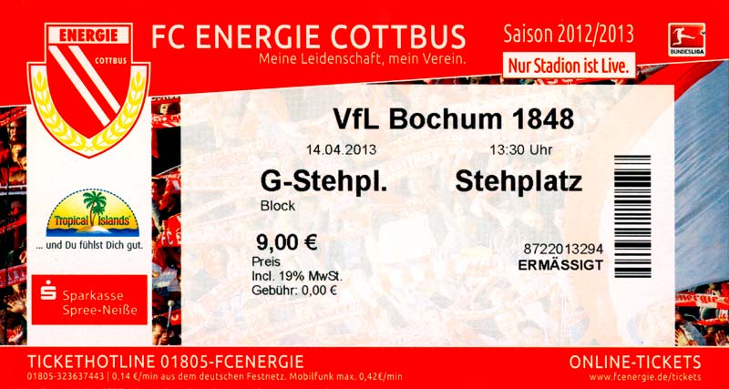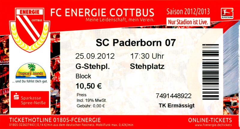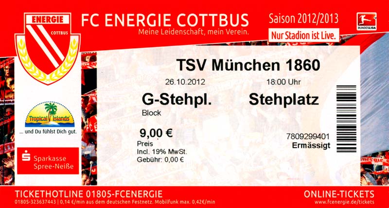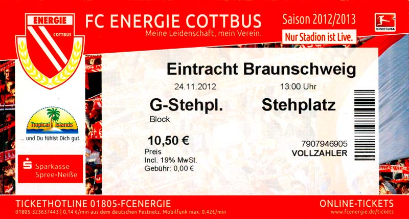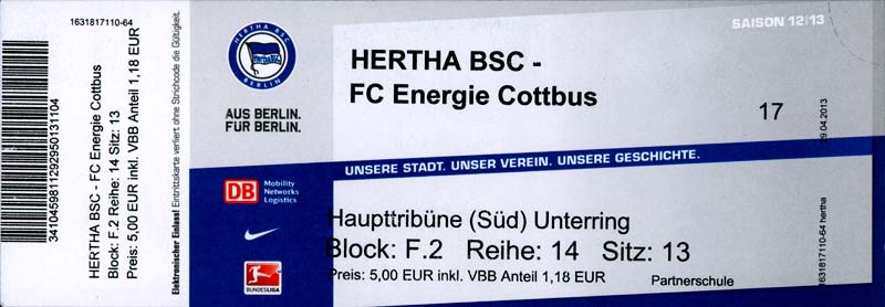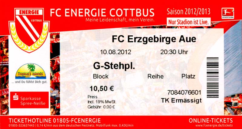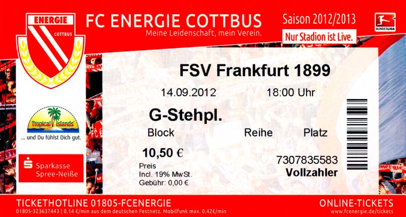 Eintrittskarten der 1. Mannschaft 04.07.2012, SG Burg/Spreewald (A)14.07.2012, VfB Weißwasser 1909 (A)20.07.2012, SV Werder Bremen (N)27.07.2012, SG Blau-Gelb Laubsdorf (H)29.07.2012, West Ham United F.C. (H)03.08.2012, FC Ingolstadt 04 (A)10.08.2012, FC Erzgebirge Aue (H)20.08.2012, SV Sandhausen 1916 (A)25.08.2012, FC St. Pauli 1910 (H)31.08.2012, 1. FC Köln (A)08.09.2012, Zagłębie Lubin (H)14.09.2012, FSV Frankfurt 1899 (H)22.09.2012, SSV Jahn Regensburg (A)25.09.2012, SC Paderborn 07 (H)29.09.2012, 1. FC Union Berlin (A)06.10.2012, MSV Duisburg (H)21.10.2012, VfR Aalen 1921 (A)26.10.2012, TSV 1860 München (H)04.11.2012, VfL Bochum 1848 (A)11.11.2012, SG Dynamo Dresden (H)16.11.2012, 1. FC Kaiserslautern (A)24.11.2012, TSV Eintracht Braunschweig (H)28.11.2012, SV Sandhausen 1916 (A)03.12.2012, Hertha BSC (H)09.12.2012, FC Ingolstadt 04 (H)14.12.2012, FC Erzgebirge Aue (A)09.01.2013, Berliner AK 07 (H)26.01.2013, Brøndby IF (H)03.02.2013, FC St. Pauli 1910 (A)09.02.2013, 1. FC Köln (H)17.02.2013, FSV Frankfurt 1899 (A)24.02.2013, SSV Jahn Regensburg (H)01.03.2013, SC Paderborn 07 (A)09.03.2013, 1. FC Union Berlin (H)15.03.2013, MSV Duisburg (A)28.03.2013, VfR Aalen 1921 (H)07.04.2013, TSV 1860 München (A)14.04.2013, VfL Bochum 1848 (H)21.04.2013, SG Dynamo Dresden (A)29.04.2013, 1. FC Kaiserslautern (H)06.05.2013, TSV Eintracht Braunschweig (A)12.05.2013, SV Sandhausen 1916 (H)19.05.2013, Hertha BSC (A)