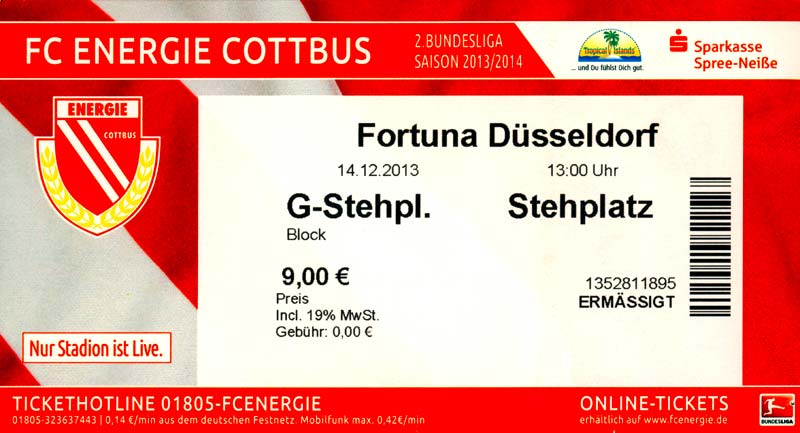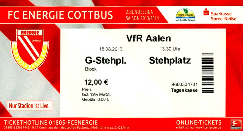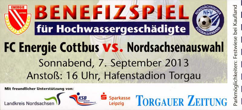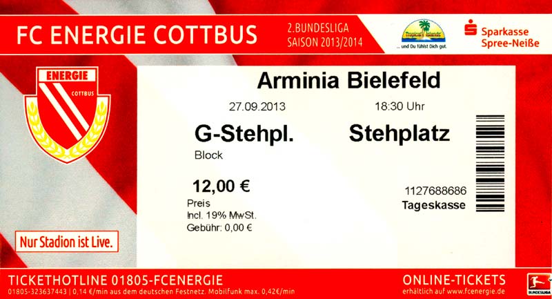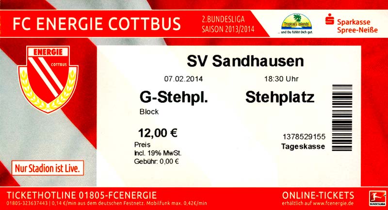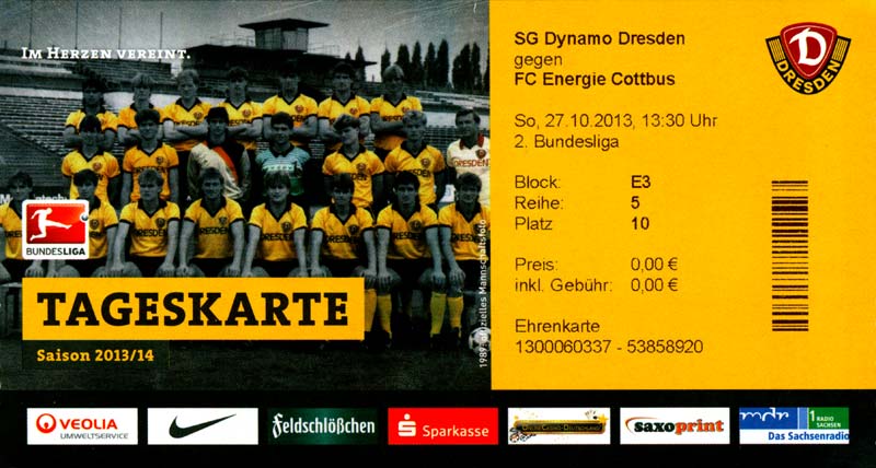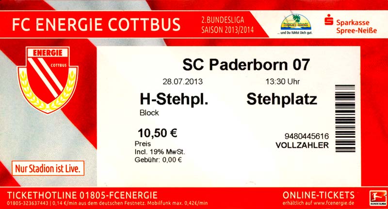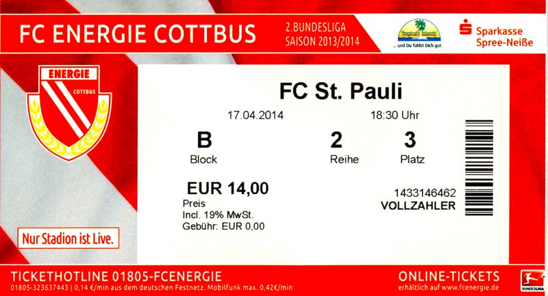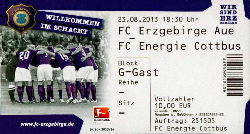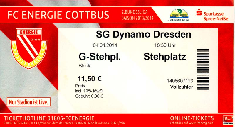 Eintrittskarten der 1. Mannschaft 23.06.2013, Müllroser SV 1898 (A)12.07.2013, Dundee United FC (H)17.07.2013, FC Bad Liebenwerda (A)22.07.2013, TSV Fortuna Düsseldorf (A)28.07.2013, SC Paderborn 07 (H)03.08.2013, 1. FC Magdeburg (A)11.08.2013, SV Sandhausen 1916 (A)18.08.2013, VfR Aalen 1921 (H)23.08.2013, FC Erzgebirge Aue (A)02.09.2013, 1. FC Kaiserslautern (A)07.09.2013, Kreisauswahl Nordsachsen (A)16.09.2013, 1. FC Köln (H)20.09.2013, Karlsruher SC (A)24.09.2013, TSG 1899 Hoffenheim (A)27.09.2013, DSC Arminia Bielefeld (H)06.10.2013, TSV 1860 München (A)11.10.2013, FSV Glückauf Brieske-Senftenberg (A)18.10.2013, 1. FC Union Berlin (H)27.10.2013, SG Dynamo Dresden (A)01.11.2013, VfL Bochum 1848 (H)11.11.2013, FC St. Pauli 1910 (A)16.11.2013, Kolkwitzer SV 1896 (A)22.11.2013, FSV Frankfurt 1899 (H)01.12.2013, SpVgg Greuther Fürth 1903 (A)08.12.2013, FC Ingolstadt 04 (H)14.12.2013, TSV Fortuna Düsseldorf (H)22.12.2013, SC Paderborn 07 (A)15.01.2014, Berliner AK 07 (H)31.01.2014, MKS Miedź Legnica (H)07.02.2014, SV Sandhausen 1916 (H)16.02.2014, VfR Aalen 1921 (A)21.02.2014, FC Erzgebirge Aue (H)28.02.2014, 1. FC Kaiserslautern (H)07.03.2014, 1. FC Köln (A)15.03.2014, Karlsruher SC (H)23.03.2014, DSC Arminia Bielefeld (A)26.03.2014, TSV 1860 München (H)31.03.2014, 1. FC Union Berlin (A)04.04.2014, SG Dynamo Dresden (H)13.04.2014, VfL Bochum 1848 (A)17.04.2014, FC St. Pauli 1910 (H)26.04.2014, FSV Frankfurt 1899 (A)04.05.2014, SpVgg Greuther Fürth 1903 (H)11.05.2014, FC Ingolstadt 04 (A)