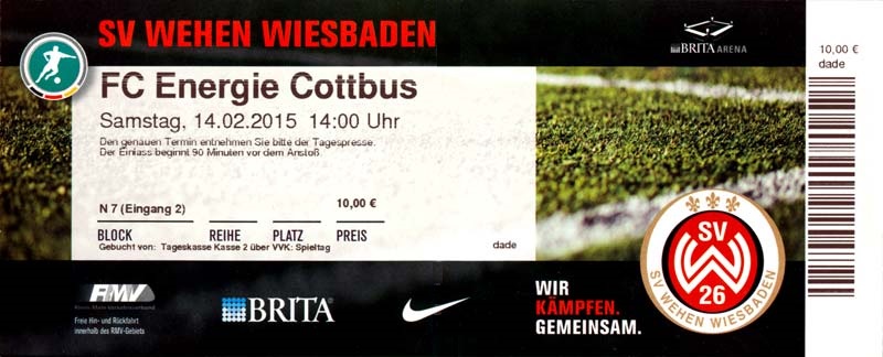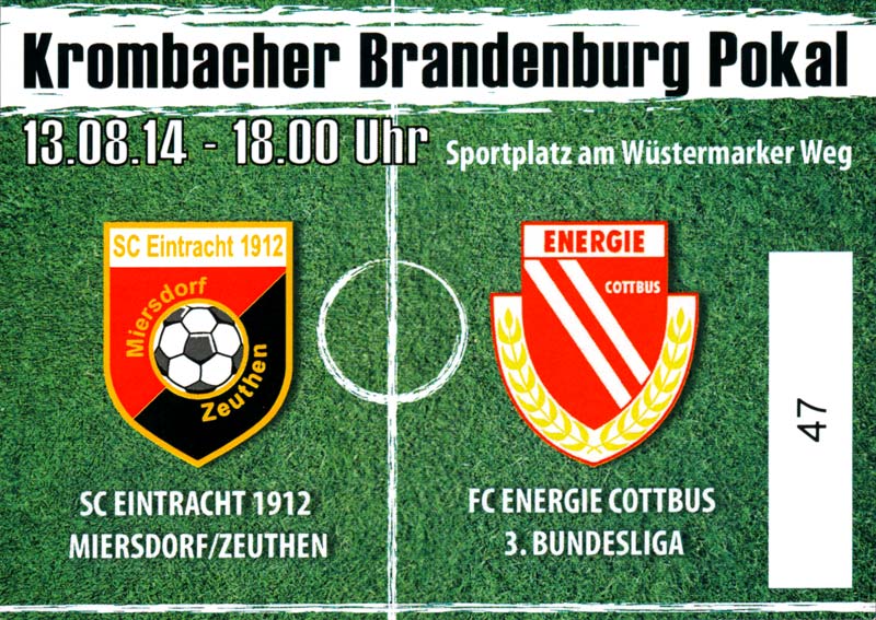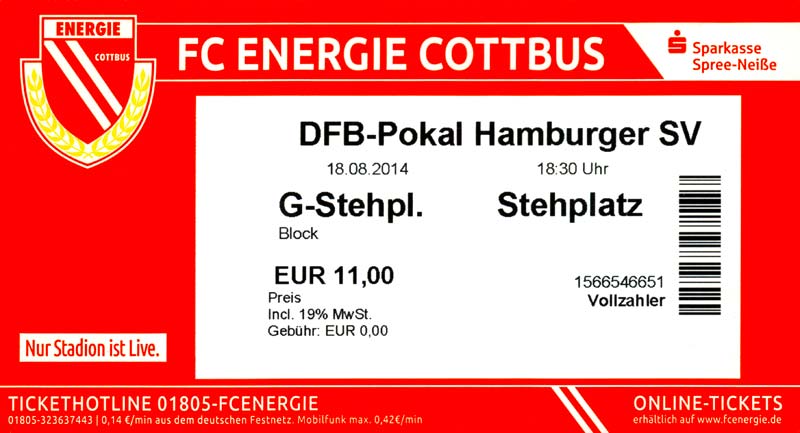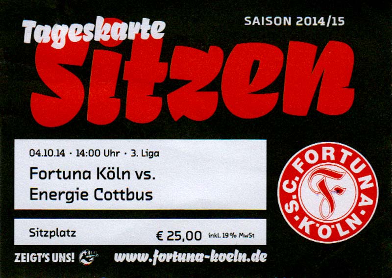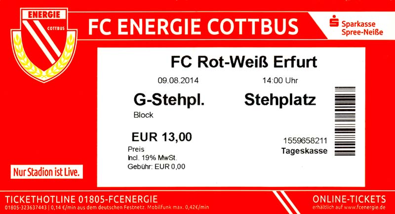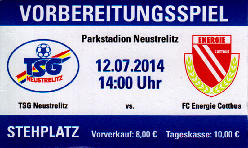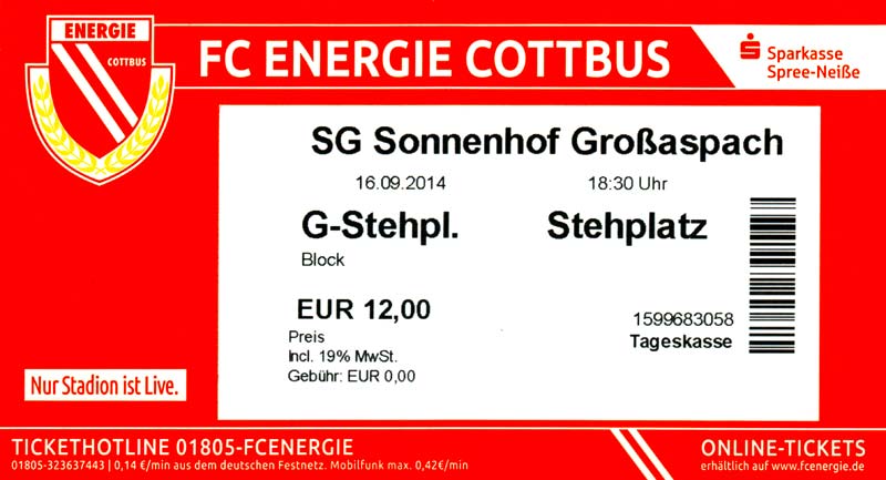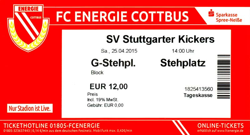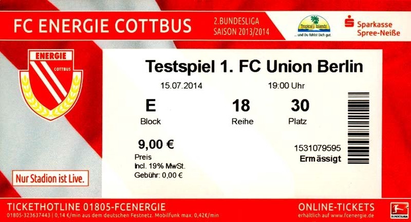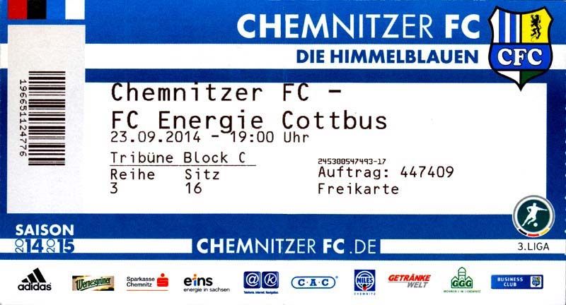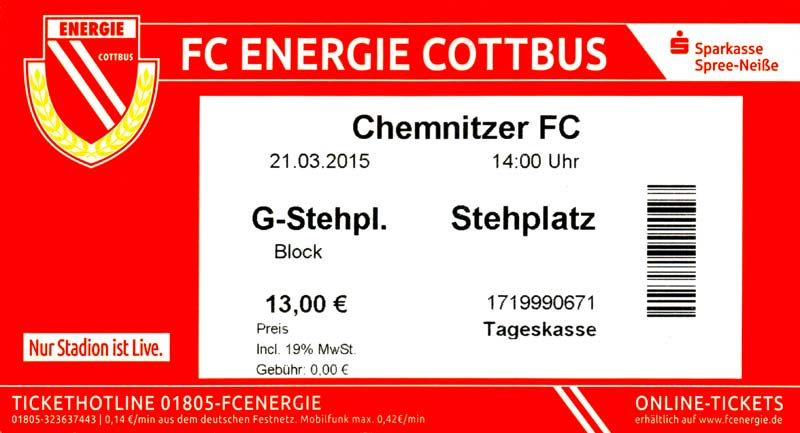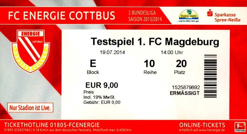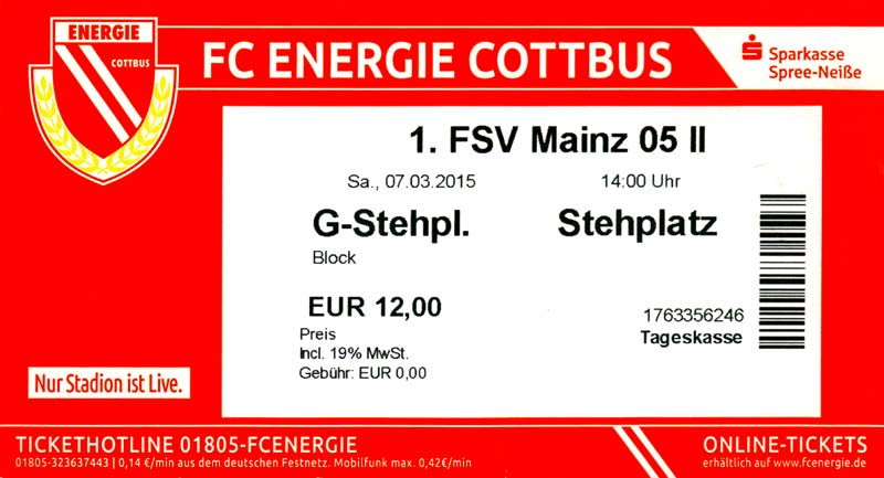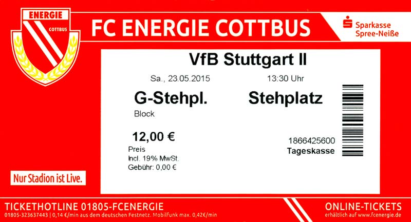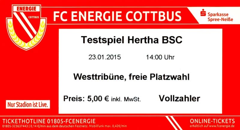 Eintrittskarten der 1. Mannschaft 29.06.2014, SV Döbern (A)02.07.2014, BSV Guben-Nord (A)05.07.2014, SG Burg/Spreewald (A)06.07.2014, FC Lausitz Hoyerswerda (A)09.07.2014, FK Ústí nad Labem (H)12.07.2014, TSG Neustrelitz (A)15.07.2014, 1. FC Union Berlin (H)19.07.2014, 1. FC Magdeburg (H)26.07.2014, VfL Osnabrück 1899 (A)03.08.2014, SG Dynamo Dresden (H)06.08.2014, SC Preußen 06 Münster (A)09.08.2014, FC Rot-Weiß Erfurt (H)13.08.2014, SC Eintracht Miersdorf/Zeuthen 1912 (A)18.08.2014, Hamburger SV (H)23.08.2014, Kieler S.V. Holstein 1900 (A)26.08.2014, SV Wehen Wiesbaden 1926 (H)30.08.2014, SSV Jahn Regensburg (A)10.09.2014, SV Großräschen (A)13.09.2014, 1. FSV Mainz 05 II (A)16.09.2014, SG Sonnenhof Großaspach (H)20.09.2014, Hallescher FC (H)23.09.2014, Chemnitzer FC (A)28.09.2014, DSC Arminia Bielefeld (H)04.10.2014, S.C. Fortuna Köln (A)12.10.2014, Ludwigsfelder FC (A)18.10.2014, MSV Duisburg (H)25.10.2014, SV Stuttgarter Kickers (A)01.11.2014, SpVgg Unterhaching 1925 (H)07.11.2014, BV Borussia 09 Dortmund II (A)15.11.2014, SV Grün-Weiß Brieselang (A)22.11.2014, F.C. Hansa Rostock (H)28.11.2014, VfB Stuttgart 1893 II (A)07.12.2014, VfL Osnabrück 1899 (H)13.12.2014, SG Dynamo Dresden (A)20.12.2014, SC Preußen 06 Münster (H)23.01.2015, Hertha BSC II (H)31.01.2015, FC Rot-Weiß Erfurt (A)07.02.2015, Kieler S.V. Holstein 1900 (H)14.02.2015, SV Wehen Wiesbaden 1926 (A)21.02.2015, SSV Jahn Regensburg (H)28.02.2015, SG Sonnenhof Großaspach (A)07.03.2015, 1. FSV Mainz 05 II (H)14.03.2015, Hallescher FC (A)21.03.2015, Chemnitzer FC (H)04.04.2015, DSC Arminia Bielefeld (A)11.04.2015, S.C. Fortuna Köln (H)15.04.2015, SV Babelsberg 03 (A)18.04.2015, MSV Duisburg (A)25.04.2015, SV Stuttgarter Kickers (H)02.05.2015, SpVgg Unterhaching 1925 (A)06.05.2015, FSV Union Fürstenwalde (A)09.05.2015, BV Borussia 09 Dortmund II (H)16.05.2015, F.C. Hansa Rostock (A)23.05.2015, VfB Stuttgart 1893 II (H)