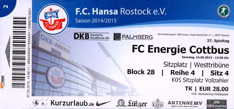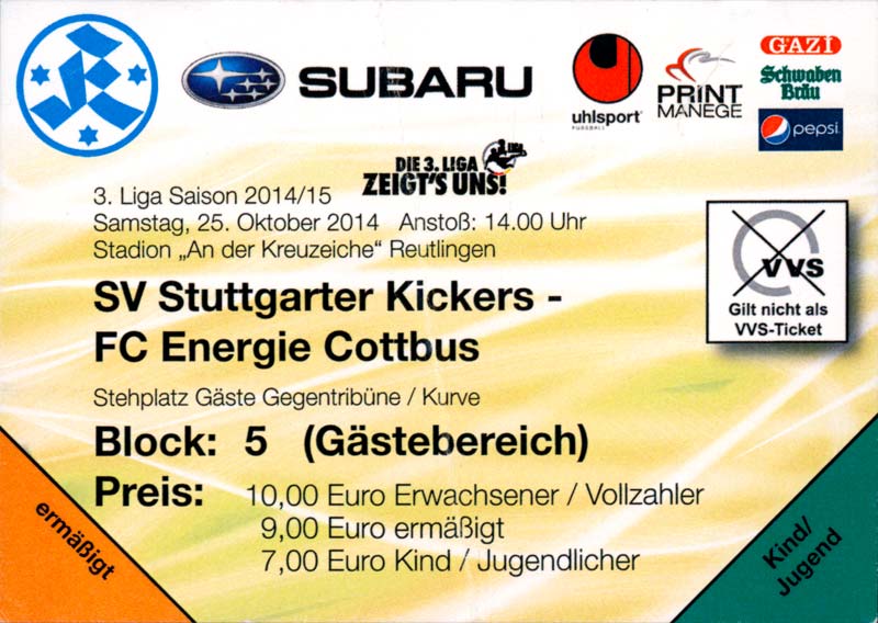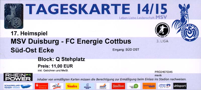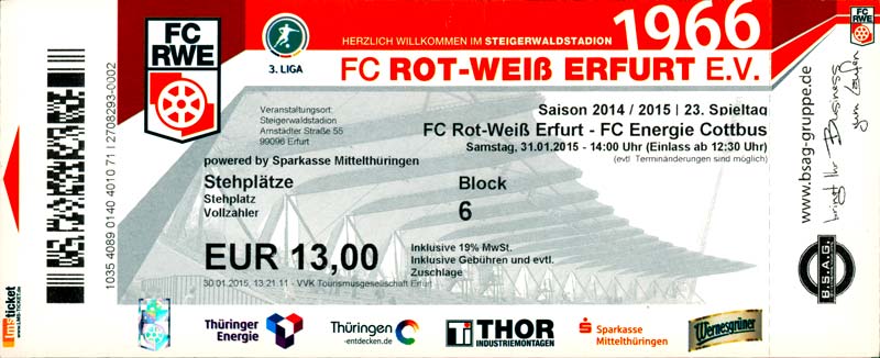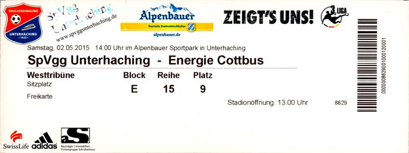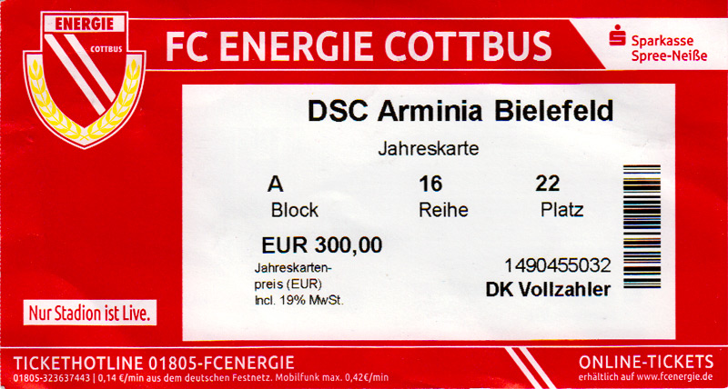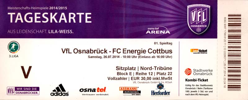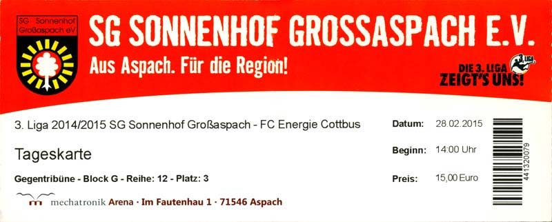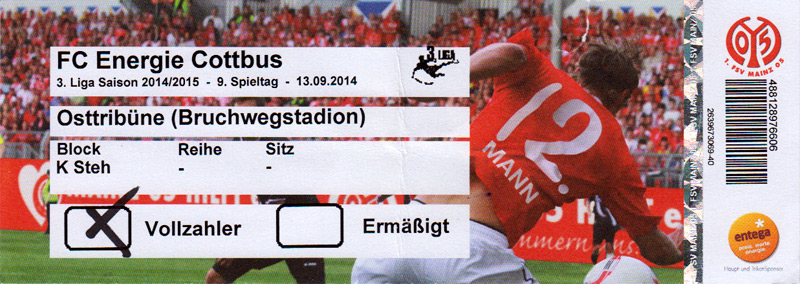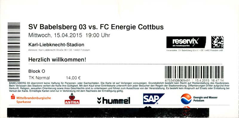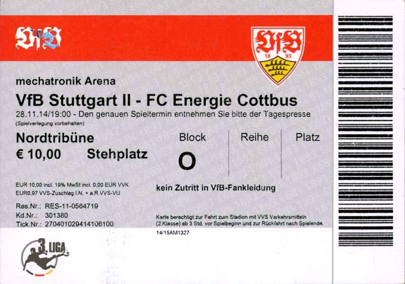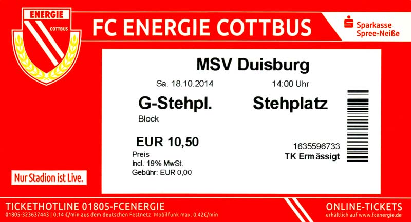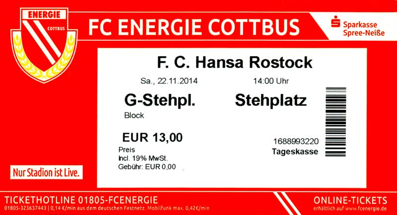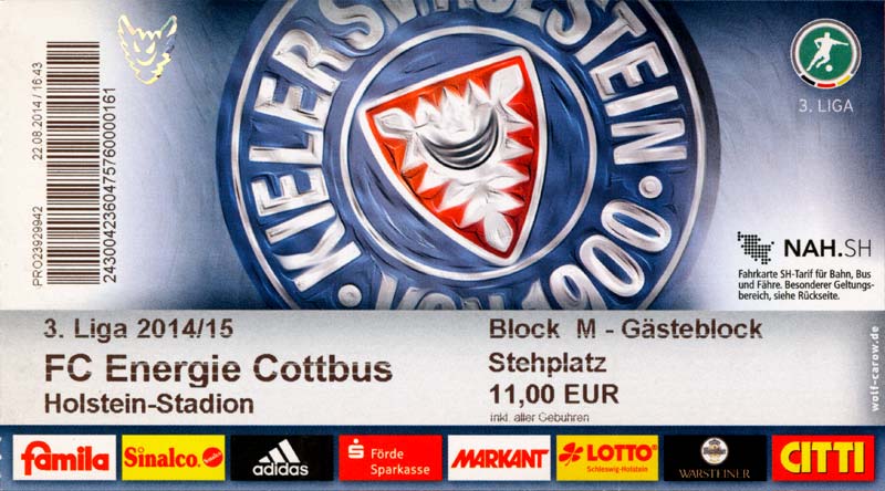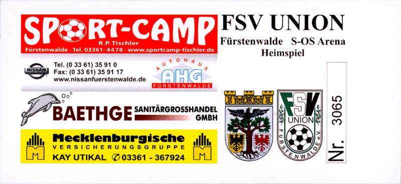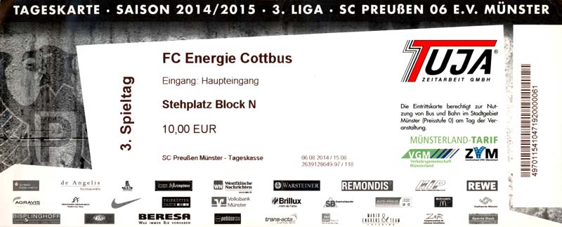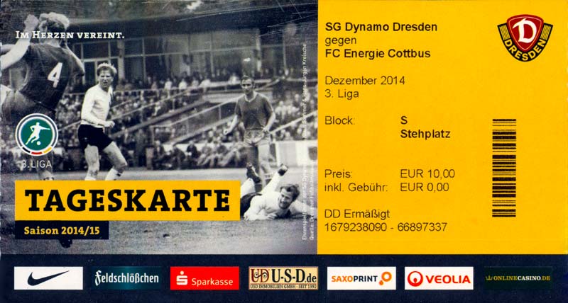 Eintrittskarten der 1. Mannschaft 29.06.2014, SV Döbern (A)02.07.2014, BSV Guben-Nord (A)05.07.2014, SG Burg/Spreewald (A)06.07.2014, FC Lausitz Hoyerswerda (A)09.07.2014, FK Ústí nad Labem (H)12.07.2014, TSG Neustrelitz (A)15.07.2014, 1. FC Union Berlin (H)19.07.2014, 1. FC Magdeburg (H)26.07.2014, VfL Osnabrück 1899 (A)03.08.2014, SG Dynamo Dresden (H)06.08.2014, SC Preußen 06 Münster (A)09.08.2014, FC Rot-Weiß Erfurt (H)13.08.2014, SC Eintracht Miersdorf/Zeuthen 1912 (A)18.08.2014, Hamburger SV (H)23.08.2014, Kieler S.V. Holstein 1900 (A)26.08.2014, SV Wehen Wiesbaden 1926 (H)30.08.2014, SSV Jahn Regensburg (A)10.09.2014, SV Großräschen (A)13.09.2014, 1. FSV Mainz 05 II (A)16.09.2014, SG Sonnenhof Großaspach (H)20.09.2014, Hallescher FC (H)23.09.2014, Chemnitzer FC (A)28.09.2014, DSC Arminia Bielefeld (H)04.10.2014, S.C. Fortuna Köln (A)12.10.2014, Ludwigsfelder FC (A)18.10.2014, MSV Duisburg (H)25.10.2014, SV Stuttgarter Kickers (A)01.11.2014, SpVgg Unterhaching 1925 (H)07.11.2014, BV Borussia 09 Dortmund II (A)15.11.2014, SV Grün-Weiß Brieselang (A)22.11.2014, F.C. Hansa Rostock (H)28.11.2014, VfB Stuttgart 1893 II (A)07.12.2014, VfL Osnabrück 1899 (H)13.12.2014, SG Dynamo Dresden (A)20.12.2014, SC Preußen 06 Münster (H)23.01.2015, Hertha BSC II (H)31.01.2015, FC Rot-Weiß Erfurt (A)07.02.2015, Kieler S.V. Holstein 1900 (H)14.02.2015, SV Wehen Wiesbaden 1926 (A)21.02.2015, SSV Jahn Regensburg (H)28.02.2015, SG Sonnenhof Großaspach (A)07.03.2015, 1. FSV Mainz 05 II (H)14.03.2015, Hallescher FC (A)21.03.2015, Chemnitzer FC (H)04.04.2015, DSC Arminia Bielefeld (A)11.04.2015, S.C. Fortuna Köln (H)15.04.2015, SV Babelsberg 03 (A)18.04.2015, MSV Duisburg (A)25.04.2015, SV Stuttgarter Kickers (H)02.05.2015, SpVgg Unterhaching 1925 (A)06.05.2015, FSV Union Fürstenwalde (A)09.05.2015, BV Borussia 09 Dortmund II (H)16.05.2015, F.C. Hansa Rostock (A)23.05.2015, VfB Stuttgart 1893 II (H)