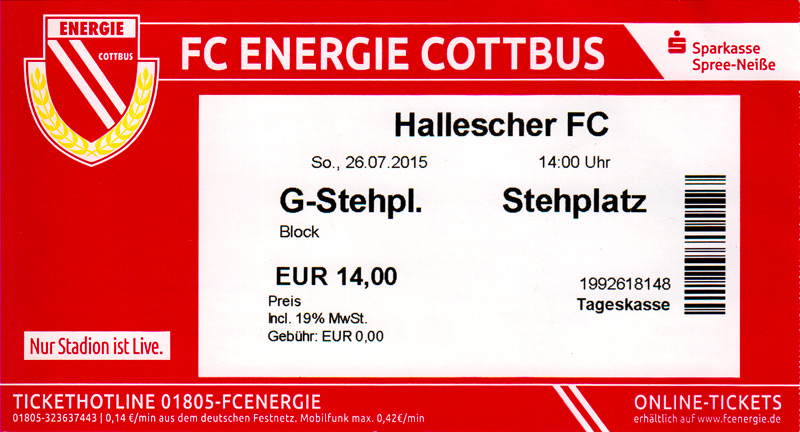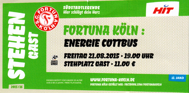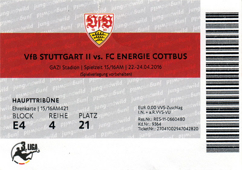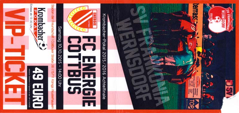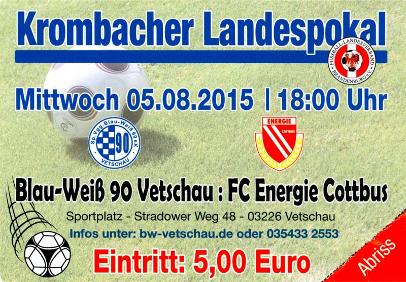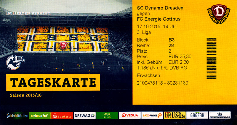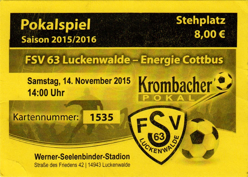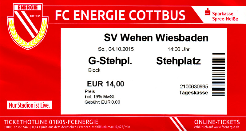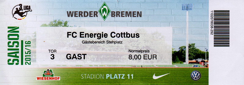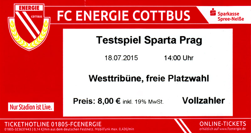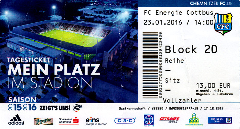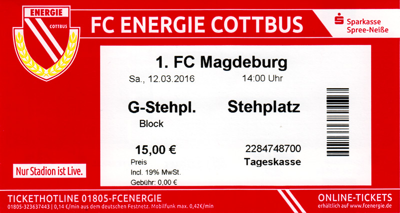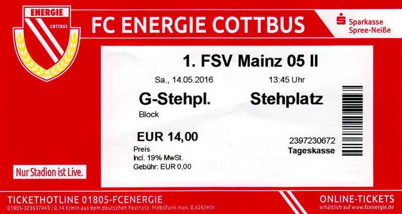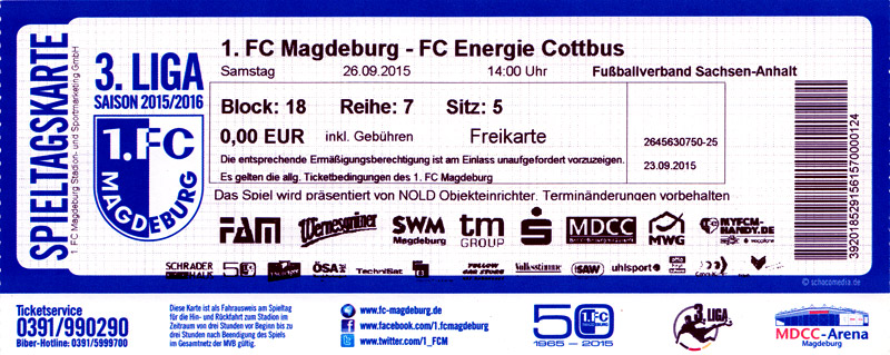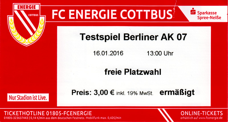 Eintrittskarten der 1. Mannschaft 24.06.2015, Spremberger SV 1862 (A)27.06.2015, FSV Rot-Weiß Luckau (A)28.06.2015, SpVgg Blau-Weiß 90 Vetschau (A)05.07.2015, SV Grün-Weiß Großbeeren (A)08.07.2015, FSV Budissa Bautzen (N)11.07.2015, HB Køge (H)15.07.2015, FC Viktoria 1889 Berlin (H)18.07.2015, AC Sparta Praha (H)26.07.2015, Hallescher FC (H)01.08.2015, SV Werder Bremen II (A)05.08.2015, SpVgg Blau-Weiß 90 Vetschau (A)09.08.2015, 1. FSV Mainz 05 (H)15.08.2015, Chemnitzer FC (H)21.08.2015, S.C. Fortuna Köln (A)25.08.2015, VfL Osnabrück 1899 (H)29.08.2015, SV Stuttgarter Kickers (A)02.09.2015, MSV 19 Rüdersdorf (A)05.09.2015, VfR Aalen 1921 (H)11.09.2015, F.C. Hansa Rostock (A)18.09.2015, FC Erzgebirge Aue (A)23.09.2015, Kieler S.V. Holstein 1900 (H)26.09.2015, 1. FC Magdeburg (A)04.10.2015, SV Wehen Wiesbaden 1926 (H)07.10.2015, 1. FC Finowfurt 1911 (A)10.10.2015, SV Frankonia Wernsdorf (A)17.10.2015, SG Dynamo Dresden (A)31.10.2015, SG Sonnenhof Großaspach (A)07.11.2015, VfB Stuttgart 1893 II (H)14.11.2015, FSV 63 Luckenwalde (A)21.11.2015, FC Würzburger Kickers (A)28.11.2015, FC Rot-Weiß Erfurt (H)05.12.2015, 1. FSV Mainz 05 II (A)13.12.2015, Hallescher FC (A)19.12.2015, SV Werder Bremen II (H)08.01.2016, VfL Wolfsburg (H)16.01.2016, Berliner AK 07 (H)31.01.2016, S.C. Fortuna Köln (H)05.02.2016, VfL Osnabrück 1899 (A)13.02.2016, SV Stuttgarter Kickers (H)20.02.2016, VfR Aalen 1921 (A)27.02.2016, F.C. Hansa Rostock (H)02.03.2016, FC Erzgebirge Aue (H)05.03.2016, Kieler S.V. Holstein 1900 (A)12.03.2016, 1. FC Magdeburg (H)19.03.2016, SV Wehen Wiesbaden 1926 (A)24.03.2016, Chemnitzer FC (A)09.04.2016, SC Preußen 06 Münster (A)16.04.2016, SG Sonnenhof Großaspach (H)22.04.2016, VfB Stuttgart 1893 II (A)30.04.2016, FC Würzburger Kickers (H)07.05.2016, FC Rot-Weiß Erfurt (A)14.05.2016, 1. FSV Mainz 05 II (H)