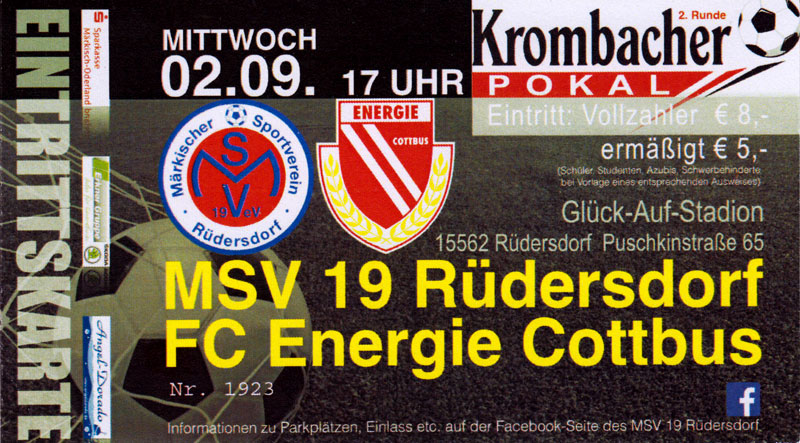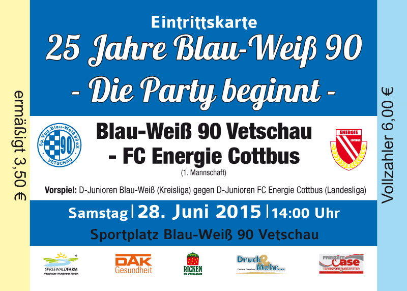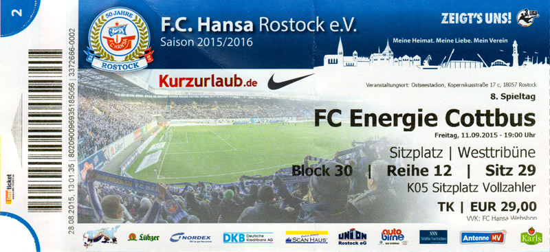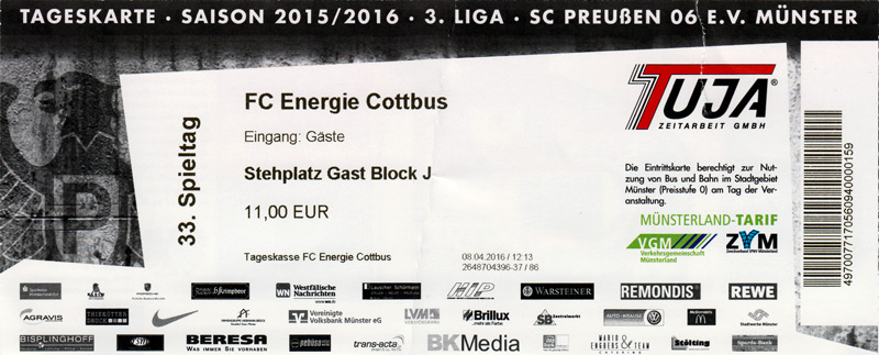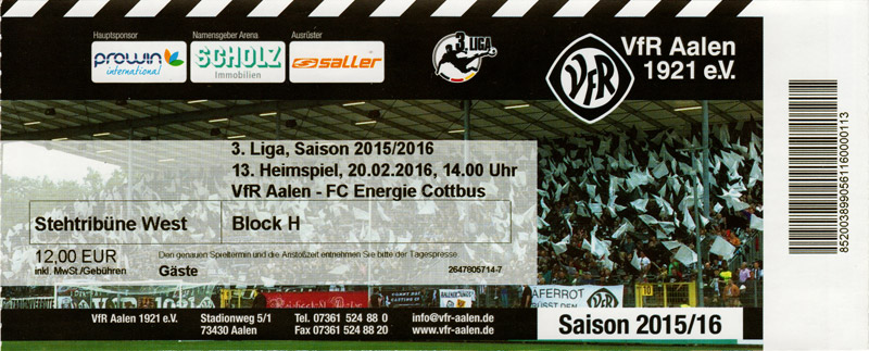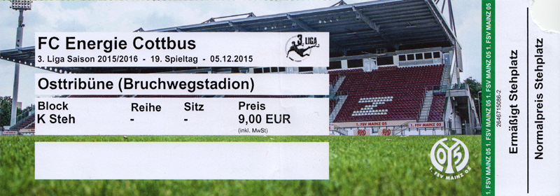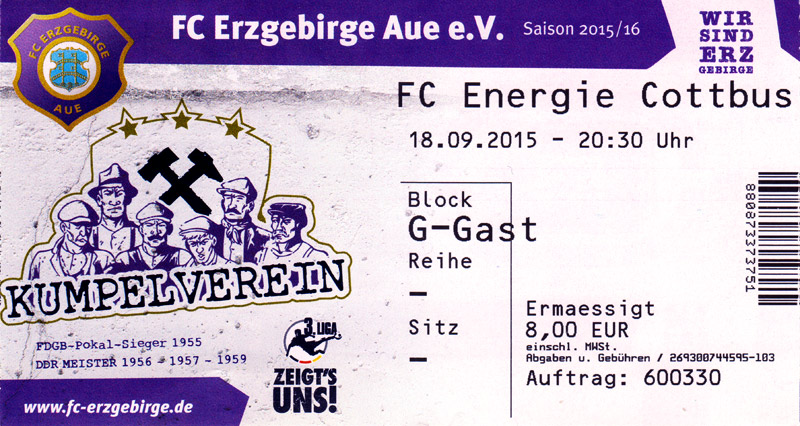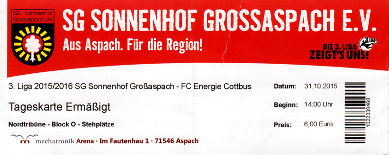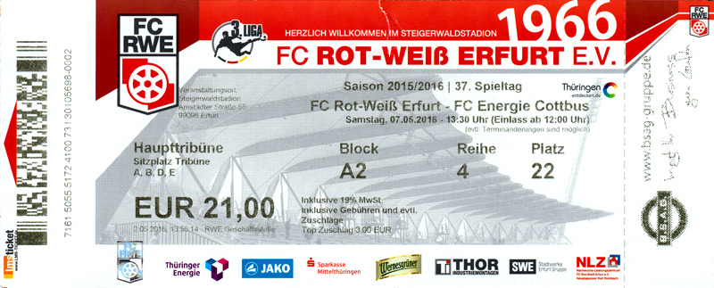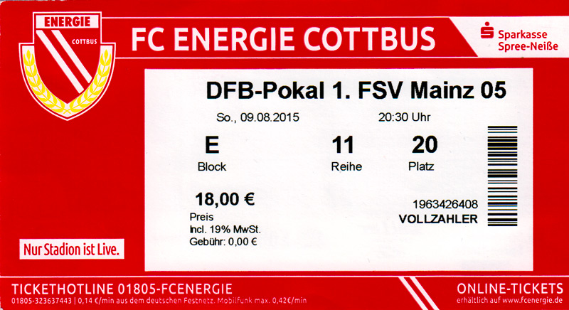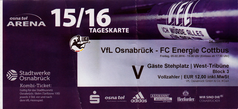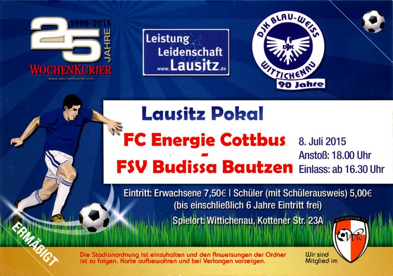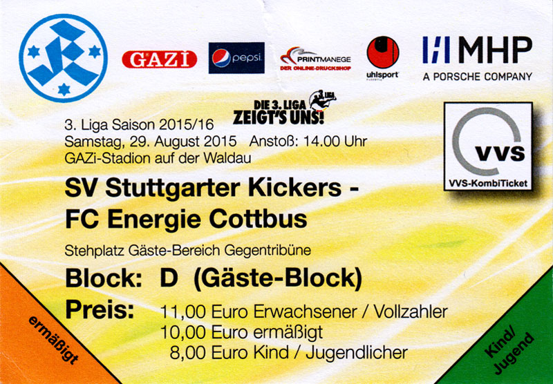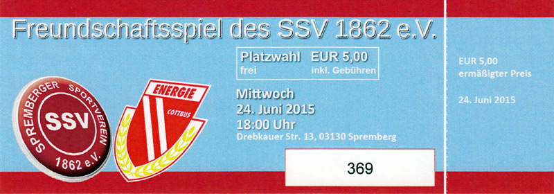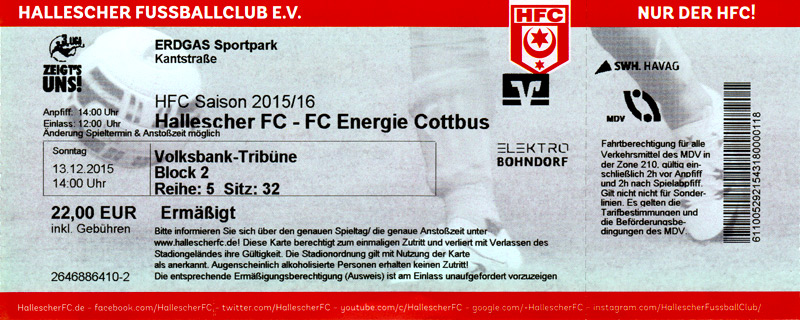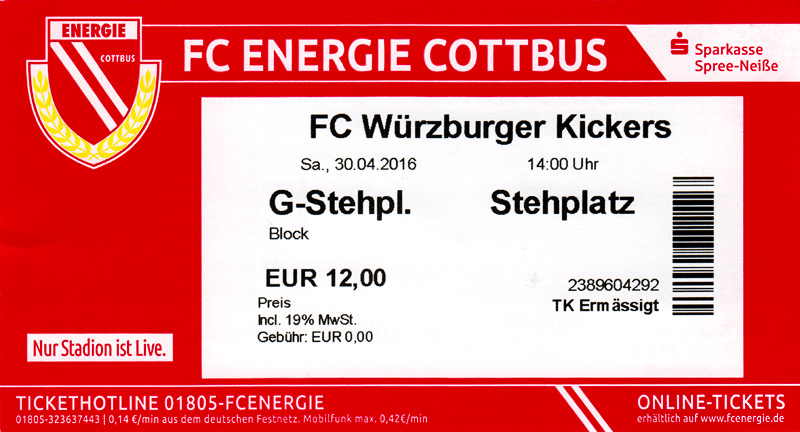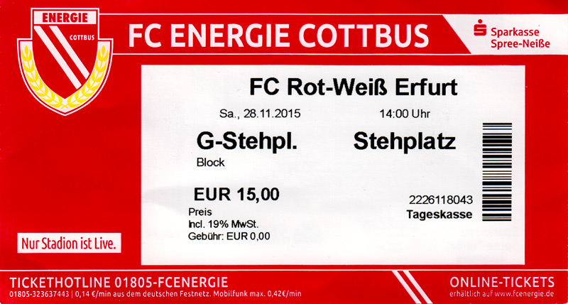 Eintrittskarten der 1. Mannschaft 24.06.2015, Spremberger SV 1862 (A)27.06.2015, FSV Rot-Weiß Luckau (A)28.06.2015, SpVgg Blau-Weiß 90 Vetschau (A)05.07.2015, SV Grün-Weiß Großbeeren (A)08.07.2015, FSV Budissa Bautzen (N)11.07.2015, HB Køge (H)15.07.2015, FC Viktoria 1889 Berlin (H)18.07.2015, AC Sparta Praha (H)26.07.2015, Hallescher FC (H)01.08.2015, SV Werder Bremen II (A)05.08.2015, SpVgg Blau-Weiß 90 Vetschau (A)09.08.2015, 1. FSV Mainz 05 (H)15.08.2015, Chemnitzer FC (H)21.08.2015, S.C. Fortuna Köln (A)25.08.2015, VfL Osnabrück 1899 (H)29.08.2015, SV Stuttgarter Kickers (A)02.09.2015, MSV 19 Rüdersdorf (A)05.09.2015, VfR Aalen 1921 (H)11.09.2015, F.C. Hansa Rostock (A)18.09.2015, FC Erzgebirge Aue (A)23.09.2015, Kieler S.V. Holstein 1900 (H)26.09.2015, 1. FC Magdeburg (A)04.10.2015, SV Wehen Wiesbaden 1926 (H)07.10.2015, 1. FC Finowfurt 1911 (A)10.10.2015, SV Frankonia Wernsdorf (A)17.10.2015, SG Dynamo Dresden (A)31.10.2015, SG Sonnenhof Großaspach (A)07.11.2015, VfB Stuttgart 1893 II (H)14.11.2015, FSV 63 Luckenwalde (A)21.11.2015, FC Würzburger Kickers (A)28.11.2015, FC Rot-Weiß Erfurt (H)05.12.2015, 1. FSV Mainz 05 II (A)13.12.2015, Hallescher FC (A)19.12.2015, SV Werder Bremen II (H)08.01.2016, VfL Wolfsburg (H)16.01.2016, Berliner AK 07 (H)31.01.2016, S.C. Fortuna Köln (H)05.02.2016, VfL Osnabrück 1899 (A)13.02.2016, SV Stuttgarter Kickers (H)20.02.2016, VfR Aalen 1921 (A)27.02.2016, F.C. Hansa Rostock (H)02.03.2016, FC Erzgebirge Aue (H)05.03.2016, Kieler S.V. Holstein 1900 (A)12.03.2016, 1. FC Magdeburg (H)19.03.2016, SV Wehen Wiesbaden 1926 (A)24.03.2016, Chemnitzer FC (A)09.04.2016, SC Preußen 06 Münster (A)16.04.2016, SG Sonnenhof Großaspach (H)22.04.2016, VfB Stuttgart 1893 II (A)30.04.2016, FC Würzburger Kickers (H)07.05.2016, FC Rot-Weiß Erfurt (A)14.05.2016, 1. FSV Mainz 05 II (H)