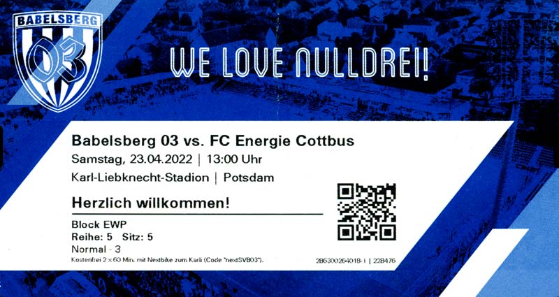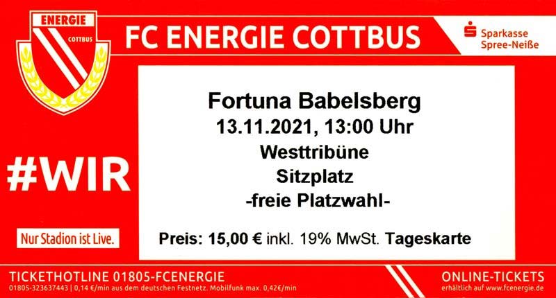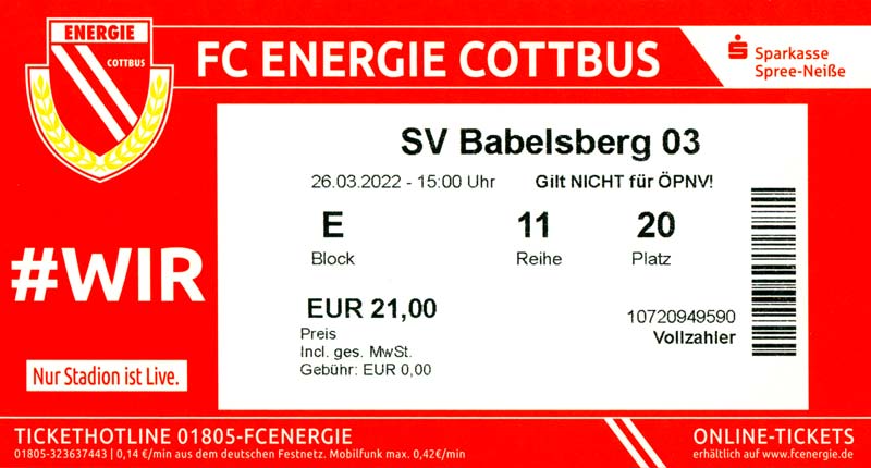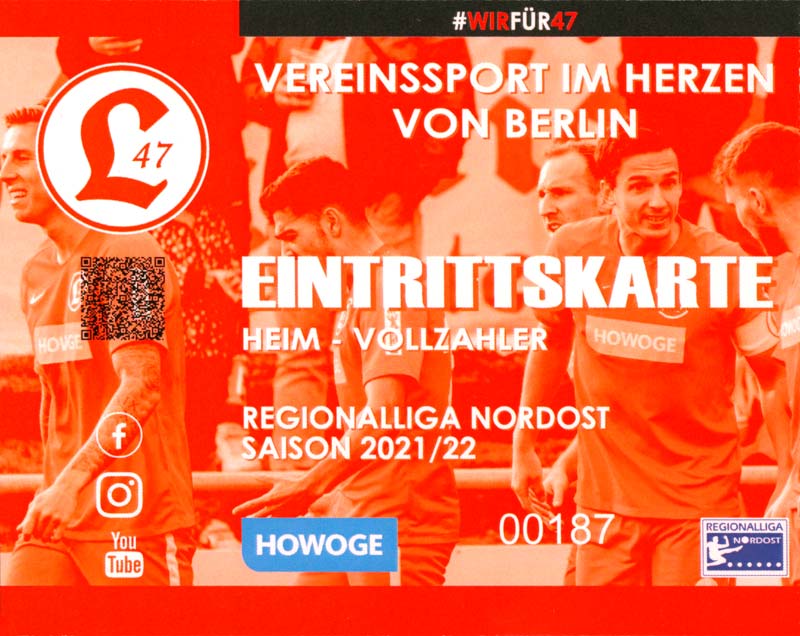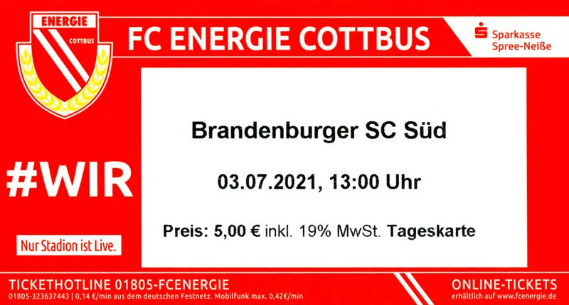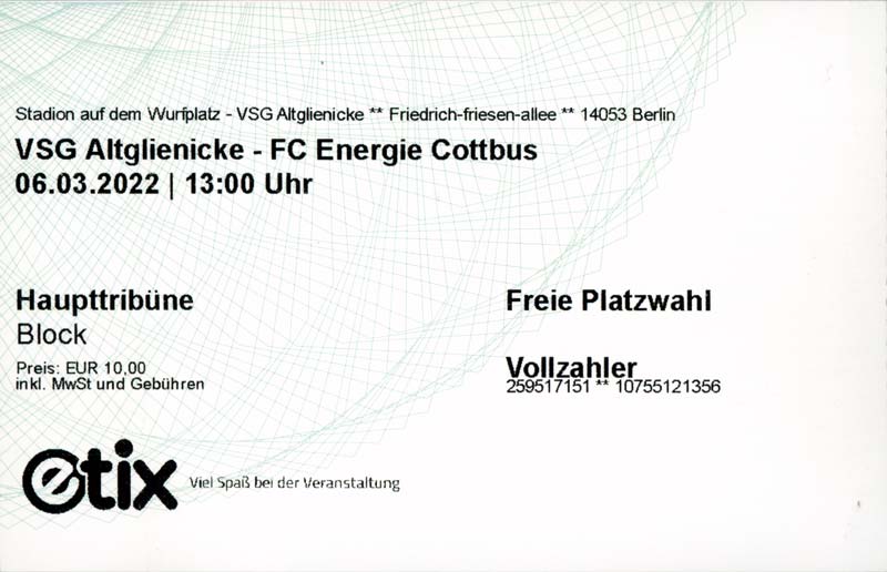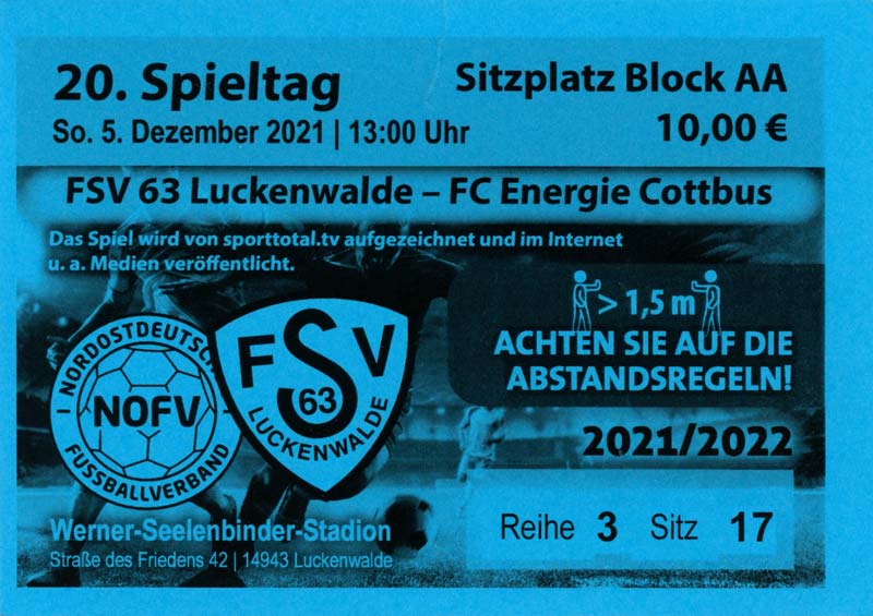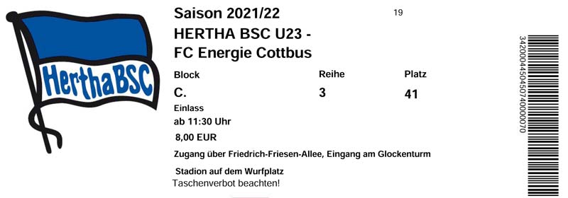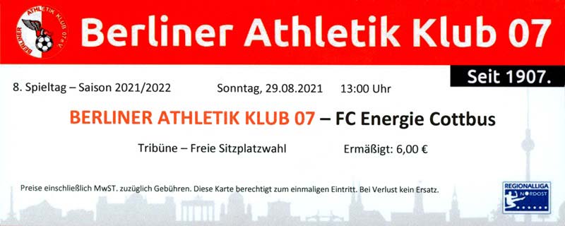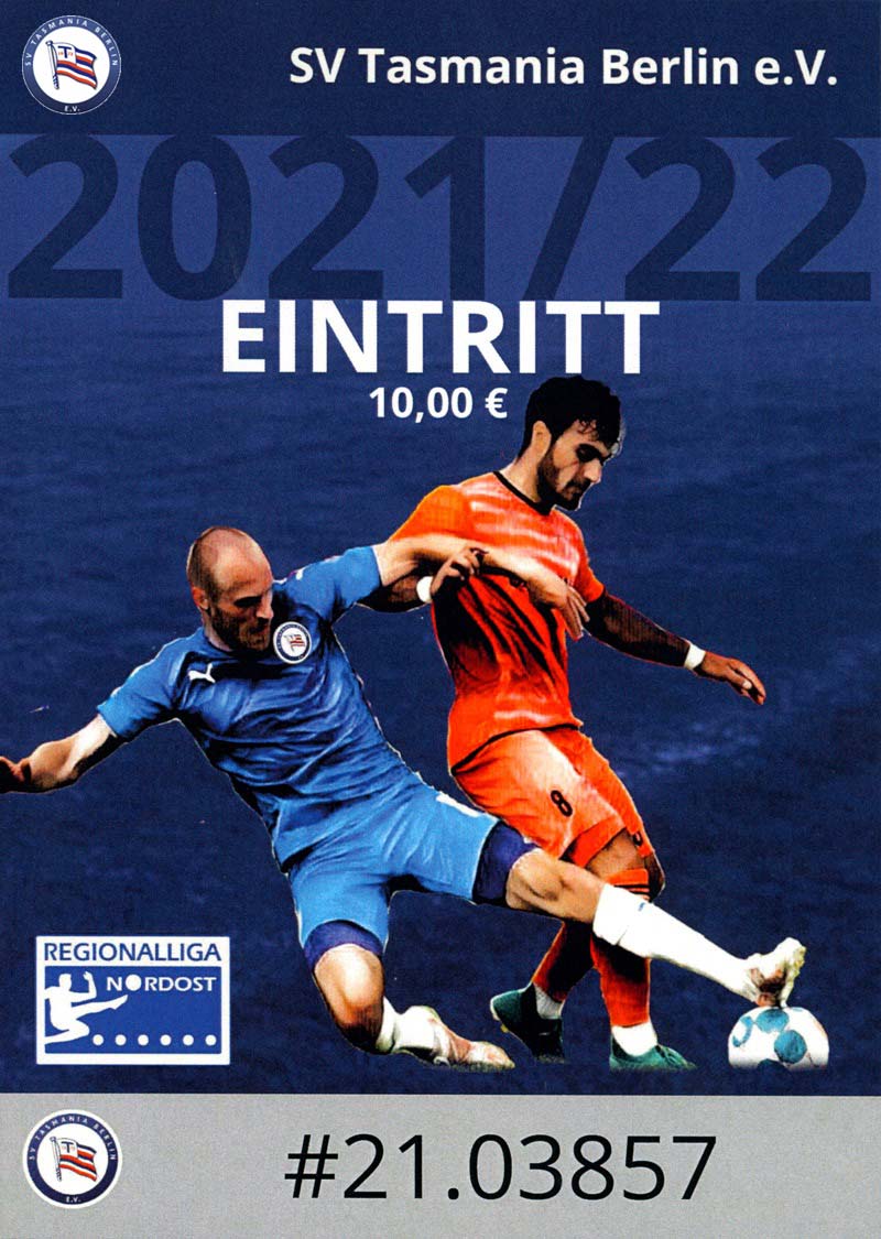 Eintrittskarten der 1. Mannschaft 19.06.2021, SG Groß Gaglow (A)23.06.2021, SV Wacker 09 Cottbus-Ströbitz (A)26.06.2021, Ludwigsfelder FC (A)03.07.2021, Brandenburger SC Süd 05 (H)11.07.2021, SV Lichtenberg 47 (A)17.07.2021, TSV Havelse 1912 (A)25.07.2021, FSV 63 Luckenwalde (H)28.07.2021, BFC Dynamo (A)02.08.2021, FSV Optik Rathenow (H)06.08.2021, Offenbacher FC Kickers 1901 (H)14.08.2021, VfB Auerbach 1906 (H)21.08.2021, FSV Union Fürstenwalde (H)29.08.2021, Berliner AK 07 (A)01.09.2021, VSG Altglienicke (H)04.09.2021, Ludwigsfelder FC (A)25.09.2021, FC Eilenburg (H)01.10.2021, VfB Germania Halberstadt (A)06.10.2021, Tennis Borussia Berlin (A)09.10.2021, FSV Optik Rathenow (A)16.10.2021, ZFC Meuselwitz (H)20.10.2021, Chemnitzer FC (A)24.10.2021, SV Tasmania Berlin (A)27.10.2021, FC Carl Zeiss Jena (A)31.10.2021, SV Babelsberg 03 (H)10.11.2021, 1. FC Lokomotive Leipzig (A)13.11.2021, Fortuna Babelsberg (H)20.11.2021, Hertha BSC II (H)24.11.2021, SV Lichtenberg 47 (A)27.11.2021, BSG Chemie Leipzig (A)05.12.2021, FSV 63 Luckenwalde (A)10.12.2021, BFC Dynamo (H)18.12.2021, FSV Optik Rathenow (A)29.01.2022, FC Carl Zeiss Jena (H)05.02.2022, VfB Auerbach 1906 (A)20.02.2022, FSV Union Fürstenwalde (A)26.02.2022, Berliner AK 07 (H)06.03.2022, VSG Altglienicke (A)20.03.2022, Chemnitzer FC (H)26.03.2022, SV Babelsberg 03 (H)30.03.2022, Tennis Borussia Berlin (H)03.04.2022, FC Eilenburg (A)06.04.2022, VfB Germania Halberstadt (H)10.04.2022, ZFC Meuselwitz (A)14.04.2022, SV Tasmania Berlin (H)19.04.2022, 1. FC Lokomotive Leipzig (H)23.04.2022, SV Babelsberg 03 (A)01.05.2022, SV Lichtenberg 47 (H)08.05.2022, Hertha BSC II (A)15.05.2022, BSG Chemie Leipzig (H)21.05.2022, VfB 1921 Krieschow (N)