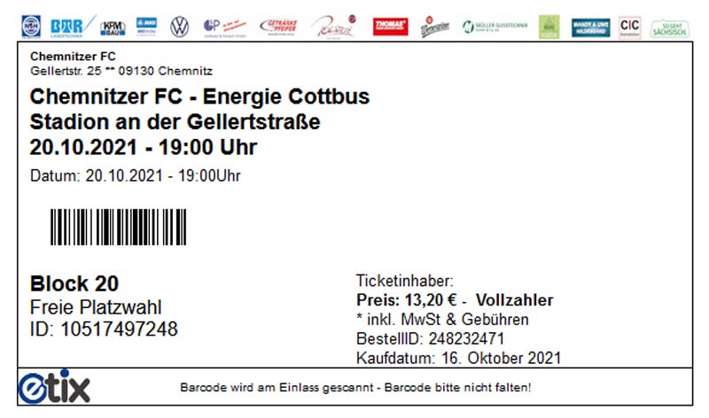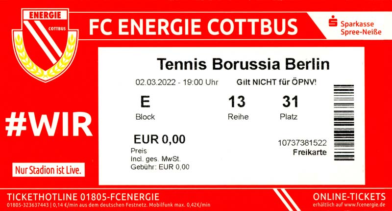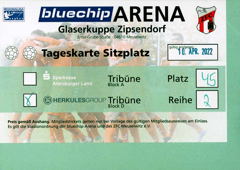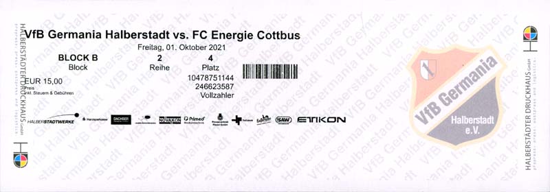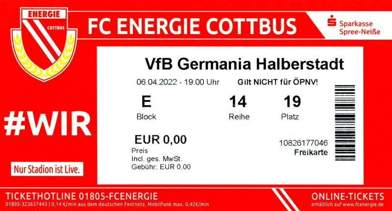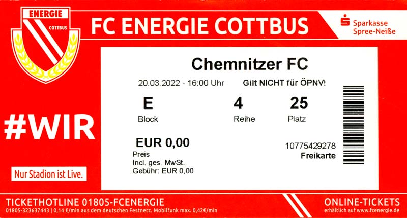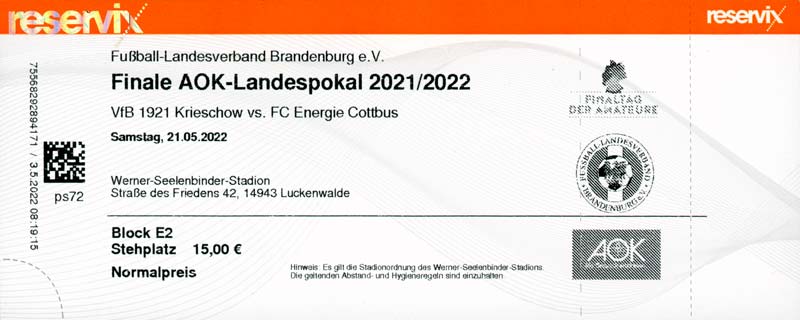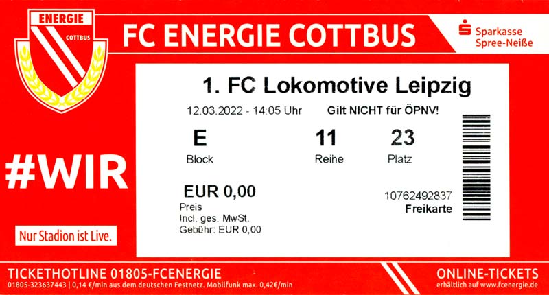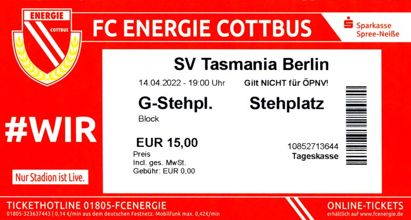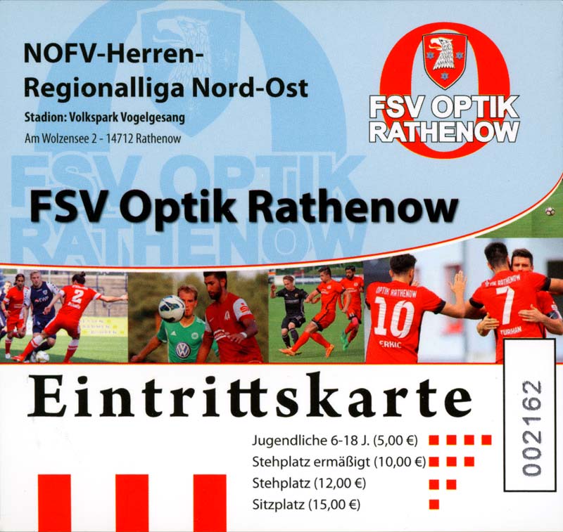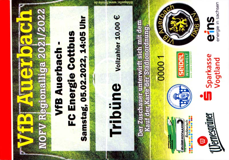 Eintrittskarten der 1. Mannschaft 19.06.2021, SG Groß Gaglow (A)23.06.2021, SV Wacker 09 Cottbus-Ströbitz (A)26.06.2021, Ludwigsfelder FC (A)03.07.2021, Brandenburger SC Süd 05 (H)11.07.2021, SV Lichtenberg 47 (A)17.07.2021, TSV Havelse 1912 (A)25.07.2021, FSV 63 Luckenwalde (H)28.07.2021, BFC Dynamo (A)02.08.2021, FSV Optik Rathenow (H)06.08.2021, Offenbacher FC Kickers 1901 (H)14.08.2021, VfB Auerbach 1906 (H)21.08.2021, FSV Union Fürstenwalde (H)29.08.2021, Berliner AK 07 (A)01.09.2021, VSG Altglienicke (H)04.09.2021, Ludwigsfelder FC (A)25.09.2021, FC Eilenburg (H)01.10.2021, VfB Germania Halberstadt (A)06.10.2021, Tennis Borussia Berlin (A)09.10.2021, FSV Optik Rathenow (A)16.10.2021, ZFC Meuselwitz (H)20.10.2021, Chemnitzer FC (A)24.10.2021, SV Tasmania Berlin (A)27.10.2021, FC Carl Zeiss Jena (A)31.10.2021, SV Babelsberg 03 (H)10.11.2021, 1. FC Lokomotive Leipzig (A)13.11.2021, Fortuna Babelsberg (H)20.11.2021, Hertha BSC II (H)24.11.2021, SV Lichtenberg 47 (A)27.11.2021, BSG Chemie Leipzig (A)05.12.2021, FSV 63 Luckenwalde (A)10.12.2021, BFC Dynamo (H)18.12.2021, FSV Optik Rathenow (A)29.01.2022, FC Carl Zeiss Jena (H)05.02.2022, VfB Auerbach 1906 (A)20.02.2022, FSV Union Fürstenwalde (A)26.02.2022, Berliner AK 07 (H)06.03.2022, VSG Altglienicke (A)20.03.2022, Chemnitzer FC (H)26.03.2022, SV Babelsberg 03 (H)30.03.2022, Tennis Borussia Berlin (H)03.04.2022, FC Eilenburg (A)06.04.2022, VfB Germania Halberstadt (H)10.04.2022, ZFC Meuselwitz (A)14.04.2022, SV Tasmania Berlin (H)19.04.2022, 1. FC Lokomotive Leipzig (H)23.04.2022, SV Babelsberg 03 (A)01.05.2022, SV Lichtenberg 47 (H)08.05.2022, Hertha BSC II (A)15.05.2022, BSG Chemie Leipzig (H)21.05.2022, VfB 1921 Krieschow (N)