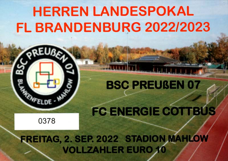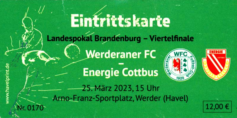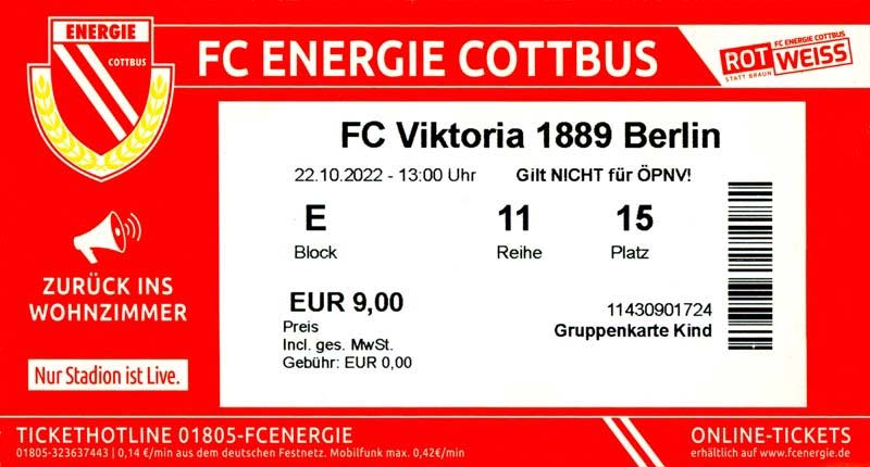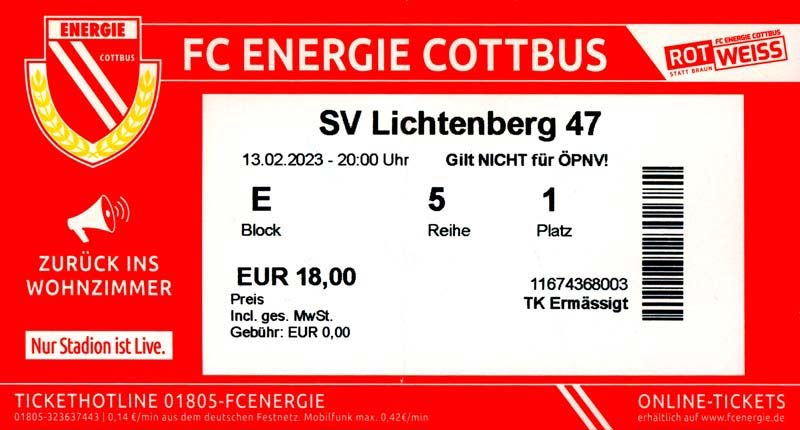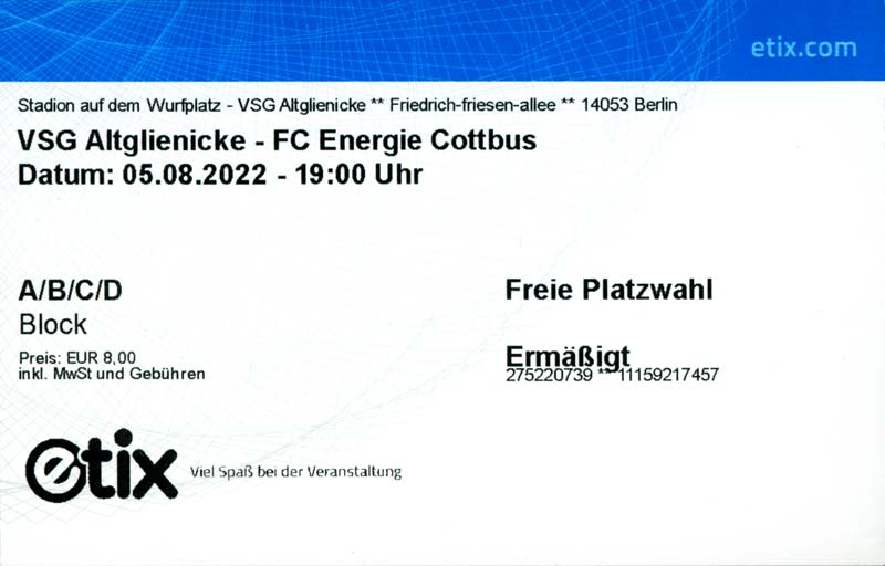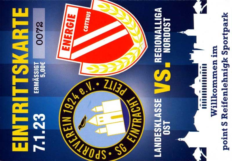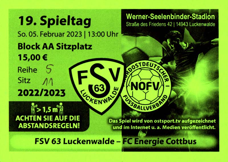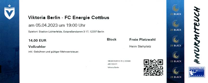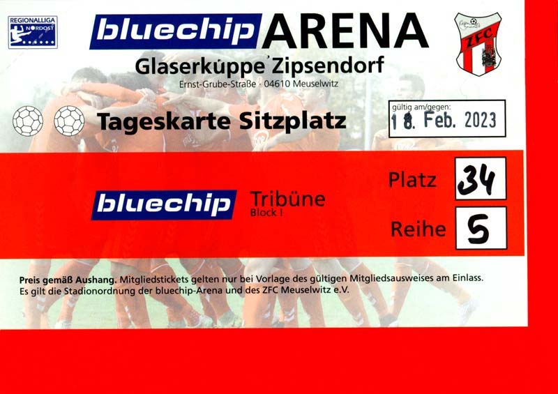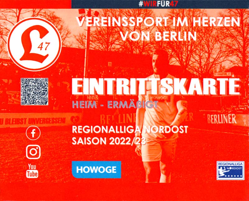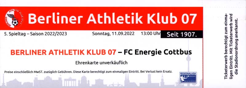 Eintrittskarten der 1. Mannschaft 01.07.2022, ESV Lok Falkenberg (A)02.07.2022, Neuzeller SV 1922 (A)08.07.2022, Hertha BSC (H)09.07.2022, KS Lechia Zielona Góra (H)16.07.2022, SpVgg Oberfranken Bayreuth 1921 (A)20.07.2022, FSV Budissa Bautzen (N)24.07.2022, VfV Borussia 06 Hildesheim (H)01.08.2022, SV Werder Bremen (H)05.08.2022, VSG Altglienicke (A)13.08.2022, FSV 63 Luckenwalde (H)21.08.2022, SV Lichtenberg 47 (A)27.08.2022, ZFC Meuselwitz (H)02.09.2022, BSC Preußen 07 Blankenfelde-Mahlow (A)11.09.2022, Berliner AK 07 (A)17.09.2022, Chemnitzer FC (H)24.09.2022, RSV Eintracht 1949 (A)28.09.2022, FC Carl Zeiss Jena (A)08.10.2022, 1. FC Lokomotive Leipzig (H)14.10.2022, Hertha BSC II (A)22.10.2022, FC Viktoria 1889 Berlin (H)30.10.2022, Tennis Borussia Berlin (A)06.11.2022, Greifswalder FC (H)13.11.2022, BFC Dynamo (A)19.11.2022, SV Babelsberg 03 (H)04.12.2022, FC Rot-Weiß Erfurt (A)10.12.2022, SV Babelsberg 03 (A)07.01.2023, SV 1924 SG Eintracht Peitz (A)10.01.2023, FC Erzgebirge Aue (A)14.01.2023, VFC Plauen (N)14.01.2023, 1. FC Frankfurt (Oder) (A)28.01.2023, VSG Altglienicke (H)05.02.2023, FSV 63 Luckenwalde (A)13.02.2023, SV Lichtenberg 47 (H)18.02.2023, ZFC Meuselwitz (A)22.02.2023, BSG Chemie Leipzig (H)25.02.2023, Berliner AK 07 (H)03.03.2023, Chemnitzer FC (A)19.03.2023, 1. FC Lokomotive Leipzig (A)25.03.2023, Werderaner FC Viktoria 1920 (A)01.04.2023, Hertha BSC II (H)05.04.2023, FC Viktoria 1889 Berlin (A)15.04.2023, Tennis Borussia Berlin (H)19.04.2023, FC Carl Zeiss Jena (H)23.04.2023, Greifswalder FC (A)26.04.2023, VfB 1921 Krieschow (H)02.05.2023, BFC Dynamo (H)07.05.2023, VfB Germania Halberstadt (A)13.05.2023, FC Rot-Weiß Erfurt (H)21.05.2023, SV Babelsberg 03 (H)28.05.2023, BSG Chemie Leipzig (A)03.06.2023, FSV 63 Luckenwalde (H)07.06.2023, SpVgg Unterhaching 1925 (H)11.06.2023, SpVgg Unterhaching 1925 (A)