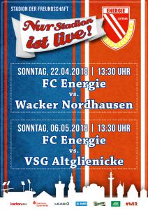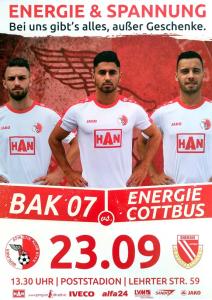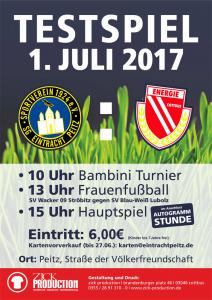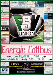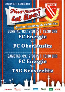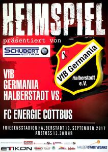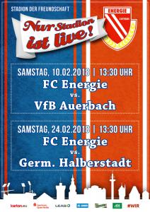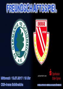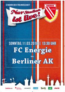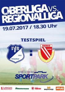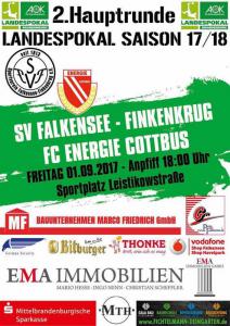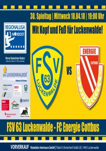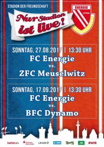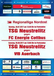 Ankündigungsplakate der 1. Mannschaft 28.06.2017, SpVgg Blau-Weiß 90 Vetschau (A)01.07.2017, SV 1924 SG Eintracht Peitz (A)09.07.2017, Bohemians Praha 1905 (H)12.07.2017, SV Germania 90 Schöneiche (A)19.07.2017, VfB 1921 Krieschow (A)30.07.2017, TSG Neustrelitz (A)13.08.2017, VfB Stuttgart 1893 (H)27.08.2017, ZFC Meuselwitz (H)01.09.2017, SV Falkensee-Finkenkrug (A)10.09.2017, VfB Germania Halberstadt (A)17.09.2017, BFC Dynamo (H)23.09.2017, Berliner AK 07 (A)29.09.2017, Hertha BSC II (H)15.10.2017, SV Babelsberg 03 (H)22.10.2017, FSV Union Fürstenwalde (A)28.10.2017, FSV 63 Luckenwalde (H)18.11.2017, FC Viktoria 1889 Berlin (H)03.12.2017, FC Oberlausitz Neugersdorf (H)09.12.2017, TSG Neustrelitz (H)28.01.2018, BSG Chemie Leipzig (A)04.02.2018, FSV Budissa Bautzen (A)10.02.2018, VfB Auerbach 1906 (H)24.02.2018, VfB Germania Halberstadt (H)11.03.2018, Berliner AK 07 (H)24.03.2018, FSV Union Fürstenwalde (A)01.04.2018, 1. FC Lokomotive Leipzig (H)08.04.2018, SV Babelsberg 03 (A)15.04.2018, FSV Union Fürstenwalde (H)18.04.2018, FSV 63 Luckenwalde (A)22.04.2018, FSV Wacker 90 Nordhausen (H)06.05.2018, VSG Altglienicke (H)21.05.2018, SV Babelsberg 03 (A)27.05.2018, SC Weiche Flensburg 08 (H)