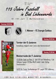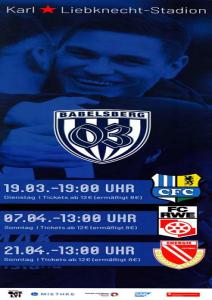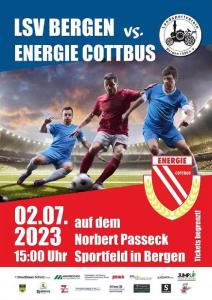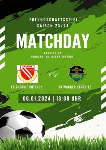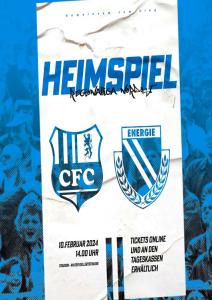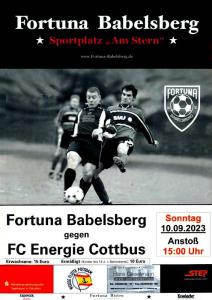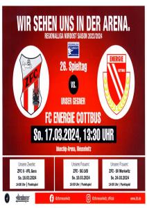 Ankündigungsplakate der 1. Mannschaft 30.06.2023, SV Großräschen (A)01.07.2023, FC Bad Liebenwerda (A)02.07.2023, LSV Bergen 1990 (A)08.07.2023, TSG Lübbenau 63 (A)13.07.2023, Zagłębie Lubin II (H)10.09.2023, Fortuna Babelsberg (A)03.10.2023, SG Phönix Wildau 95 (A)29.10.2023, Greifswalder FC (A)06.01.2024, SV Wacker 09 Cottbus-Ströbitz (H)10.02.2024, Chemnitzer FC (A)17.03.2024, ZFC Meuselwitz (A)21.04.2024, SV Babelsberg 03 (A)