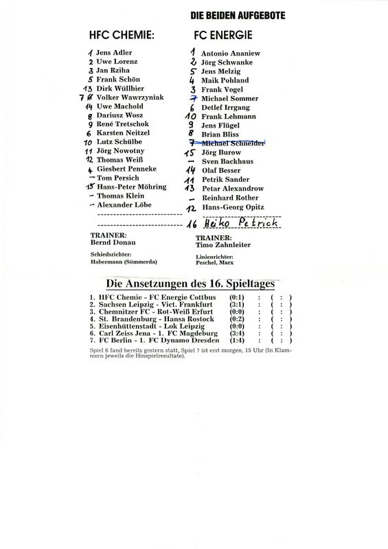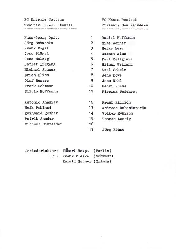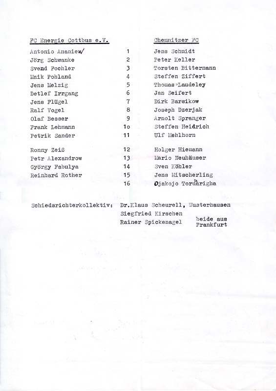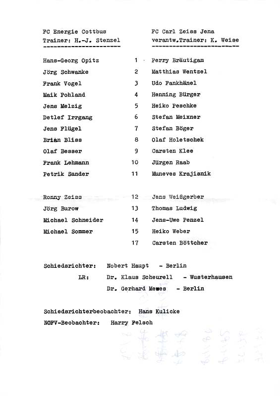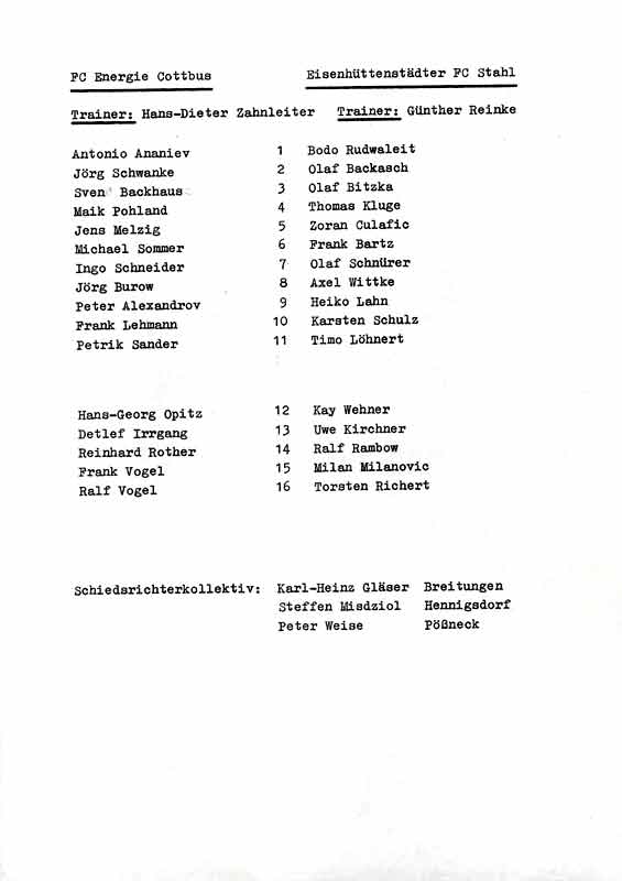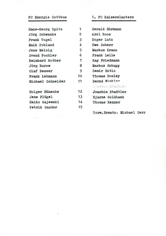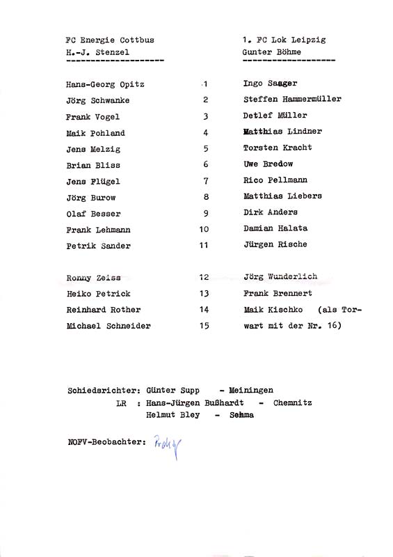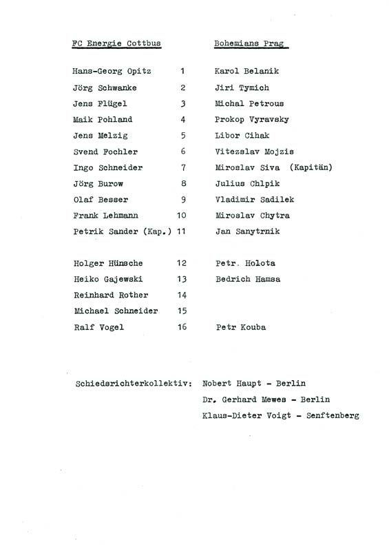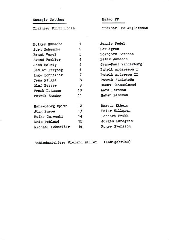 Presseinfos der 1. Mannschaft 30.06.1990, Malmö FF (H)11.07.1990, 1. FC Kaiserslautern (H)21.07.1990, TJ Bohemians CKD Praha (H)22.09.1990, Chemnitzer FC (H)24.11.1990, Eisenhüttenstädter FC Stahl (H)02.03.1991, FC Berlin (H)09.03.1991, Hallescher FC Chemie (A)27.04.1991, F.C. Hansa Rostock (H)11.05.1991, 1. FC Lokomotive Leipzig (H)25.05.1991, FC Carl Zeiss Jena (H)
