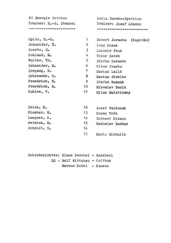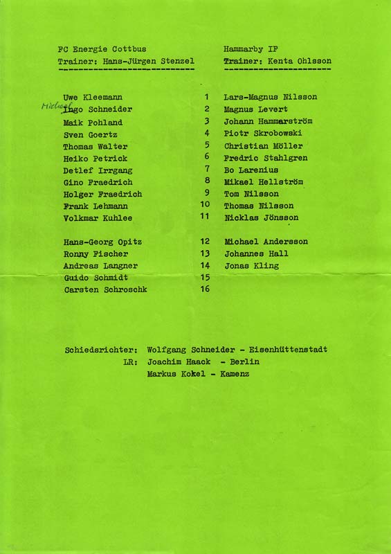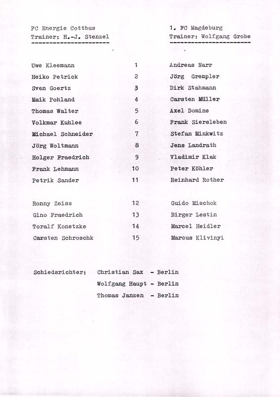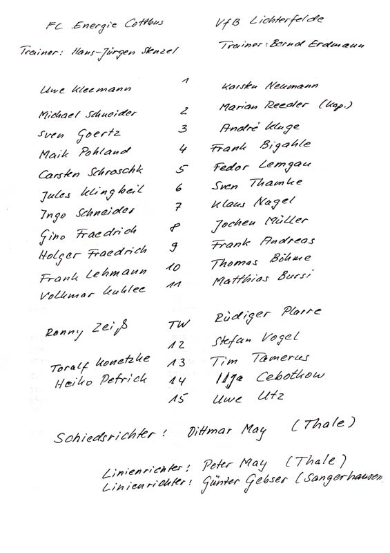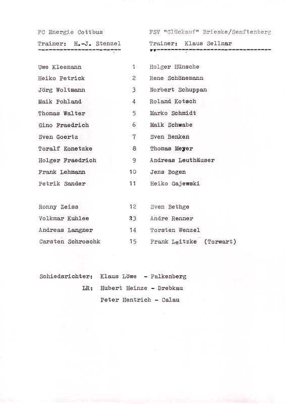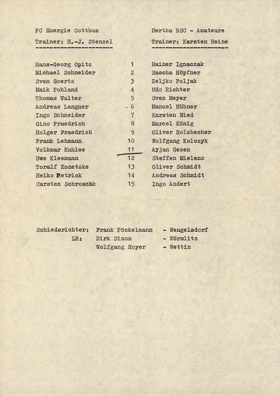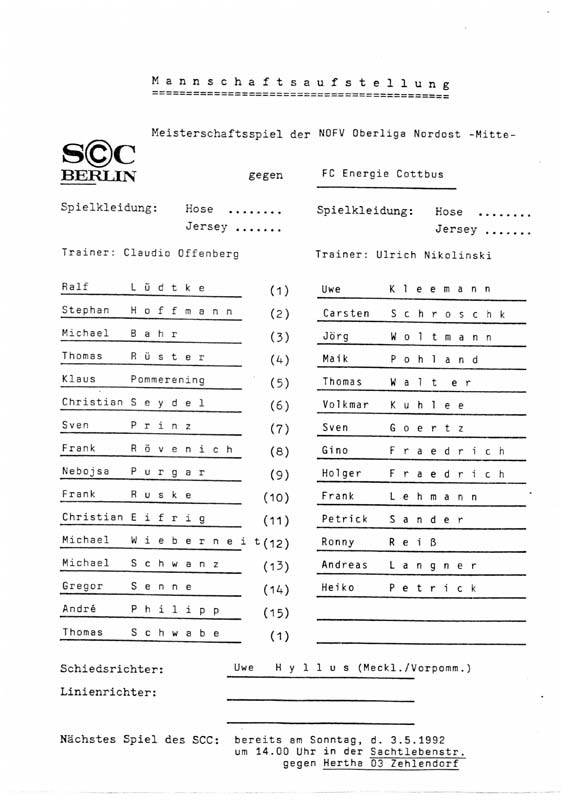 Presseinfos der 1. Mannschaft 06.07.1991, Hammarby IF (H)20.07.1991, ASVŠ Dukla Banská Bystrica (H)25.08.1991, Hertha BSC (A.) (H)16.11.1991, VfB Lichterfelde 1892 (H)05.04.1992, 1. FC Magdeburg (H)12.04.1992, FSV Glückauf Brieske-Senftenberg (H)01.05.1992, SC Charlottenburg (A)