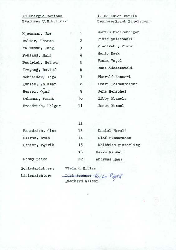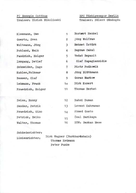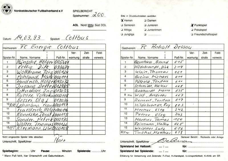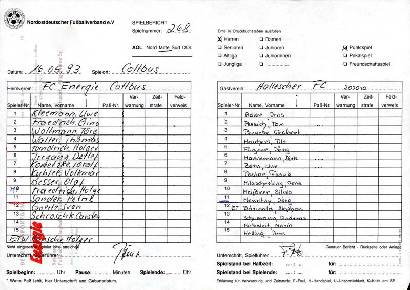 Presseinfos der 1. Mannschaft 08.11.1992, BFC Türkiyemspor 1978 (H)21.11.1992, 1. FC Union Berlin (H)14.03.1993, FC Anhalt Dessau (H)16.05.1993, Hallescher FC (H)