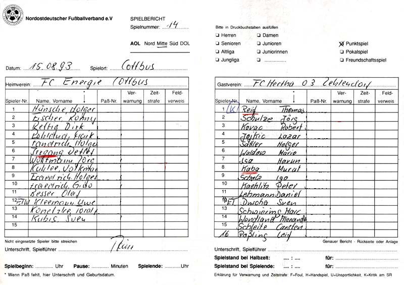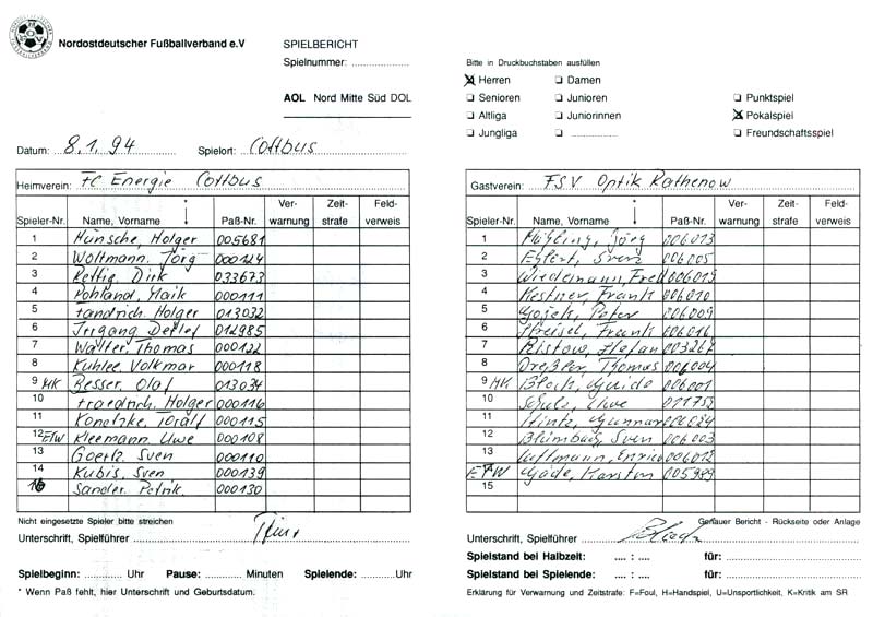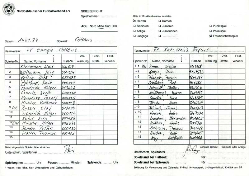 Presseinfos der 1. Mannschaft 15.08.1993, F.C. Hertha 03 Zehlendorf (H)08.01.1994, FSV Optik Rathenow (H)14.01.1994, FC Rot-Weiß Erfurt (H)