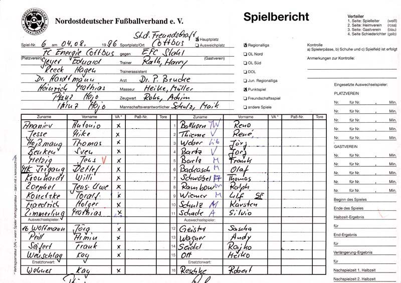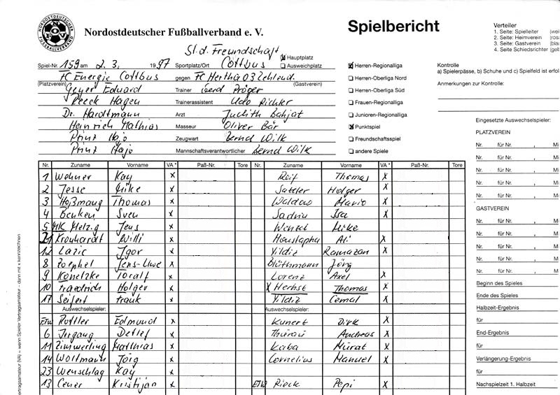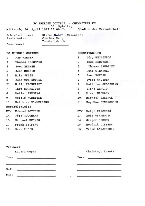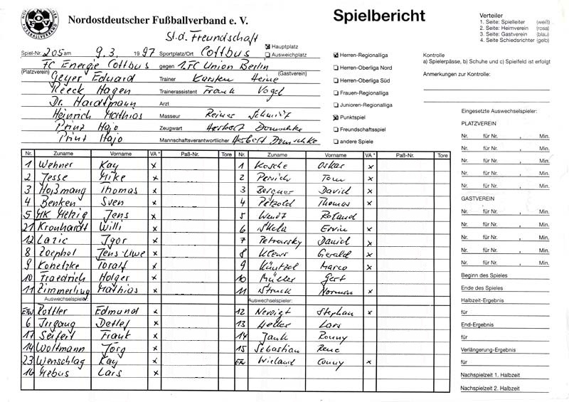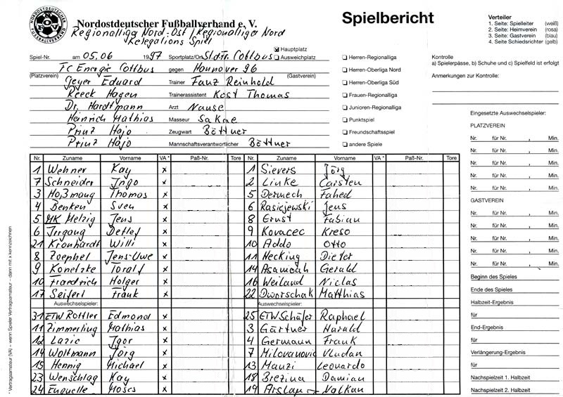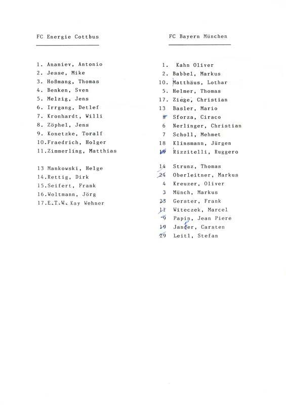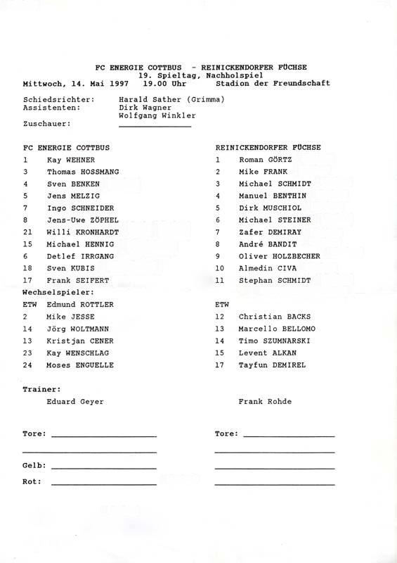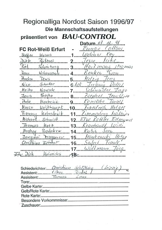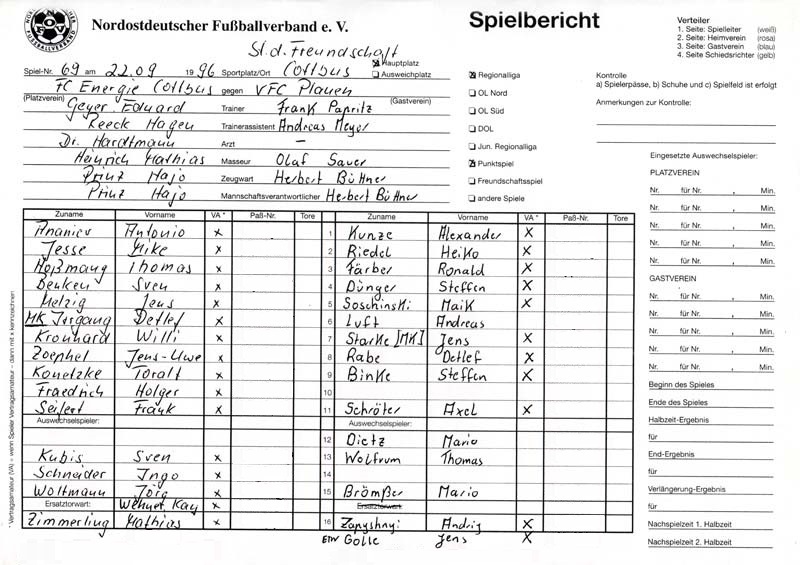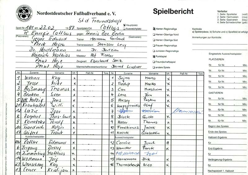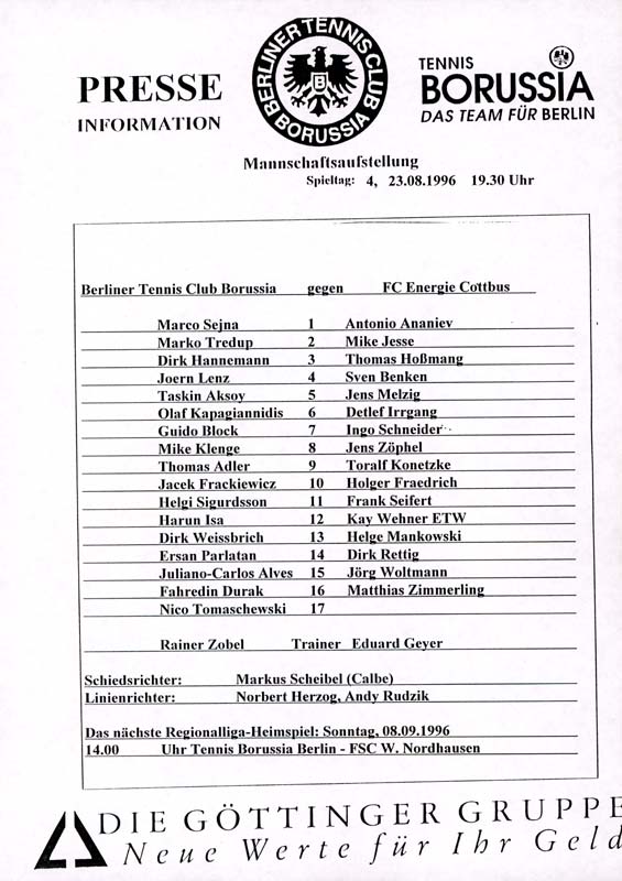 Presseinfos der 1. Mannschaft 24.07.1996, FC Bayern München (H)04.08.1996, Eisenhüttenstädter FC Stahl (H)23.08.1996, Tennis Borussia Berlin (A)31.08.1996, VfL Wolfsburg (H)22.09.1996, VFC Plauen (H)19.10.1996, FC Erzgebirge Aue (H)23.10.1996, MSV Duisburg (H)26.10.1996, SG Blau-Gelb Laubsdorf (A)10.11.1996, FC Sachsen Leipzig (H)22.11.1996, 1. FC Dynamo Dresden (A)30.11.1996, Spandauer SV 1894 (H)07.12.1996, FC Rot-Weiß Erfurt (A)23.02.1997, Tennis Borussia Berlin (H)02.03.1997, F.C. Hertha 03 Zehlendorf (H)09.03.1997, 1. FC Union Berlin (H)29.03.1997, FSV Wacker 90 Nordhausen (H)11.04.1997, FSV Lok Altmark Stendal (H)15.04.1997, Karlsruher SC (H)30.04.1997, Chemnitzer FC (H)14.05.1997, BTSV Reinickendorfer Füchse (H)23.05.1997, FC Rot-Weiß Erfurt (H)29.05.1997, Hannover 96 (A)05.06.1997, Hannover 96 (H)