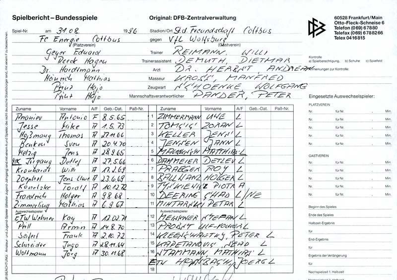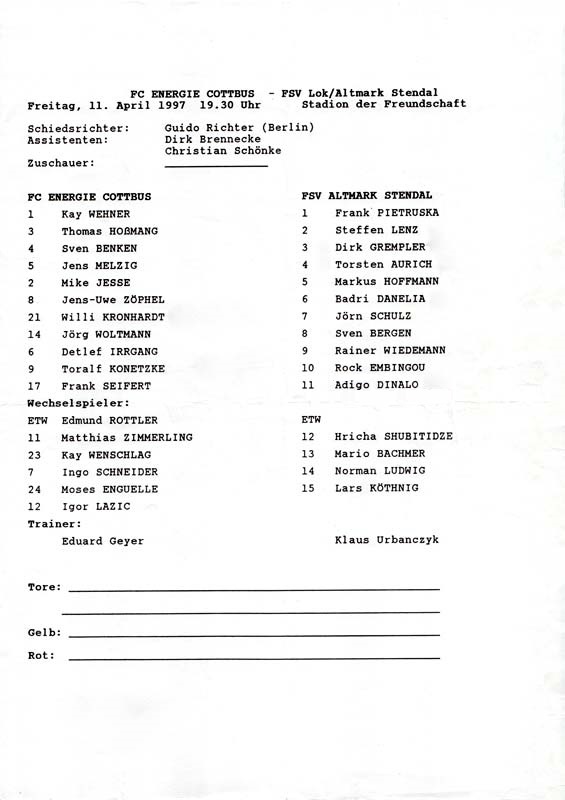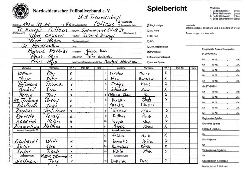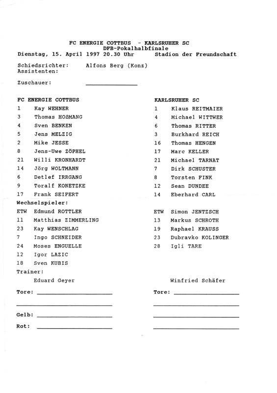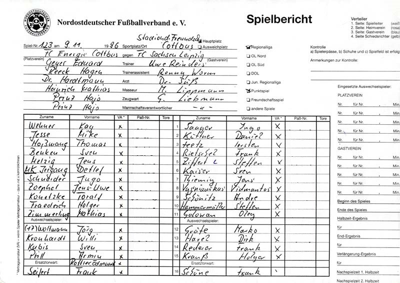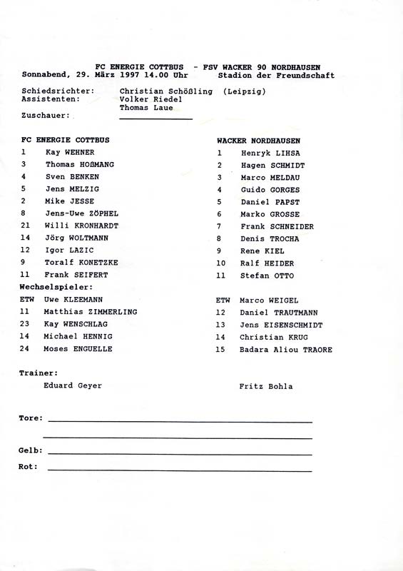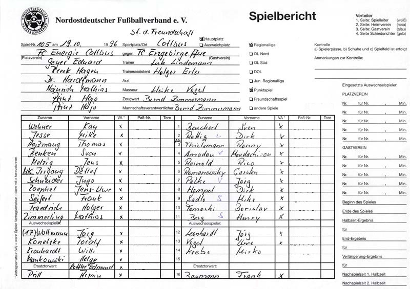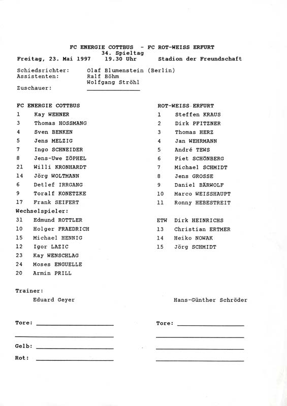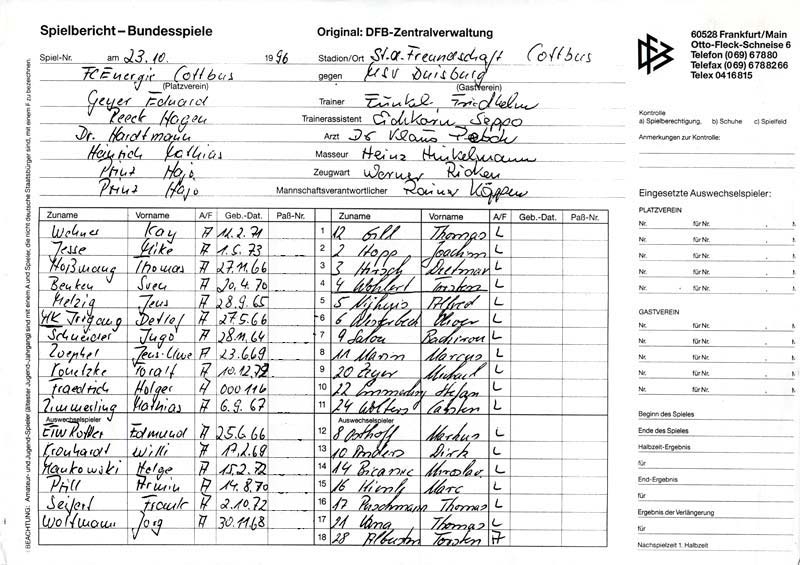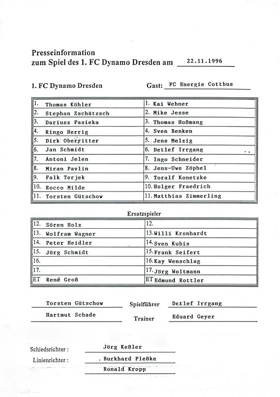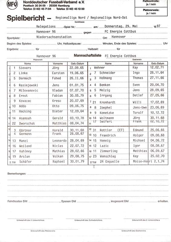 Presseinfos der 1. Mannschaft 24.07.1996, FC Bayern München (H)04.08.1996, Eisenhüttenstädter FC Stahl (H)23.08.1996, Tennis Borussia Berlin (A)31.08.1996, VfL Wolfsburg (H)22.09.1996, VFC Plauen (H)19.10.1996, FC Erzgebirge Aue (H)23.10.1996, MSV Duisburg (H)26.10.1996, SG Blau-Gelb Laubsdorf (A)10.11.1996, FC Sachsen Leipzig (H)22.11.1996, 1. FC Dynamo Dresden (A)30.11.1996, Spandauer SV 1894 (H)07.12.1996, FC Rot-Weiß Erfurt (A)23.02.1997, Tennis Borussia Berlin (H)02.03.1997, F.C. Hertha 03 Zehlendorf (H)09.03.1997, 1. FC Union Berlin (H)29.03.1997, FSV Wacker 90 Nordhausen (H)11.04.1997, FSV Lok Altmark Stendal (H)15.04.1997, Karlsruher SC (H)30.04.1997, Chemnitzer FC (H)14.05.1997, BTSV Reinickendorfer Füchse (H)23.05.1997, FC Rot-Weiß Erfurt (H)29.05.1997, Hannover 96 (A)05.06.1997, Hannover 96 (H)