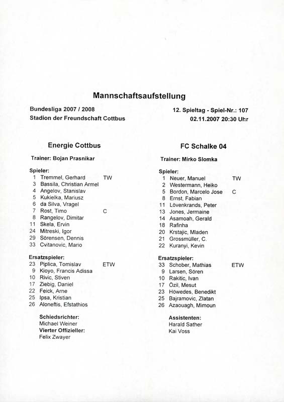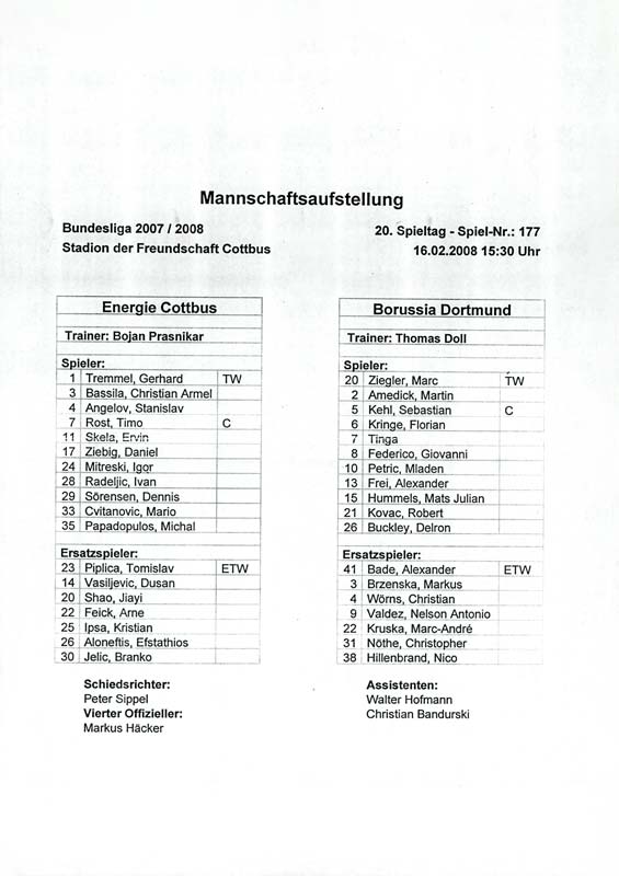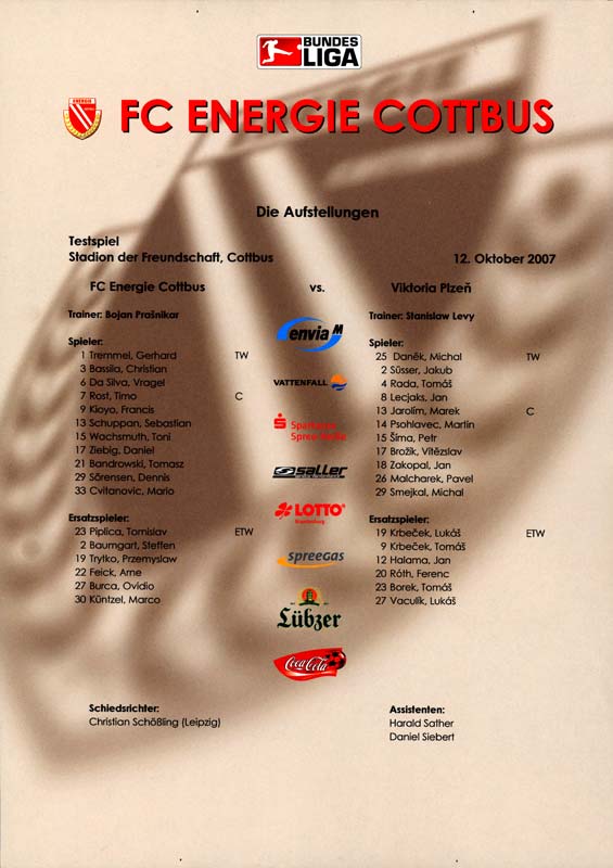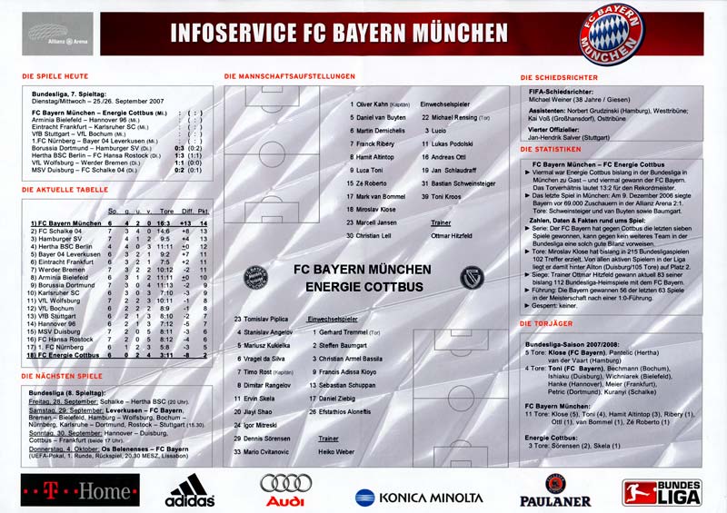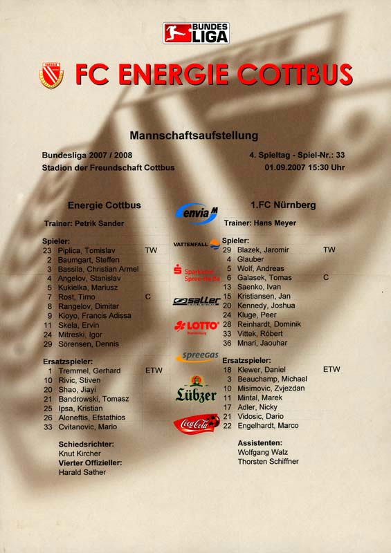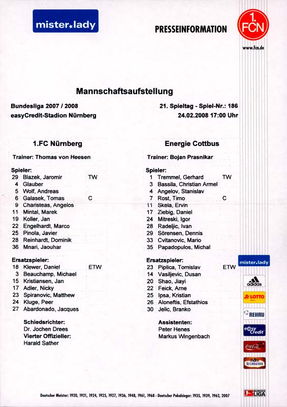 Presseinfos der 1. Mannschaft 01.09.2007, 1. FC Nürnberg (H)26.09.2007, FC Bayern München (A)12.10.2007, FC Viktoria Plzeň (H)02.11.2007, FC Schalke 04 (H)16.02.2008, BV Borussia 09 Dortmund (H)24.02.2008, 1. FC Nürnberg (A)