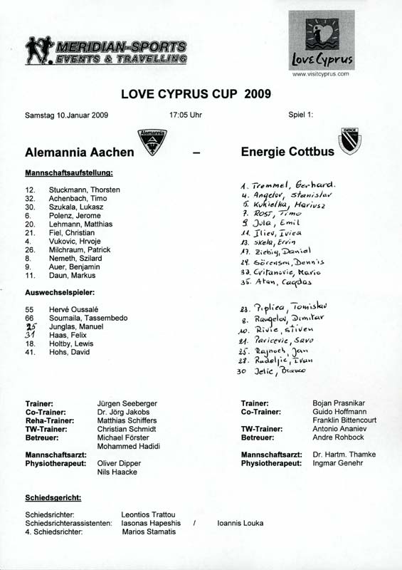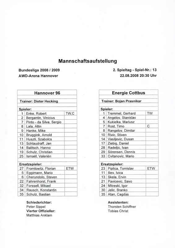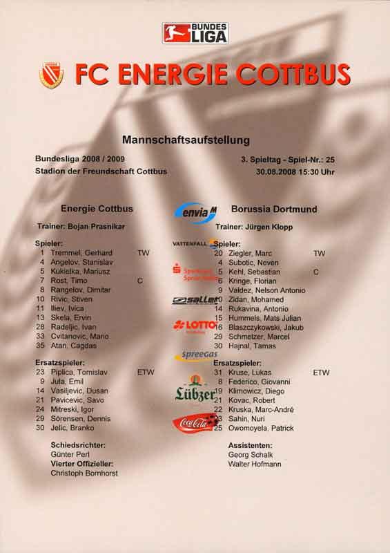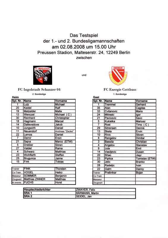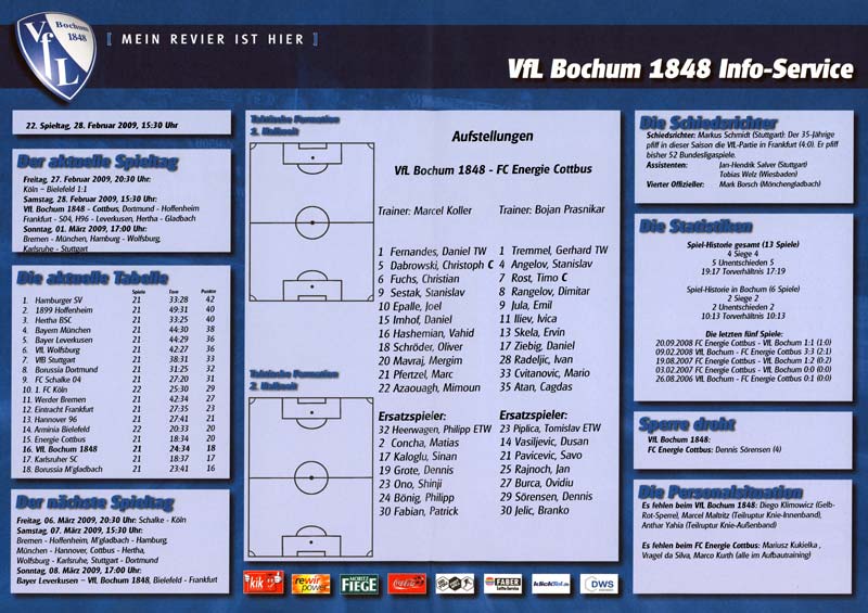 Presseinfos der 1. Mannschaft 02.08.2008, FC Ingolstadt 04 (N)22.08.2008, Hannover 96 (A)30.08.2008, BV Borussia 09 Dortmund (H)10.01.2009, TSV Alemannia Aachen (N)28.02.2009, VfL Bochum 1848 (A)