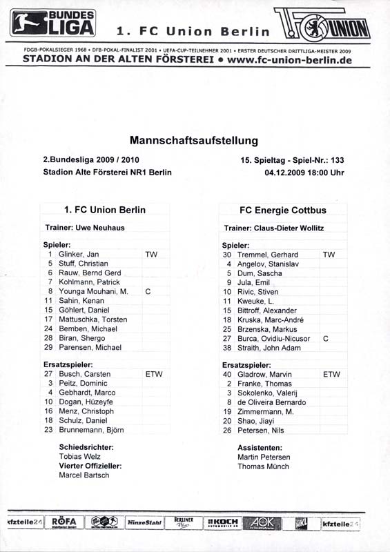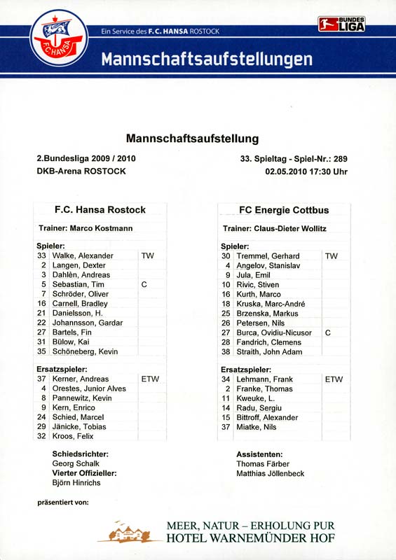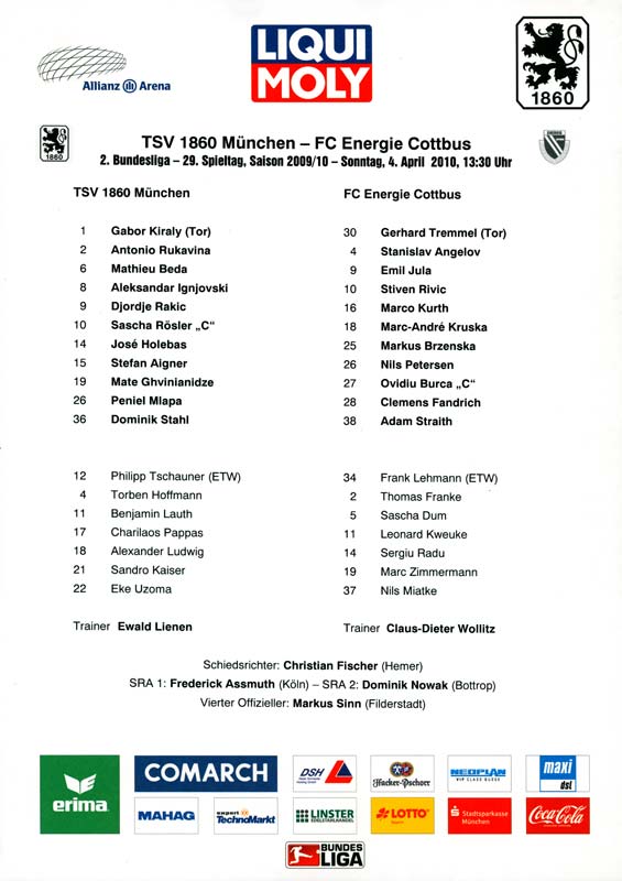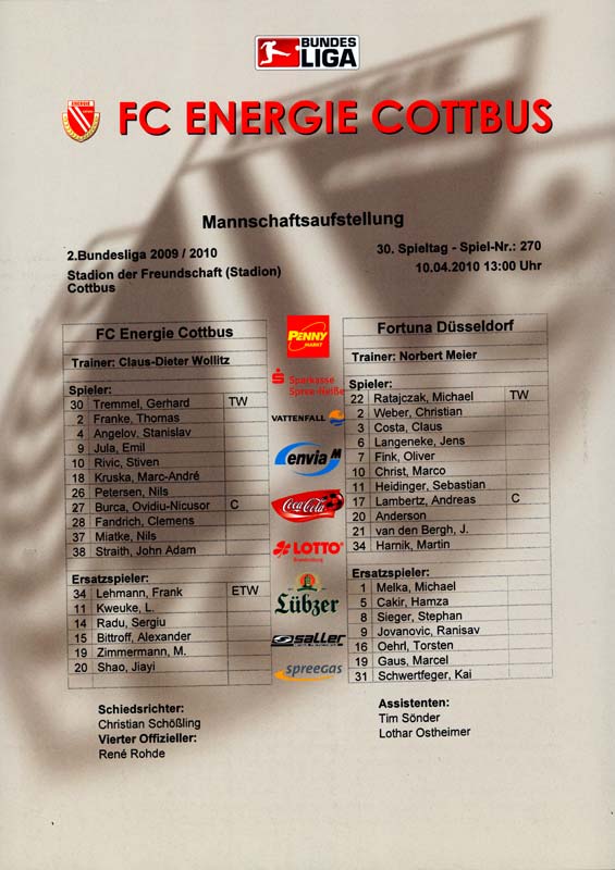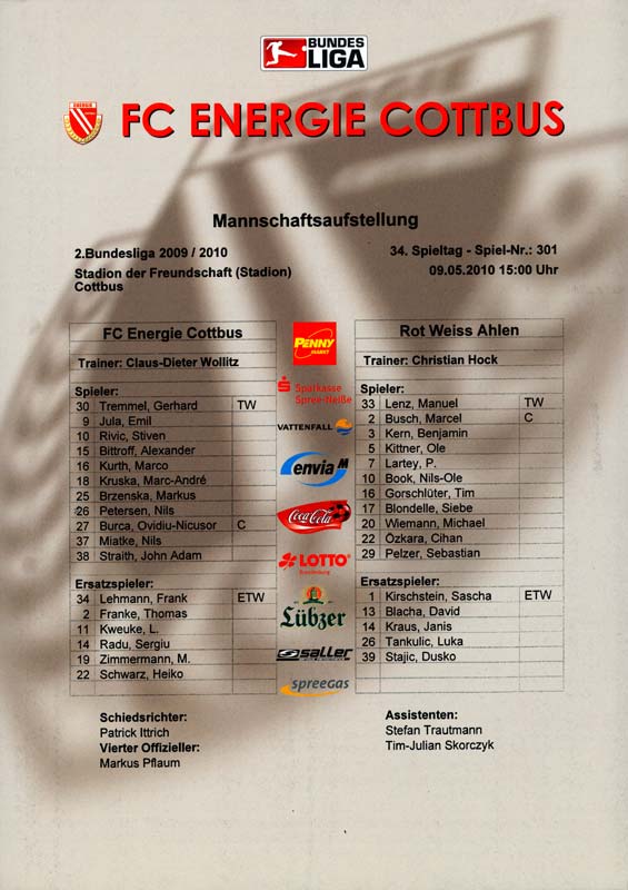 Presseinfos der 1. Mannschaft 04.12.2009, 1. FC Union Berlin (A)04.04.2010, TSV 1860 München (A)10.04.2010, TSV Fortuna Düsseldorf (H)02.05.2010, F.C. Hansa Rostock (A)09.05.2010, Rot Weiss Ahlen (H)