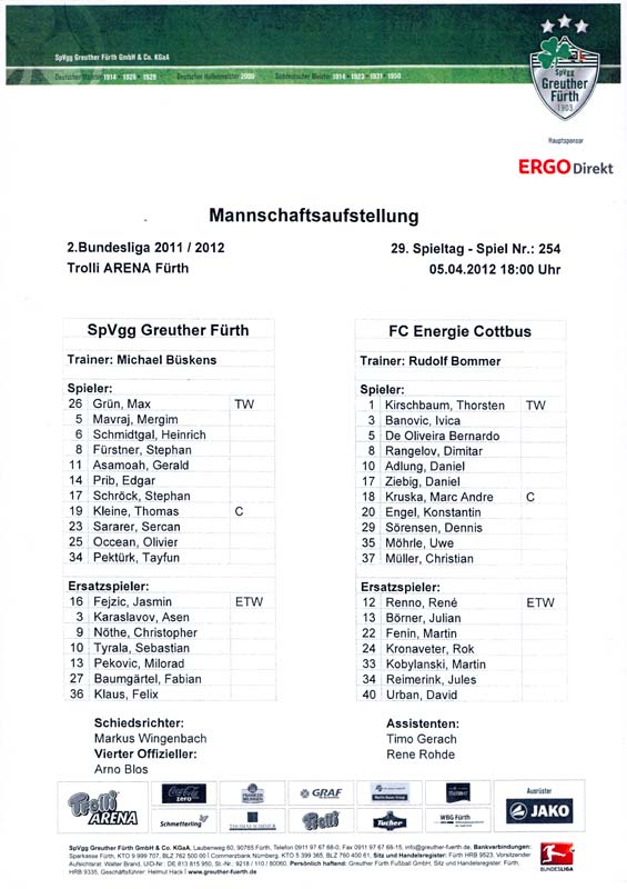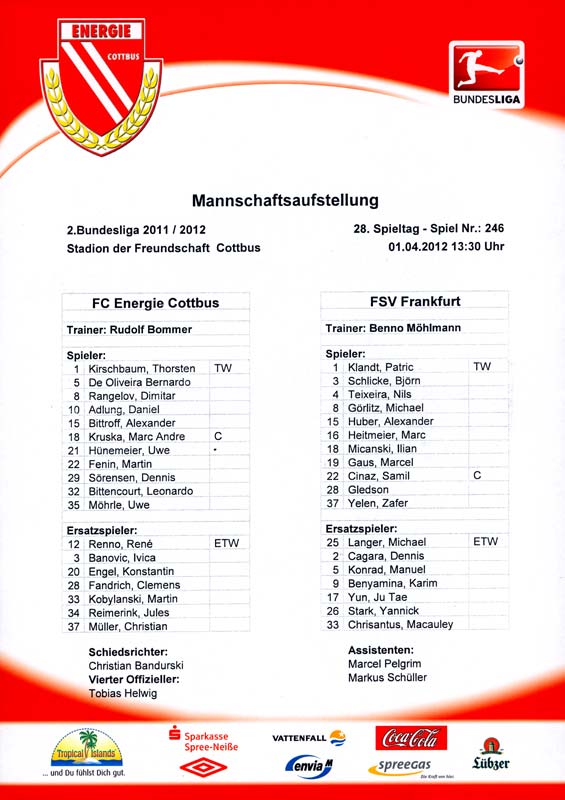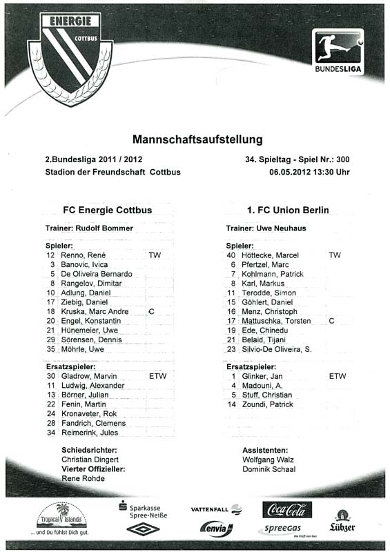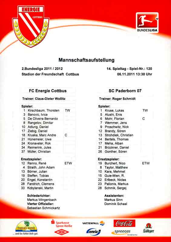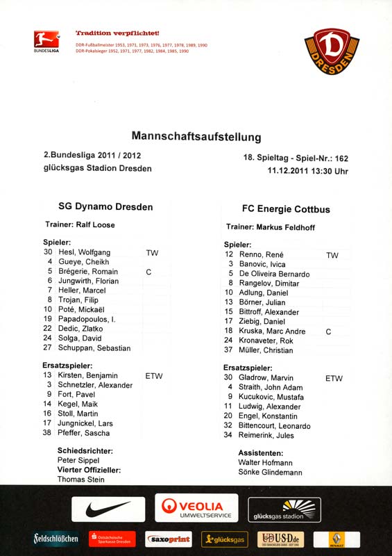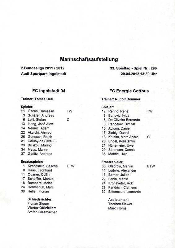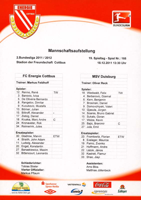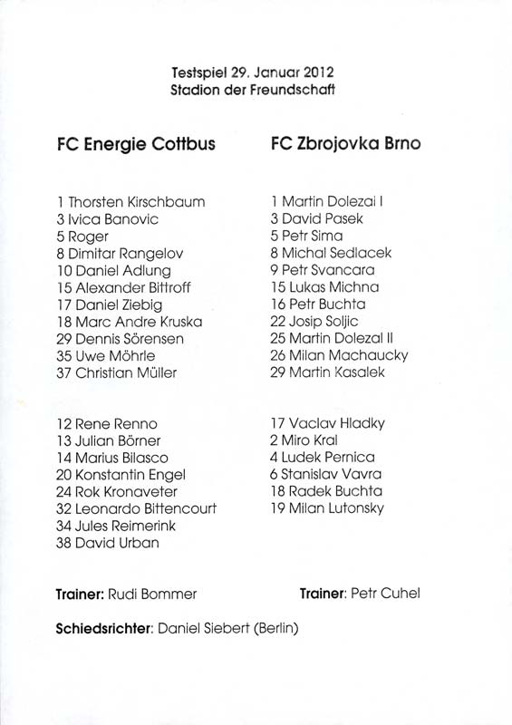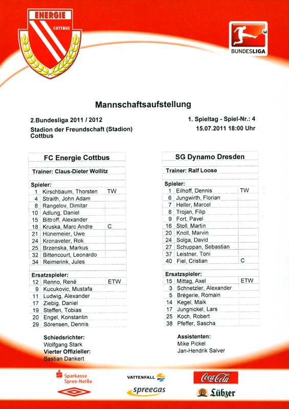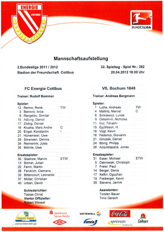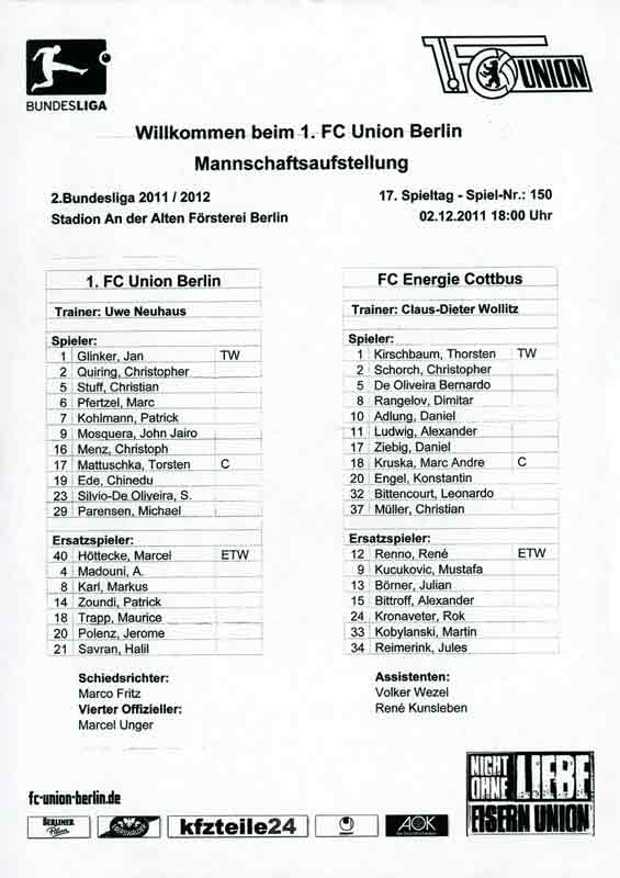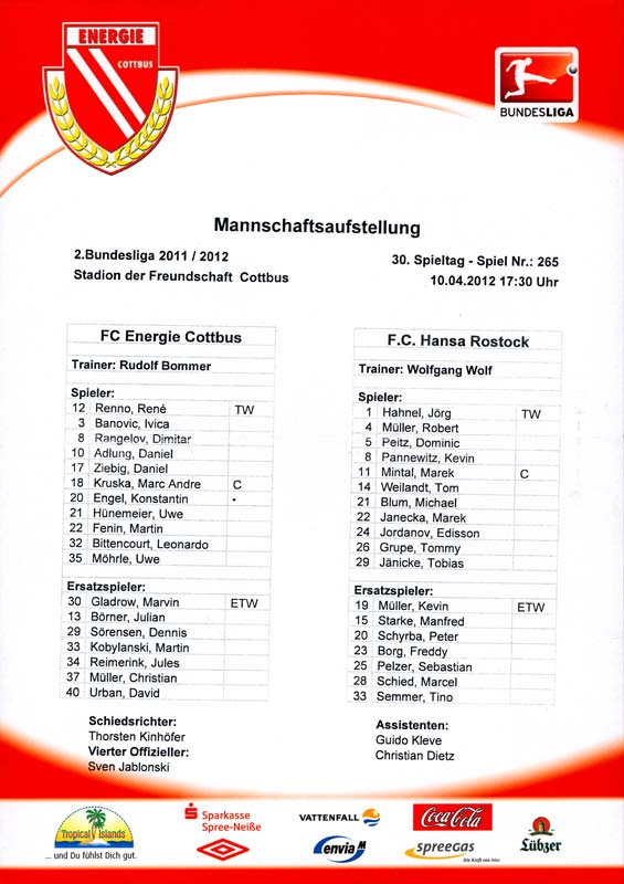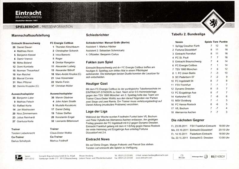 Presseinfos der 1. Mannschaft 24.06.2011, NFV Gelb-Weiß Görlitz 09 (A)05.07.2011, FK Teplice (H)09.07.2011, FK Dukla Praha (H)15.07.2011, SG Dynamo Dresden (H)22.07.2011, MSV Duisburg (A)30.07.2011, Kieler S.V. Holstein 1900 (A)06.08.2011, TSV 1860 München (H)13.08.2011, TSV Alemannia Aachen (A)21.08.2011, Karlsruher SC (H)29.08.2011, FC Erzgebirge Aue (A)10.09.2011, Eintracht Frankfurt (H)17.09.2011, TSV Eintracht Braunschweig (A)24.09.2011, TSV Fortuna Düsseldorf (A)01.10.2011, FC St. Pauli 1910 (H)16.10.2011, FSV Frankfurt 1899 (A)22.10.2011, SpVgg Greuther Fürth 1903 (H)06.11.2011, SC Paderborn 07 (H)02.12.2011, 1. FC Union Berlin (A)11.12.2011, SG Dynamo Dresden (A)18.12.2011, MSV Duisburg (H)13.01.2012, Hallescher FC (H)29.01.2012, FC Zbrojovka Brno (H)06.02.2012, TSV 1860 München (A)10.02.2012, TSV Alemannia Aachen (H)17.02.2012, Karlsruher SC (A)25.02.2012, FC Erzgebirge Aue (H)04.03.2012, Eintracht Frankfurt (A)11.03.2012, TSV Eintracht Braunschweig (H)19.03.2012, TSV Fortuna Düsseldorf (H)01.04.2012, FSV Frankfurt 1899 (H)05.04.2012, SpVgg Greuther Fürth 1903 (A)10.04.2012, F.C. Hansa Rostock (H)15.04.2012, SC Paderborn 07 (A)20.04.2012, VfL Bochum 1848 (H)29.04.2012, FC Ingolstadt 04 (A)06.05.2012, 1. FC Union Berlin (H)
