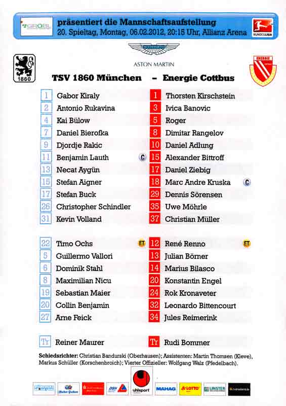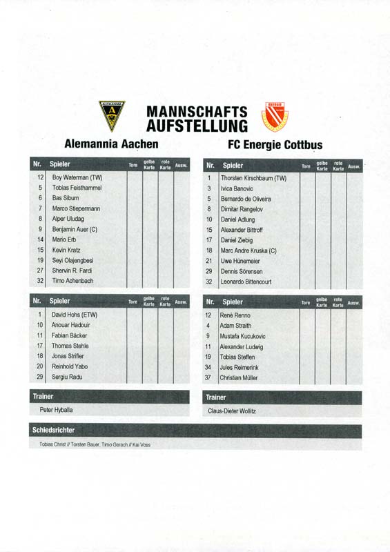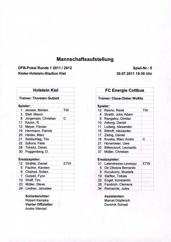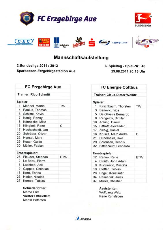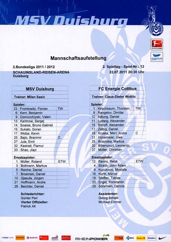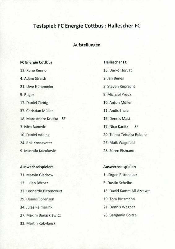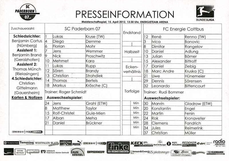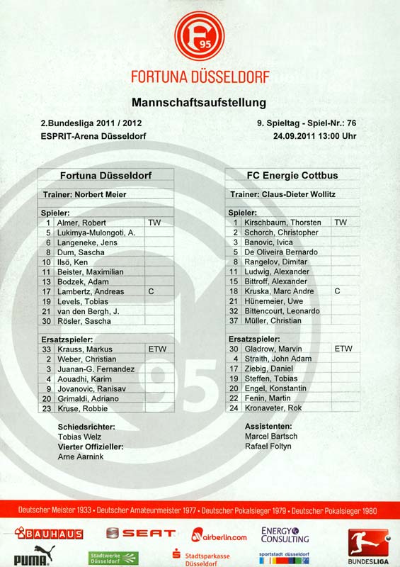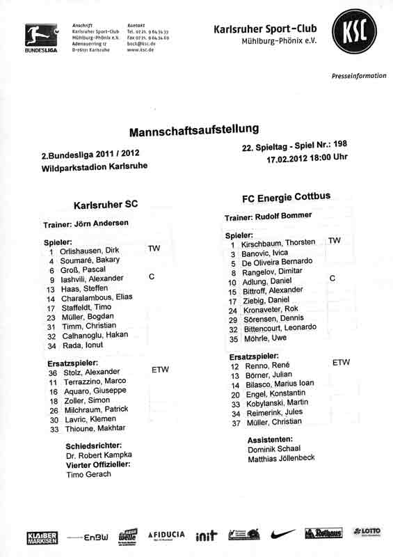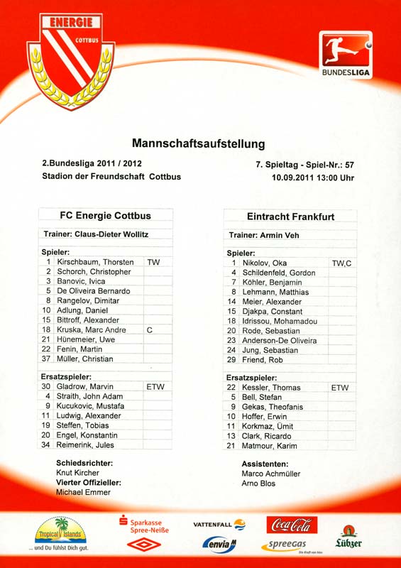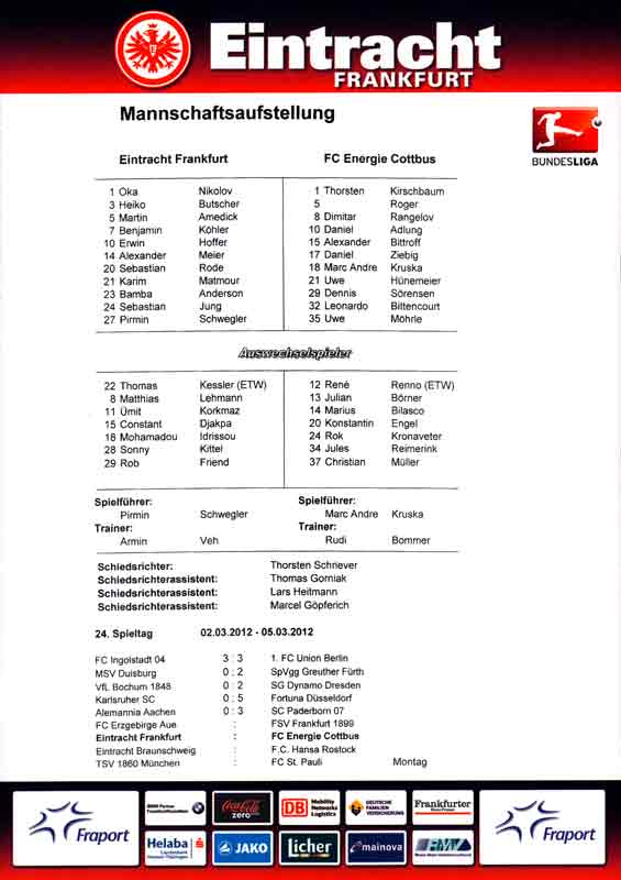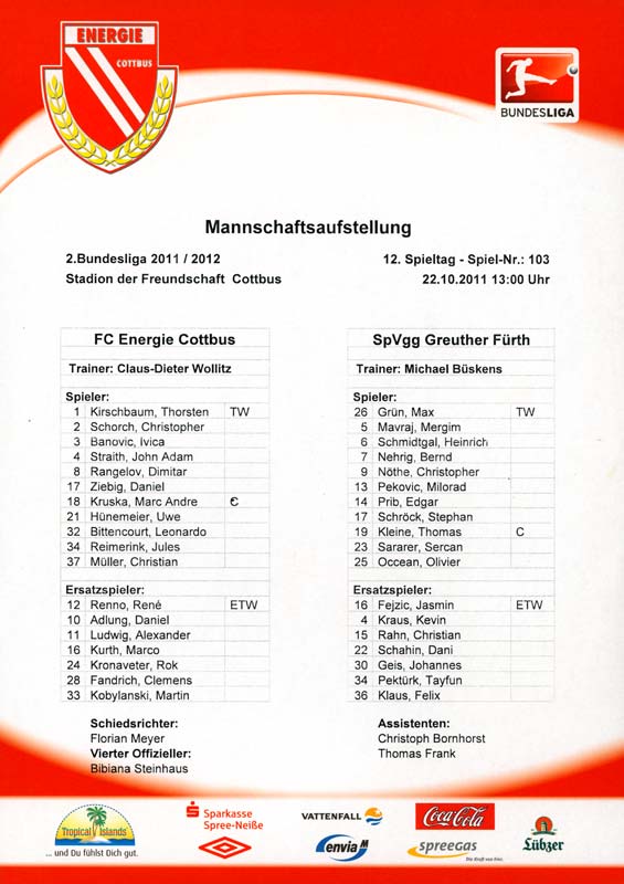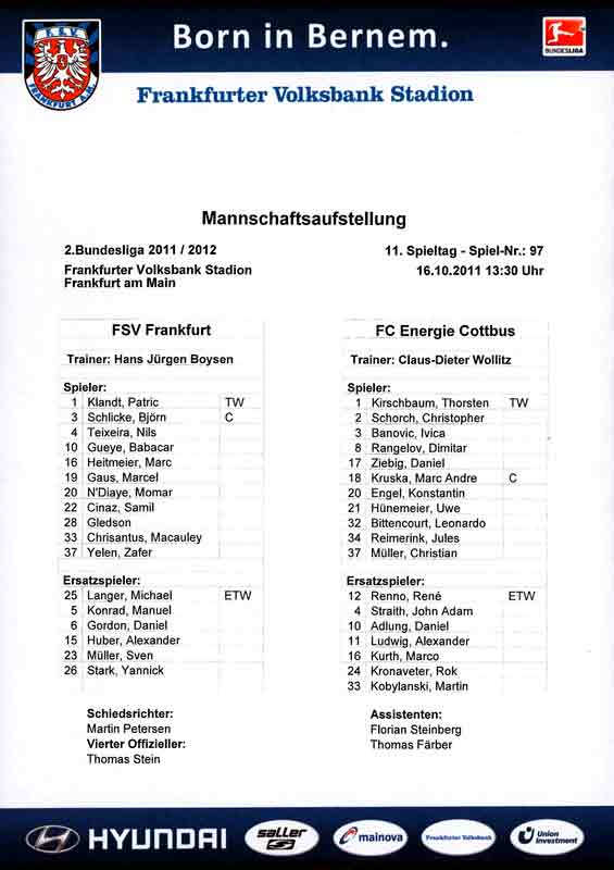 Presseinfos der 1. Mannschaft 24.06.2011, NFV Gelb-Weiß Görlitz 09 (A)05.07.2011, FK Teplice (H)09.07.2011, FK Dukla Praha (H)15.07.2011, SG Dynamo Dresden (H)22.07.2011, MSV Duisburg (A)30.07.2011, Kieler S.V. Holstein 1900 (A)06.08.2011, TSV 1860 München (H)13.08.2011, TSV Alemannia Aachen (A)21.08.2011, Karlsruher SC (H)29.08.2011, FC Erzgebirge Aue (A)10.09.2011, Eintracht Frankfurt (H)17.09.2011, TSV Eintracht Braunschweig (A)24.09.2011, TSV Fortuna Düsseldorf (A)01.10.2011, FC St. Pauli 1910 (H)16.10.2011, FSV Frankfurt 1899 (A)22.10.2011, SpVgg Greuther Fürth 1903 (H)06.11.2011, SC Paderborn 07 (H)02.12.2011, 1. FC Union Berlin (A)11.12.2011, SG Dynamo Dresden (A)18.12.2011, MSV Duisburg (H)13.01.2012, Hallescher FC (H)29.01.2012, FC Zbrojovka Brno (H)06.02.2012, TSV 1860 München (A)10.02.2012, TSV Alemannia Aachen (H)17.02.2012, Karlsruher SC (A)25.02.2012, FC Erzgebirge Aue (H)04.03.2012, Eintracht Frankfurt (A)11.03.2012, TSV Eintracht Braunschweig (H)19.03.2012, TSV Fortuna Düsseldorf (H)01.04.2012, FSV Frankfurt 1899 (H)05.04.2012, SpVgg Greuther Fürth 1903 (A)10.04.2012, F.C. Hansa Rostock (H)15.04.2012, SC Paderborn 07 (A)20.04.2012, VfL Bochum 1848 (H)29.04.2012, FC Ingolstadt 04 (A)06.05.2012, 1. FC Union Berlin (H)