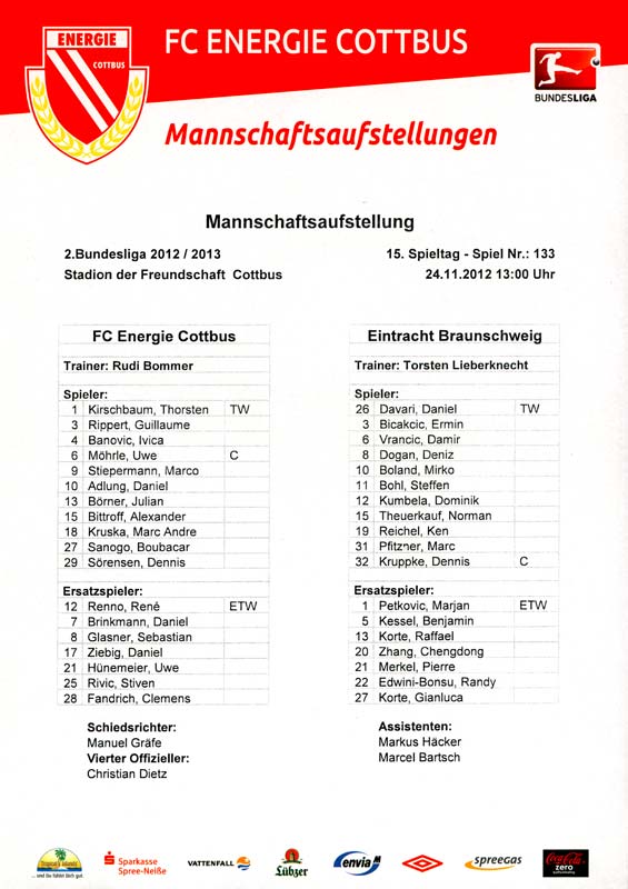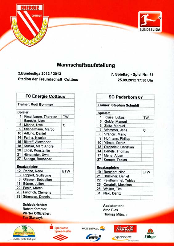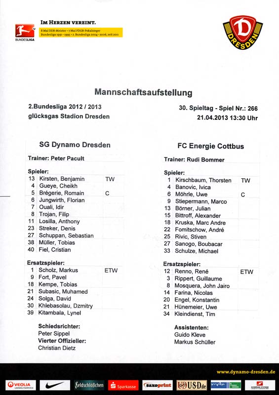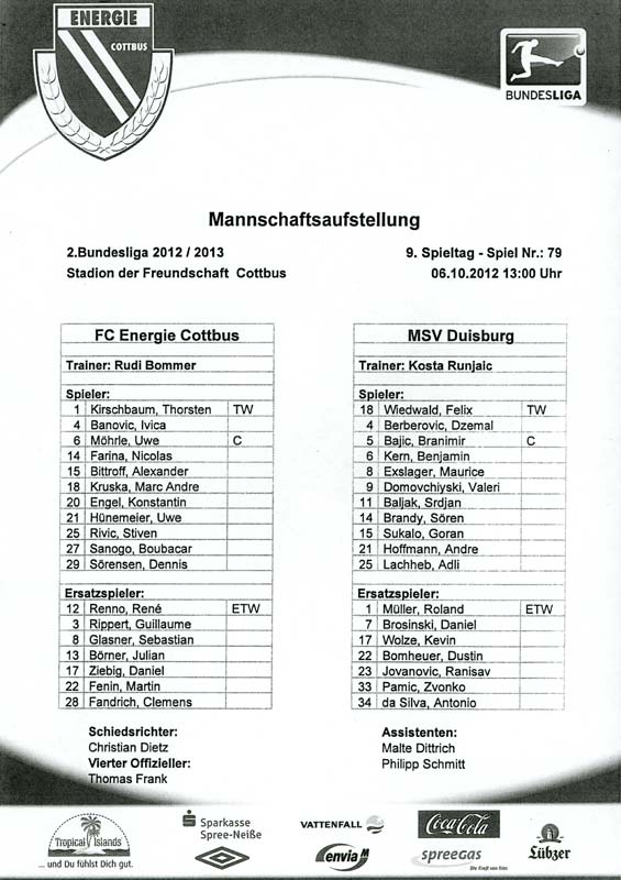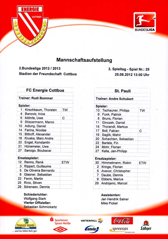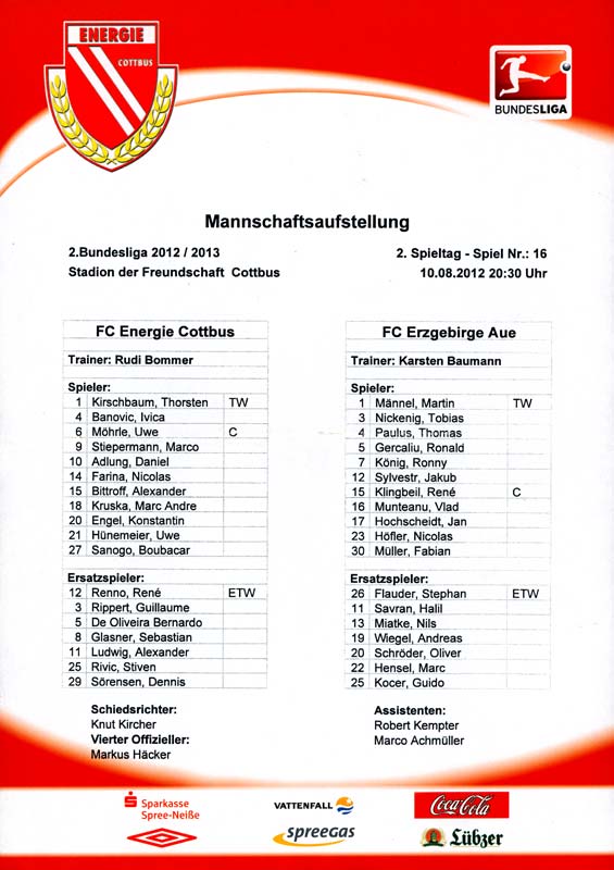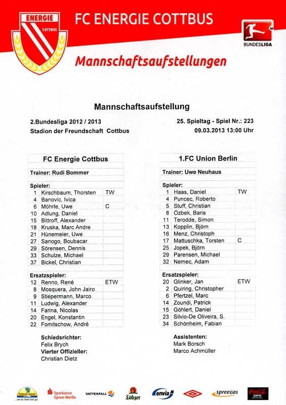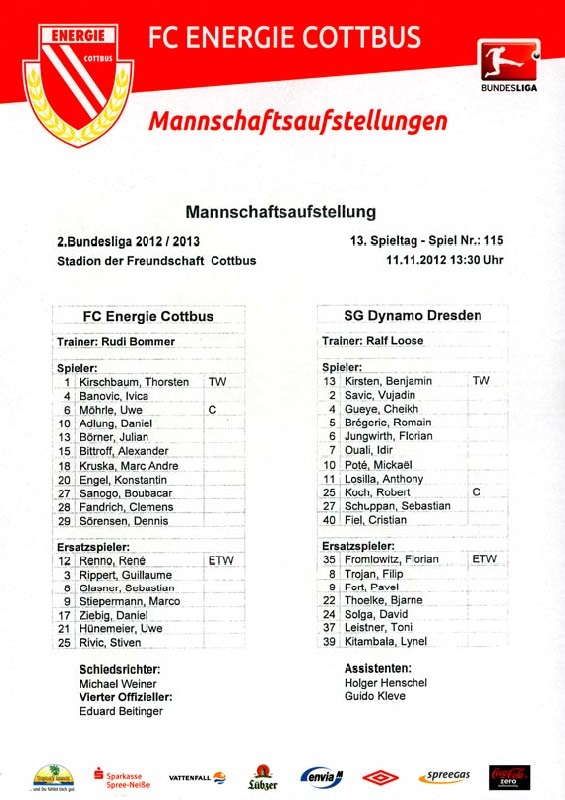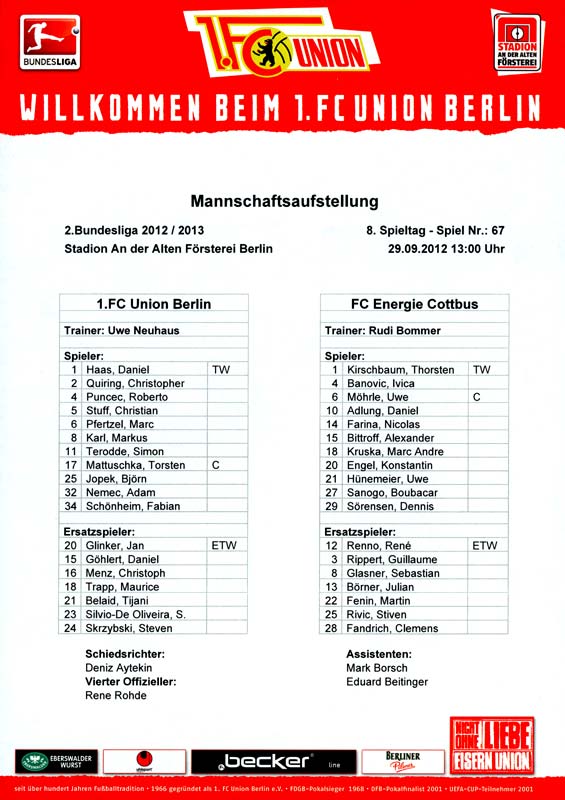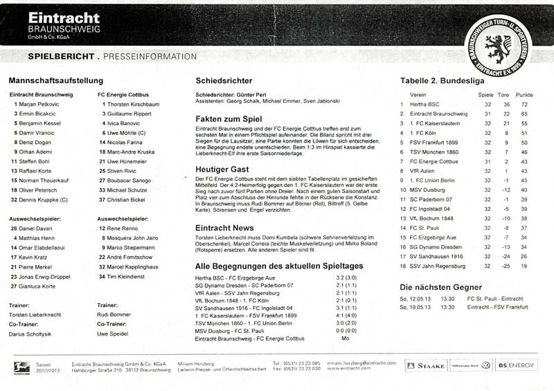 Presseinfos der 1. Mannschaft 29.07.2012, West Ham United F.C. (H)03.08.2012, FC Ingolstadt 04 (A)10.08.2012, FC Erzgebirge Aue (H)25.08.2012, FC St. Pauli 1910 (H)31.08.2012, 1. FC Köln (A)14.09.2012, FSV Frankfurt 1899 (H)22.09.2012, SSV Jahn Regensburg (A)25.09.2012, SC Paderborn 07 (H)29.09.2012, 1. FC Union Berlin (A)06.10.2012, MSV Duisburg (H)21.10.2012, VfR Aalen 1921 (A)26.10.2012, TSV 1860 München (H)04.11.2012, VfL Bochum 1848 (A)11.11.2012, SG Dynamo Dresden (H)16.11.2012, 1. FC Kaiserslautern (A)24.11.2012, TSV Eintracht Braunschweig (H)28.11.2012, SV Sandhausen 1916 (A)03.12.2012, Hertha BSC (H)09.12.2012, FC Ingolstadt 04 (H)14.12.2012, FC Erzgebirge Aue (A)09.01.2013, Berliner AK 07 (H)26.01.2013, Brøndby IF (H)03.02.2013, FC St. Pauli 1910 (A)09.02.2013, 1. FC Köln (H)17.02.2013, FSV Frankfurt 1899 (A)24.02.2013, SSV Jahn Regensburg (H)01.03.2013, SC Paderborn 07 (A)09.03.2013, 1. FC Union Berlin (H)15.03.2013, MSV Duisburg (A)28.03.2013, VfR Aalen 1921 (H)07.04.2013, TSV 1860 München (A)14.04.2013, VfL Bochum 1848 (H)21.04.2013, SG Dynamo Dresden (A)29.04.2013, 1. FC Kaiserslautern (H)06.05.2013, TSV Eintracht Braunschweig (A)12.05.2013, SV Sandhausen 1916 (H)