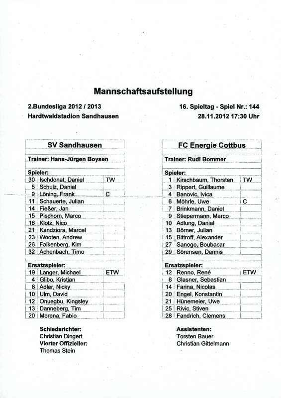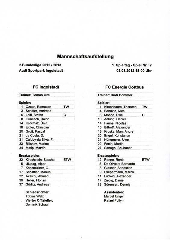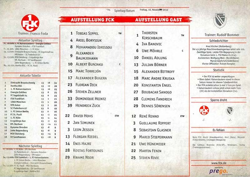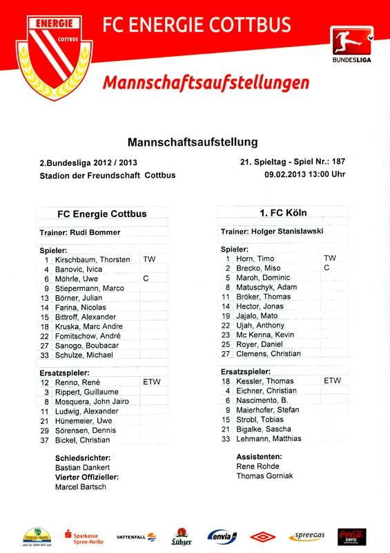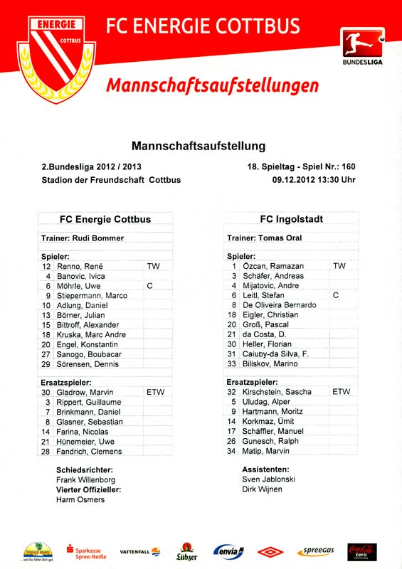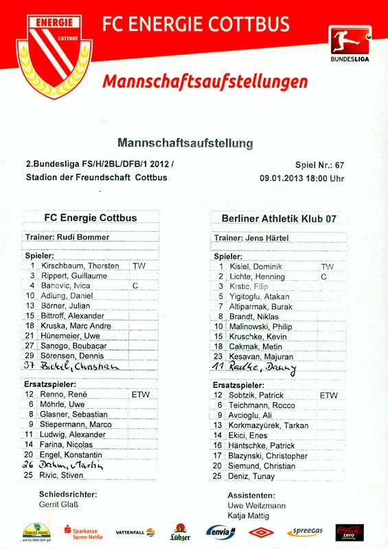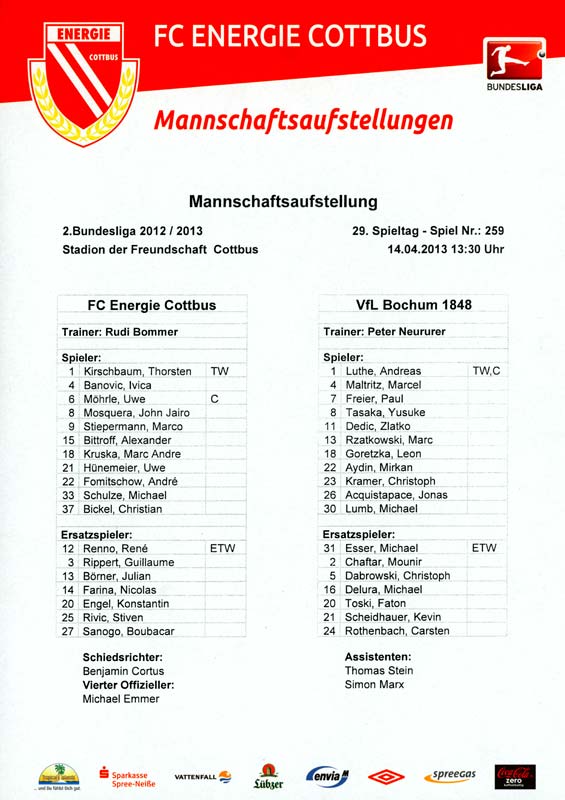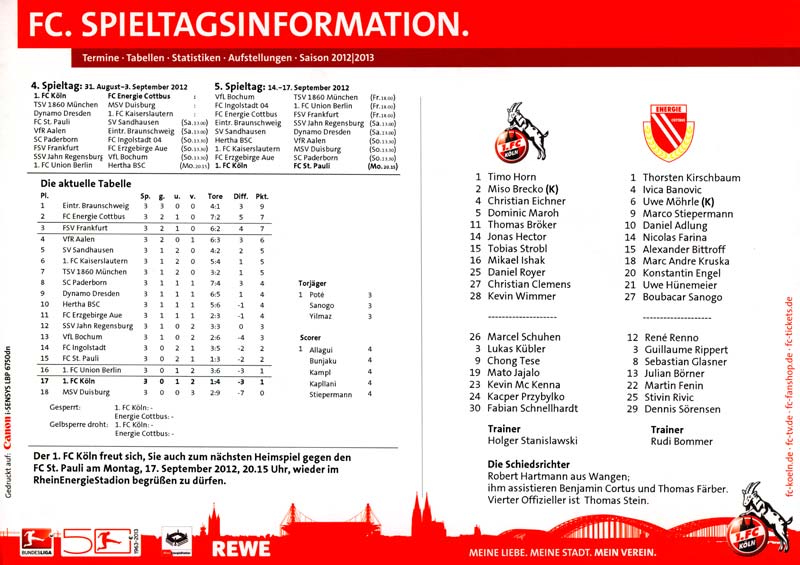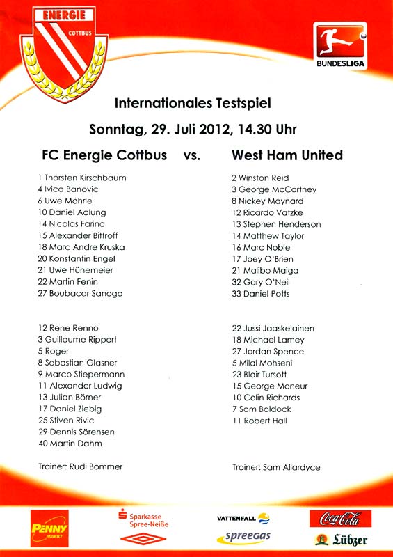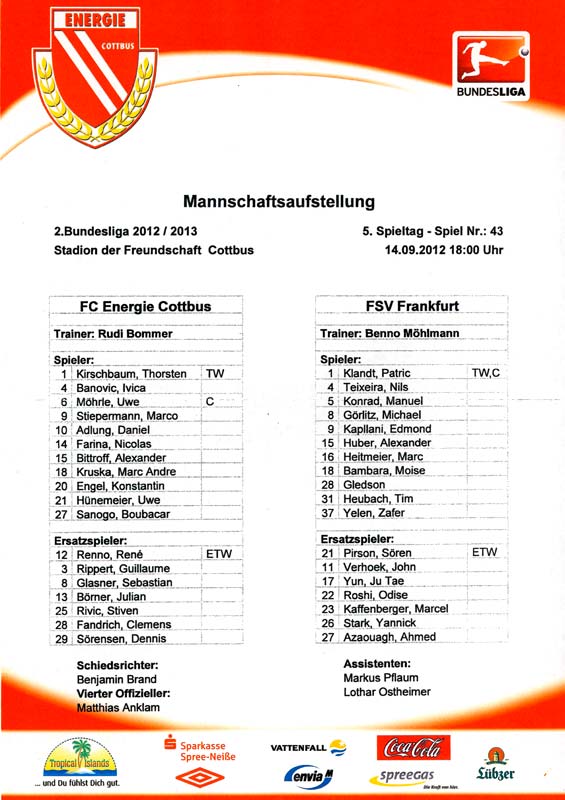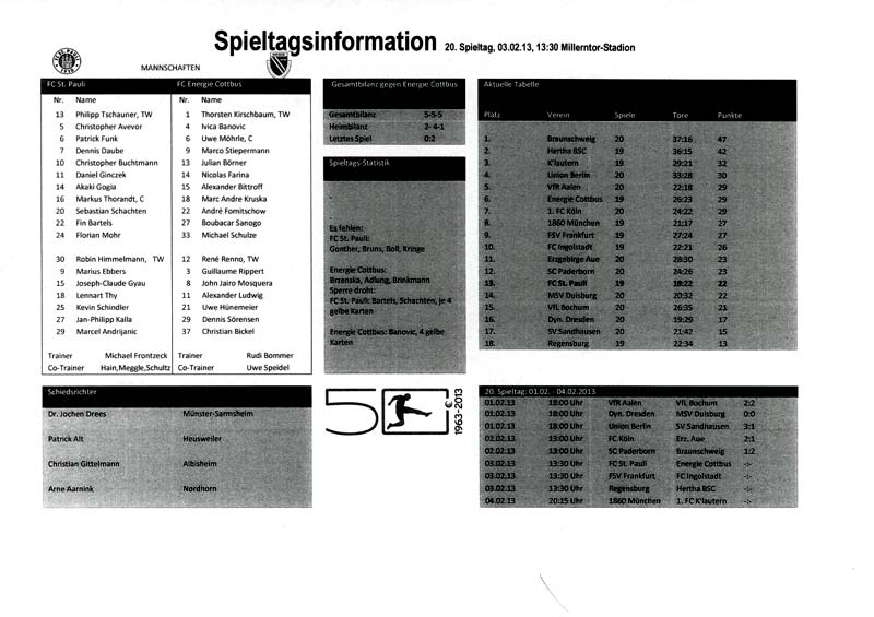 Presseinfos der 1. Mannschaft 29.07.2012, West Ham United F.C. (H)03.08.2012, FC Ingolstadt 04 (A)10.08.2012, FC Erzgebirge Aue (H)25.08.2012, FC St. Pauli 1910 (H)31.08.2012, 1. FC Köln (A)14.09.2012, FSV Frankfurt 1899 (H)22.09.2012, SSV Jahn Regensburg (A)25.09.2012, SC Paderborn 07 (H)29.09.2012, 1. FC Union Berlin (A)06.10.2012, MSV Duisburg (H)21.10.2012, VfR Aalen 1921 (A)26.10.2012, TSV 1860 München (H)04.11.2012, VfL Bochum 1848 (A)11.11.2012, SG Dynamo Dresden (H)16.11.2012, 1. FC Kaiserslautern (A)24.11.2012, TSV Eintracht Braunschweig (H)28.11.2012, SV Sandhausen 1916 (A)03.12.2012, Hertha BSC (H)09.12.2012, FC Ingolstadt 04 (H)14.12.2012, FC Erzgebirge Aue (A)09.01.2013, Berliner AK 07 (H)26.01.2013, Brøndby IF (H)03.02.2013, FC St. Pauli 1910 (A)09.02.2013, 1. FC Köln (H)17.02.2013, FSV Frankfurt 1899 (A)24.02.2013, SSV Jahn Regensburg (H)01.03.2013, SC Paderborn 07 (A)09.03.2013, 1. FC Union Berlin (H)15.03.2013, MSV Duisburg (A)28.03.2013, VfR Aalen 1921 (H)07.04.2013, TSV 1860 München (A)14.04.2013, VfL Bochum 1848 (H)21.04.2013, SG Dynamo Dresden (A)29.04.2013, 1. FC Kaiserslautern (H)06.05.2013, TSV Eintracht Braunschweig (A)12.05.2013, SV Sandhausen 1916 (H)