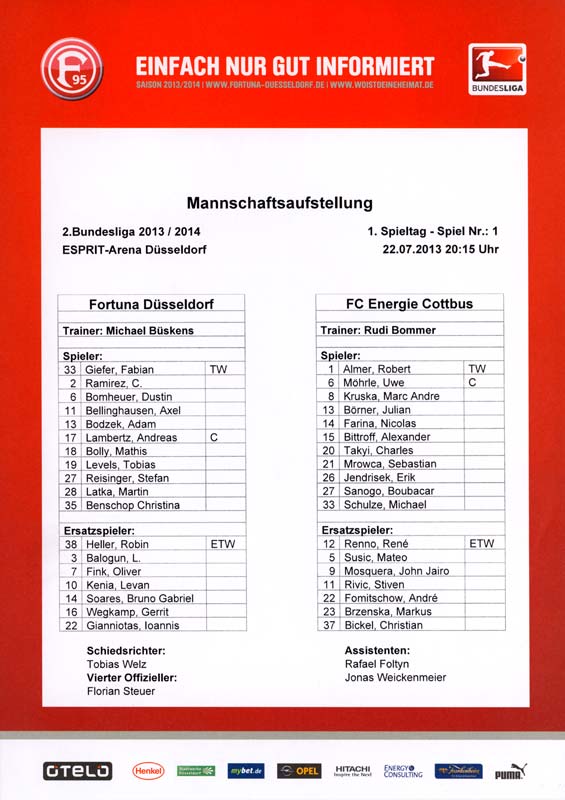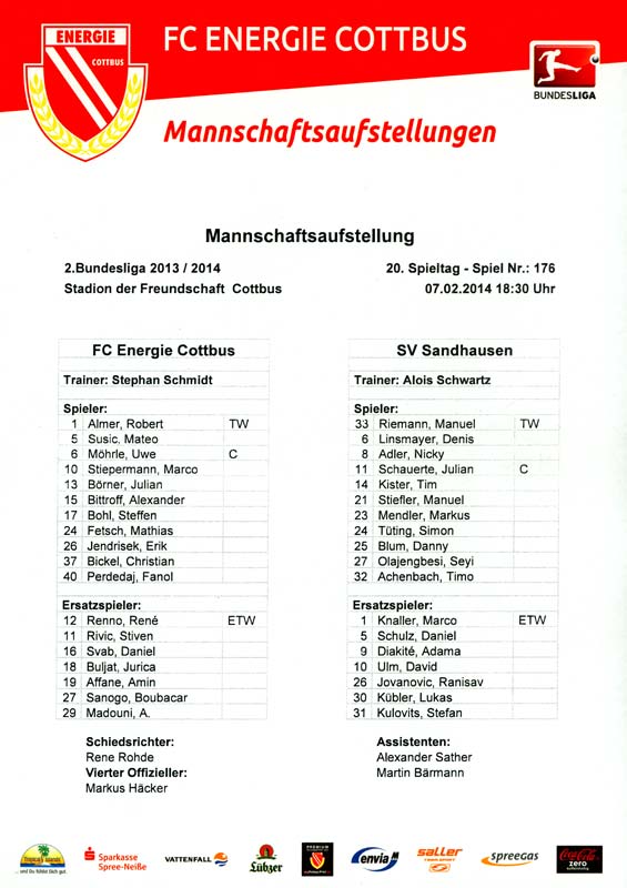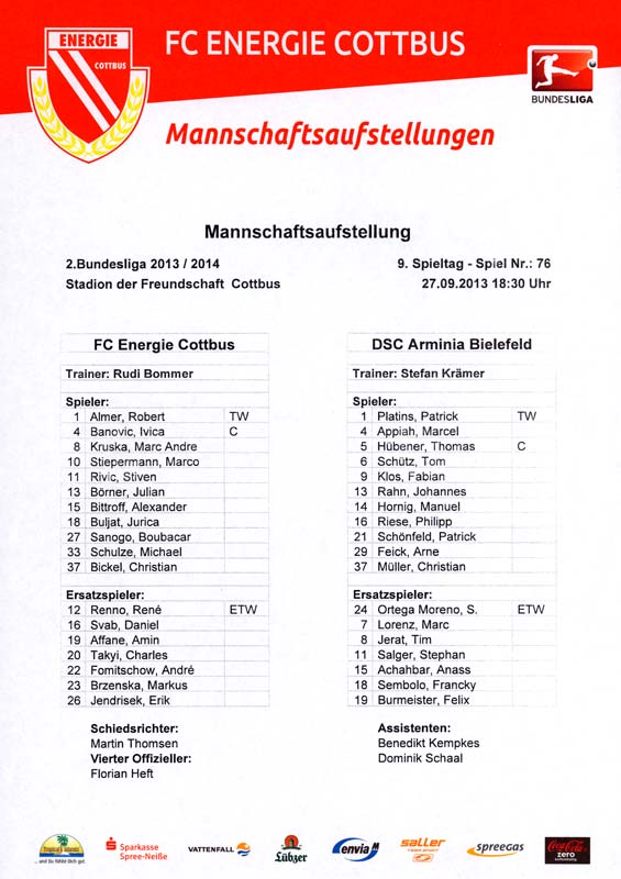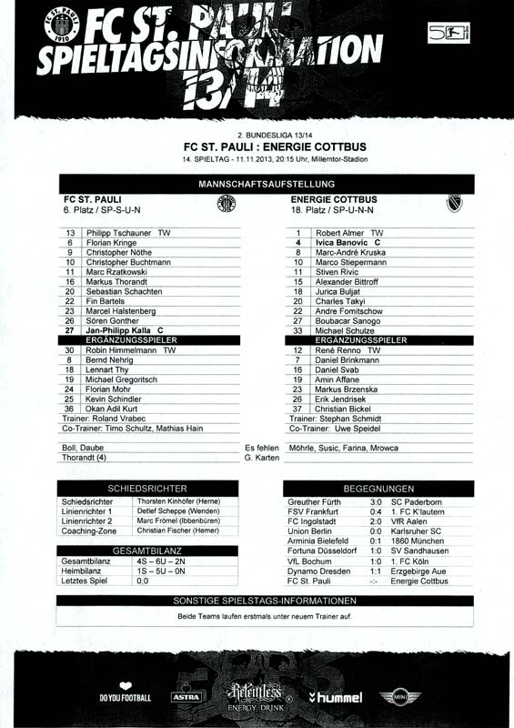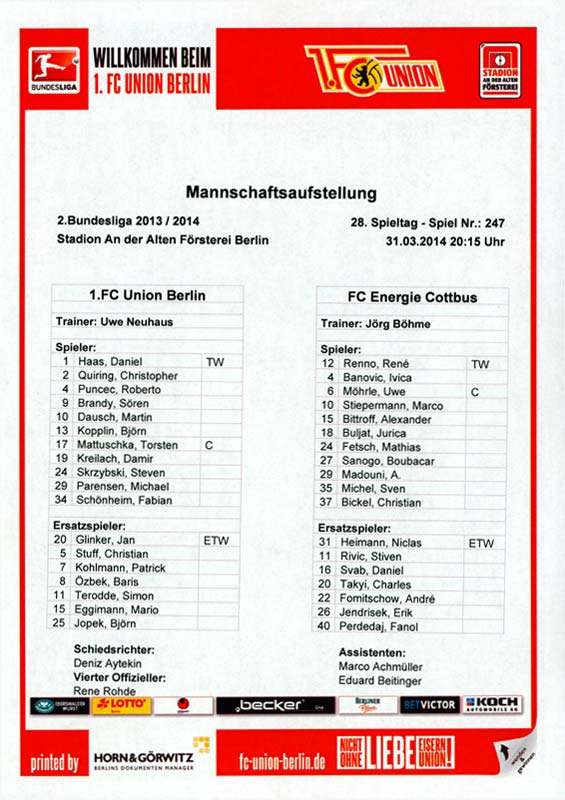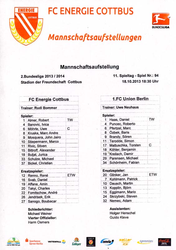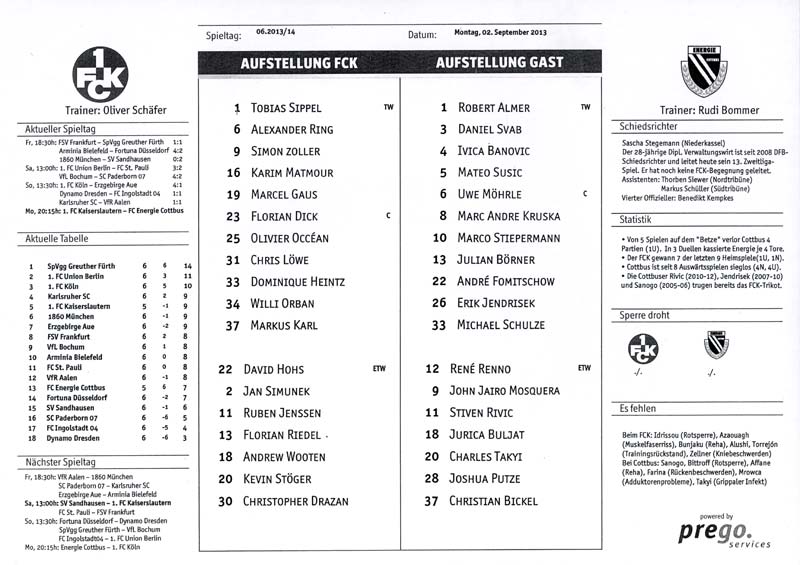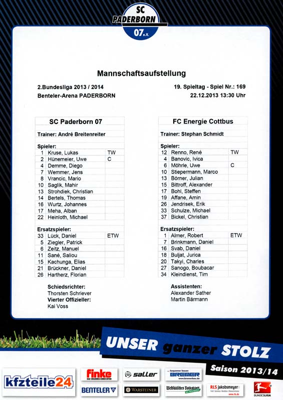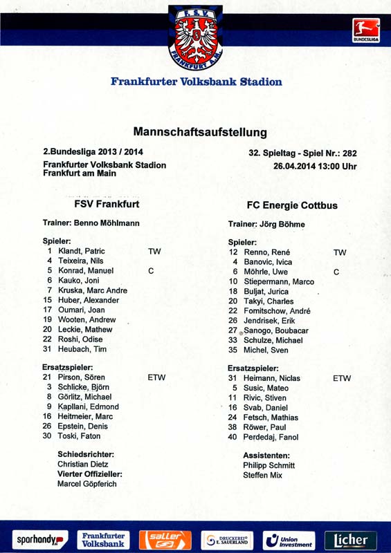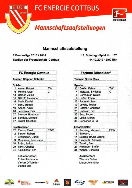 Presseinfos der 1. Mannschaft 12.07.2013, Dundee United FC (H)22.07.2013, TSV Fortuna Düsseldorf (A)28.07.2013, SC Paderborn 07 (H)03.08.2013, 1. FC Magdeburg (A)11.08.2013, SV Sandhausen 1916 (A)18.08.2013, VfR Aalen 1921 (H)23.08.2013, FC Erzgebirge Aue (A)02.09.2013, 1. FC Kaiserslautern (A)16.09.2013, 1. FC Köln (H)20.09.2013, Karlsruher SC (A)24.09.2013, TSG 1899 Hoffenheim (A)27.09.2013, DSC Arminia Bielefeld (H)06.10.2013, TSV 1860 München (A)11.10.2013, FSV Glückauf Brieske-Senftenberg (A)18.10.2013, 1. FC Union Berlin (H)27.10.2013, SG Dynamo Dresden (A)01.11.2013, VfL Bochum 1848 (H)11.11.2013, FC St. Pauli 1910 (A)22.11.2013, FSV Frankfurt 1899 (H)01.12.2013, SpVgg Greuther Fürth 1903 (A)08.12.2013, FC Ingolstadt 04 (H)14.12.2013, TSV Fortuna Düsseldorf (H)22.12.2013, SC Paderborn 07 (A)09.01.2014, SV Wacker 09 Cottbus-Ströbitz (H)15.01.2014, Berliner AK 07 (H)31.01.2014, MKS Miedź Legnica (H)07.02.2014, SV Sandhausen 1916 (H)16.02.2014, VfR Aalen 1921 (A)21.02.2014, FC Erzgebirge Aue (H)28.02.2014, 1. FC Kaiserslautern (H)15.03.2014, Karlsruher SC (H)23.03.2014, DSC Arminia Bielefeld (A)26.03.2014, TSV 1860 München (H)31.03.2014, 1. FC Union Berlin (A)04.04.2014, SG Dynamo Dresden (H)13.04.2014, VfL Bochum 1848 (A)17.04.2014, FC St. Pauli 1910 (H)26.04.2014, FSV Frankfurt 1899 (A)04.05.2014, SpVgg Greuther Fürth 1903 (H)11.05.2014, FC Ingolstadt 04 (A)