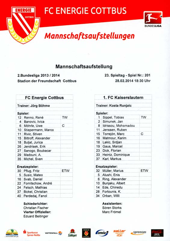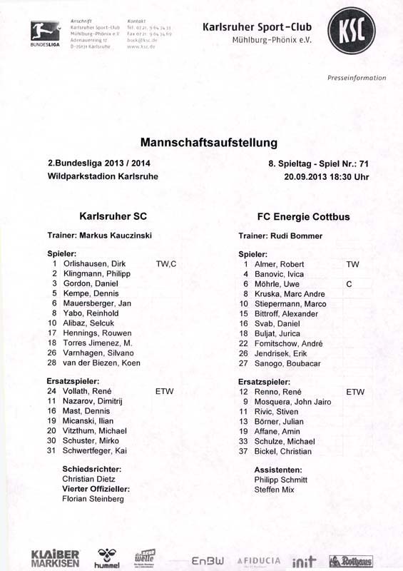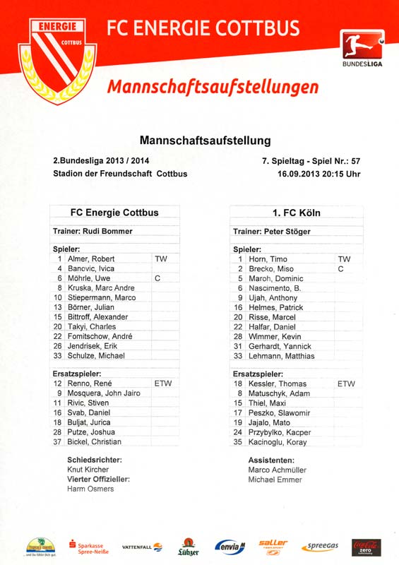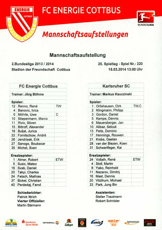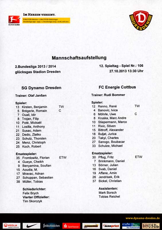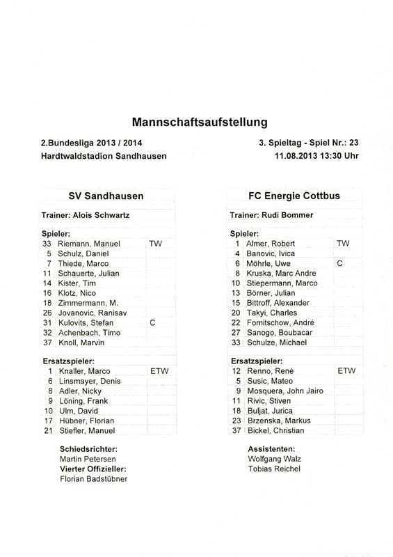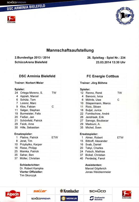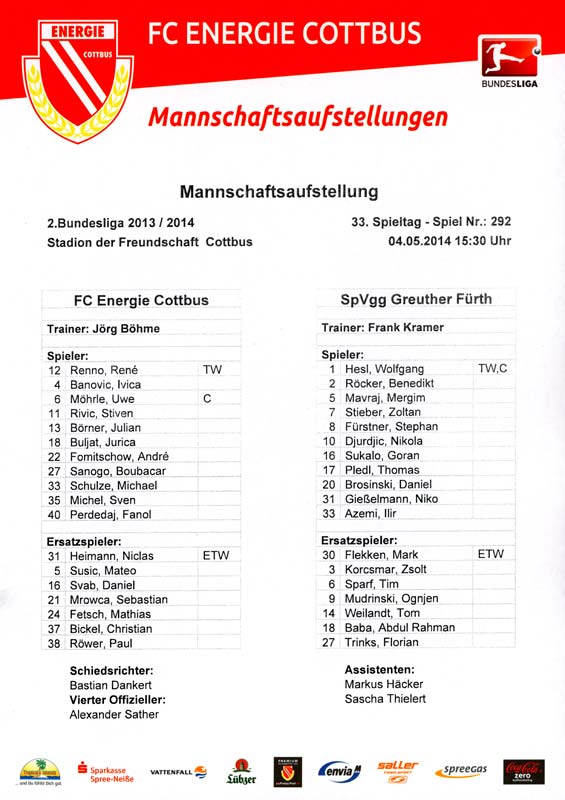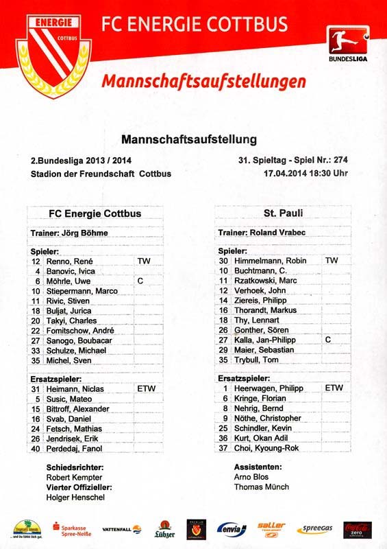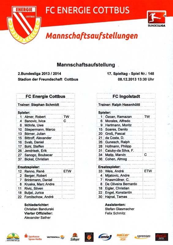 Presseinfos der 1. Mannschaft 12.07.2013, Dundee United FC (H)22.07.2013, TSV Fortuna Düsseldorf (A)28.07.2013, SC Paderborn 07 (H)03.08.2013, 1. FC Magdeburg (A)11.08.2013, SV Sandhausen 1916 (A)18.08.2013, VfR Aalen 1921 (H)23.08.2013, FC Erzgebirge Aue (A)02.09.2013, 1. FC Kaiserslautern (A)16.09.2013, 1. FC Köln (H)20.09.2013, Karlsruher SC (A)24.09.2013, TSG 1899 Hoffenheim (A)27.09.2013, DSC Arminia Bielefeld (H)06.10.2013, TSV 1860 München (A)11.10.2013, FSV Glückauf Brieske-Senftenberg (A)18.10.2013, 1. FC Union Berlin (H)27.10.2013, SG Dynamo Dresden (A)01.11.2013, VfL Bochum 1848 (H)11.11.2013, FC St. Pauli 1910 (A)22.11.2013, FSV Frankfurt 1899 (H)01.12.2013, SpVgg Greuther Fürth 1903 (A)08.12.2013, FC Ingolstadt 04 (H)14.12.2013, TSV Fortuna Düsseldorf (H)22.12.2013, SC Paderborn 07 (A)09.01.2014, SV Wacker 09 Cottbus-Ströbitz (H)15.01.2014, Berliner AK 07 (H)31.01.2014, MKS Miedź Legnica (H)07.02.2014, SV Sandhausen 1916 (H)16.02.2014, VfR Aalen 1921 (A)21.02.2014, FC Erzgebirge Aue (H)28.02.2014, 1. FC Kaiserslautern (H)15.03.2014, Karlsruher SC (H)23.03.2014, DSC Arminia Bielefeld (A)26.03.2014, TSV 1860 München (H)31.03.2014, 1. FC Union Berlin (A)04.04.2014, SG Dynamo Dresden (H)13.04.2014, VfL Bochum 1848 (A)17.04.2014, FC St. Pauli 1910 (H)26.04.2014, FSV Frankfurt 1899 (A)04.05.2014, SpVgg Greuther Fürth 1903 (H)11.05.2014, FC Ingolstadt 04 (A)