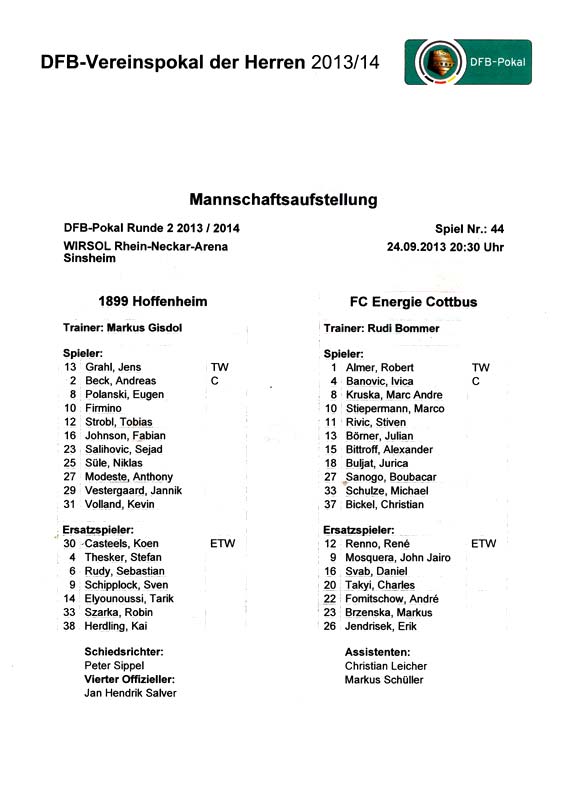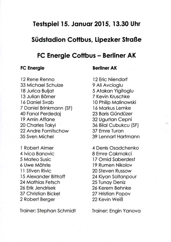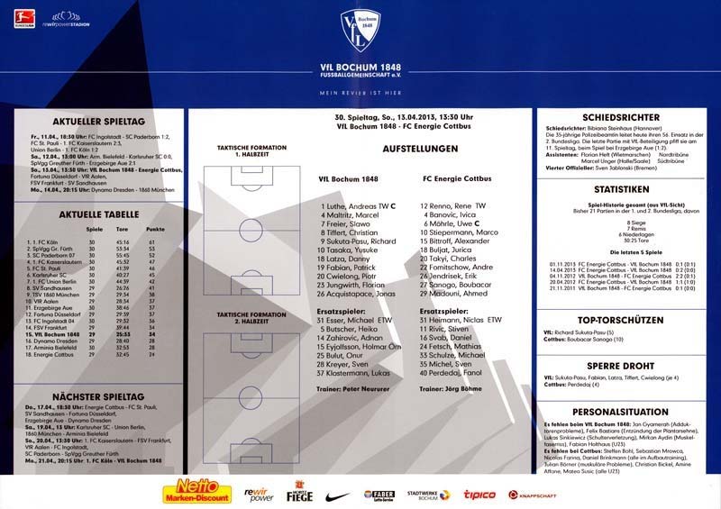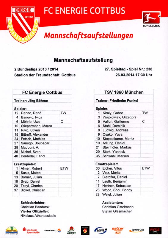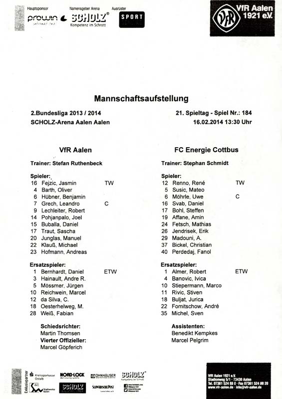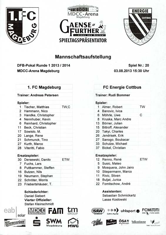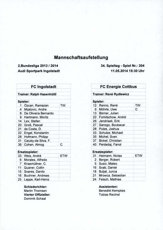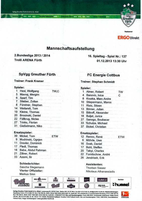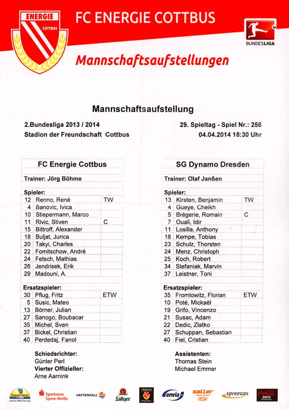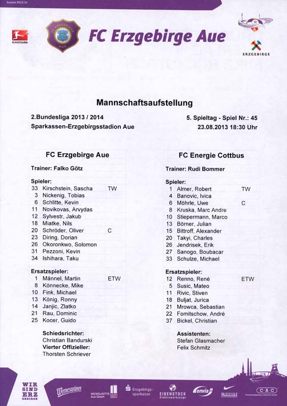 Presseinfos der 1. Mannschaft 12.07.2013, Dundee United FC (H)22.07.2013, TSV Fortuna Düsseldorf (A)28.07.2013, SC Paderborn 07 (H)03.08.2013, 1. FC Magdeburg (A)11.08.2013, SV Sandhausen 1916 (A)18.08.2013, VfR Aalen 1921 (H)23.08.2013, FC Erzgebirge Aue (A)02.09.2013, 1. FC Kaiserslautern (A)16.09.2013, 1. FC Köln (H)20.09.2013, Karlsruher SC (A)24.09.2013, TSG 1899 Hoffenheim (A)27.09.2013, DSC Arminia Bielefeld (H)06.10.2013, TSV 1860 München (A)11.10.2013, FSV Glückauf Brieske-Senftenberg (A)18.10.2013, 1. FC Union Berlin (H)27.10.2013, SG Dynamo Dresden (A)01.11.2013, VfL Bochum 1848 (H)11.11.2013, FC St. Pauli 1910 (A)22.11.2013, FSV Frankfurt 1899 (H)01.12.2013, SpVgg Greuther Fürth 1903 (A)08.12.2013, FC Ingolstadt 04 (H)14.12.2013, TSV Fortuna Düsseldorf (H)22.12.2013, SC Paderborn 07 (A)09.01.2014, SV Wacker 09 Cottbus-Ströbitz (H)15.01.2014, Berliner AK 07 (H)31.01.2014, MKS Miedź Legnica (H)07.02.2014, SV Sandhausen 1916 (H)16.02.2014, VfR Aalen 1921 (A)21.02.2014, FC Erzgebirge Aue (H)28.02.2014, 1. FC Kaiserslautern (H)15.03.2014, Karlsruher SC (H)23.03.2014, DSC Arminia Bielefeld (A)26.03.2014, TSV 1860 München (H)31.03.2014, 1. FC Union Berlin (A)04.04.2014, SG Dynamo Dresden (H)13.04.2014, VfL Bochum 1848 (A)17.04.2014, FC St. Pauli 1910 (H)26.04.2014, FSV Frankfurt 1899 (A)04.05.2014, SpVgg Greuther Fürth 1903 (H)11.05.2014, FC Ingolstadt 04 (A)