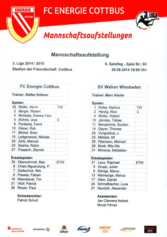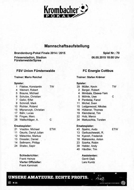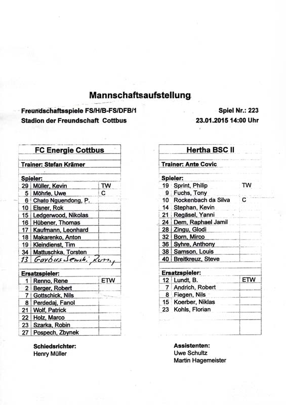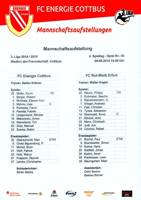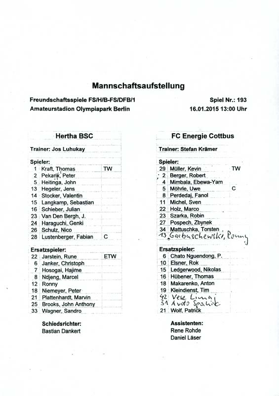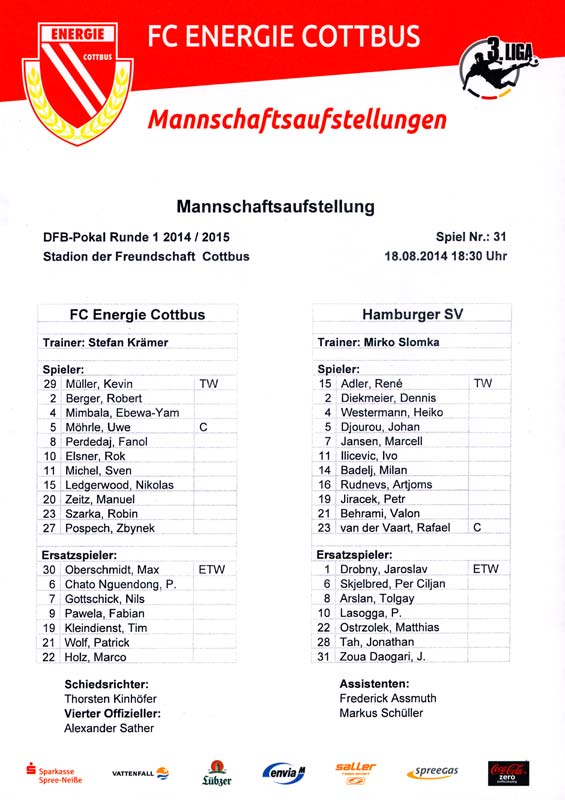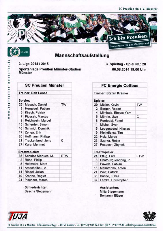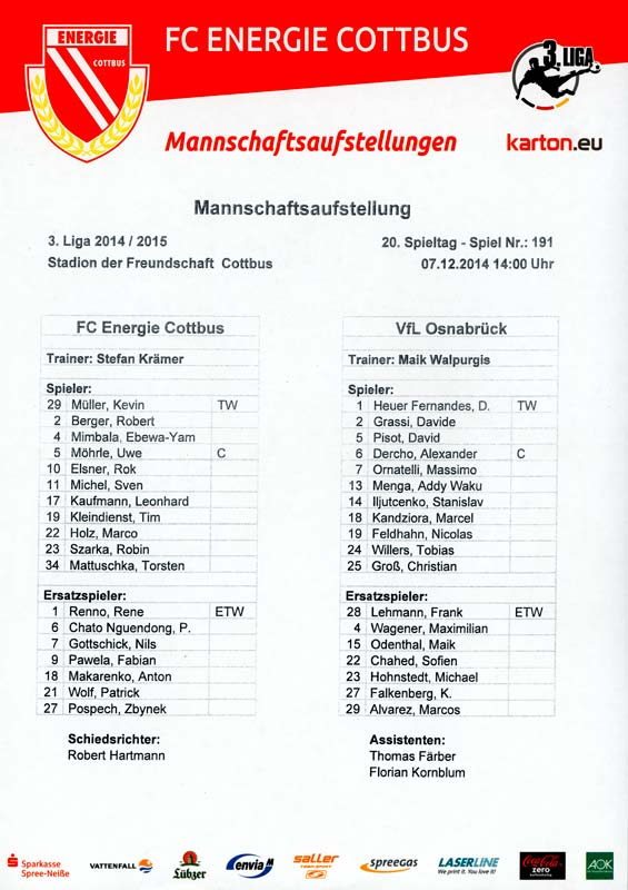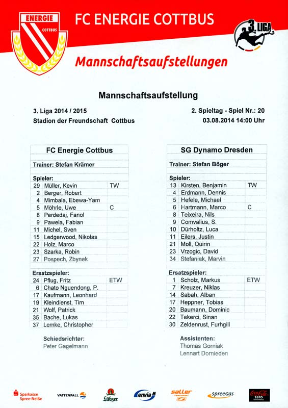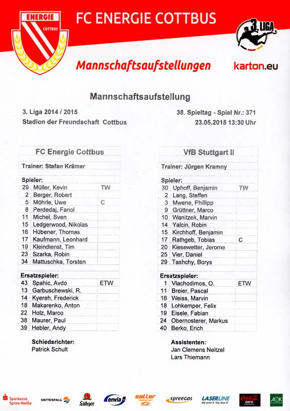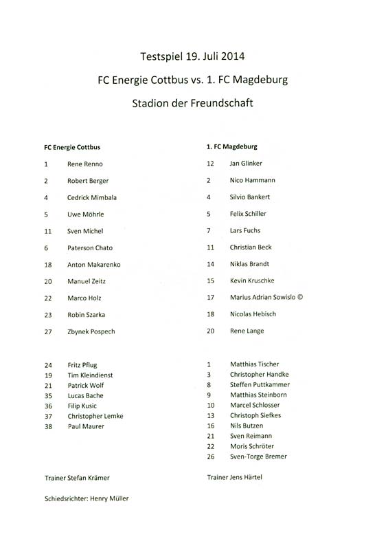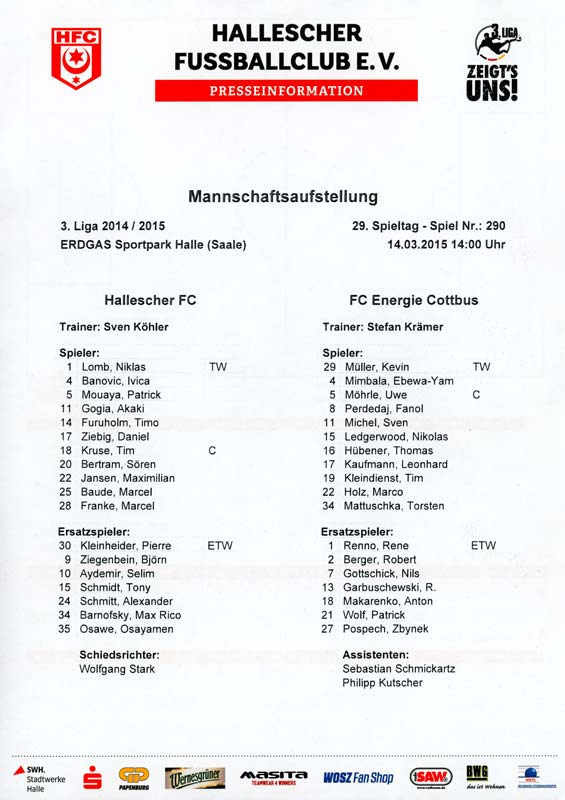 Presseinfos der 1. Mannschaft 02.07.2014, BSV Guben-Nord (A)06.07.2014, FC Lausitz Hoyerswerda (A)19.07.2014, 1. FC Magdeburg (H)26.07.2014, VfL Osnabrück 1899 (A)03.08.2014, SG Dynamo Dresden (H)06.08.2014, SC Preußen 06 Münster (A)09.08.2014, FC Rot-Weiß Erfurt (H)18.08.2014, Hamburger SV (H)23.08.2014, Kieler S.V. Holstein 1900 (A)26.08.2014, SV Wehen Wiesbaden 1926 (H)30.08.2014, SSV Jahn Regensburg (A)13.09.2014, 1. FSV Mainz 05 II (A)16.09.2014, SG Sonnenhof Großaspach (H)20.09.2014, Hallescher FC (H)23.09.2014, Chemnitzer FC (A)28.09.2014, DSC Arminia Bielefeld (H)04.10.2014, S.C. Fortuna Köln (A)12.10.2014, Ludwigsfelder FC (A)18.10.2014, MSV Duisburg (H)25.10.2014, SV Stuttgarter Kickers (A)01.11.2014, SpVgg Unterhaching 1925 (H)07.11.2014, BV Borussia 09 Dortmund II (A)15.11.2014, SV Grün-Weiß Brieselang (A)22.11.2014, F.C. Hansa Rostock (H)28.11.2014, VfB Stuttgart 1893 II (A)07.12.2014, VfL Osnabrück 1899 (H)13.12.2014, SG Dynamo Dresden (A)20.12.2014, SC Preußen 06 Münster (H)16.01.2015, Hertha BSC (A)23.01.2015, Hertha BSC II (H)31.01.2015, FC Rot-Weiß Erfurt (A)07.02.2015, Kieler S.V. Holstein 1900 (H)14.02.2015, SV Wehen Wiesbaden 1926 (A)21.02.2015, SSV Jahn Regensburg (H)28.02.2015, SG Sonnenhof Großaspach (A)07.03.2015, 1. FSV Mainz 05 II (H)14.03.2015, Hallescher FC (A)21.03.2015, Chemnitzer FC (H)11.04.2015, S.C. Fortuna Köln (H)15.04.2015, SV Babelsberg 03 (A)25.04.2015, SV Stuttgarter Kickers (H)02.05.2015, SpVgg Unterhaching 1925 (A)06.05.2015, FSV Union Fürstenwalde (A)16.05.2015, F.C. Hansa Rostock (A)23.05.2015, VfB Stuttgart 1893 II (H)